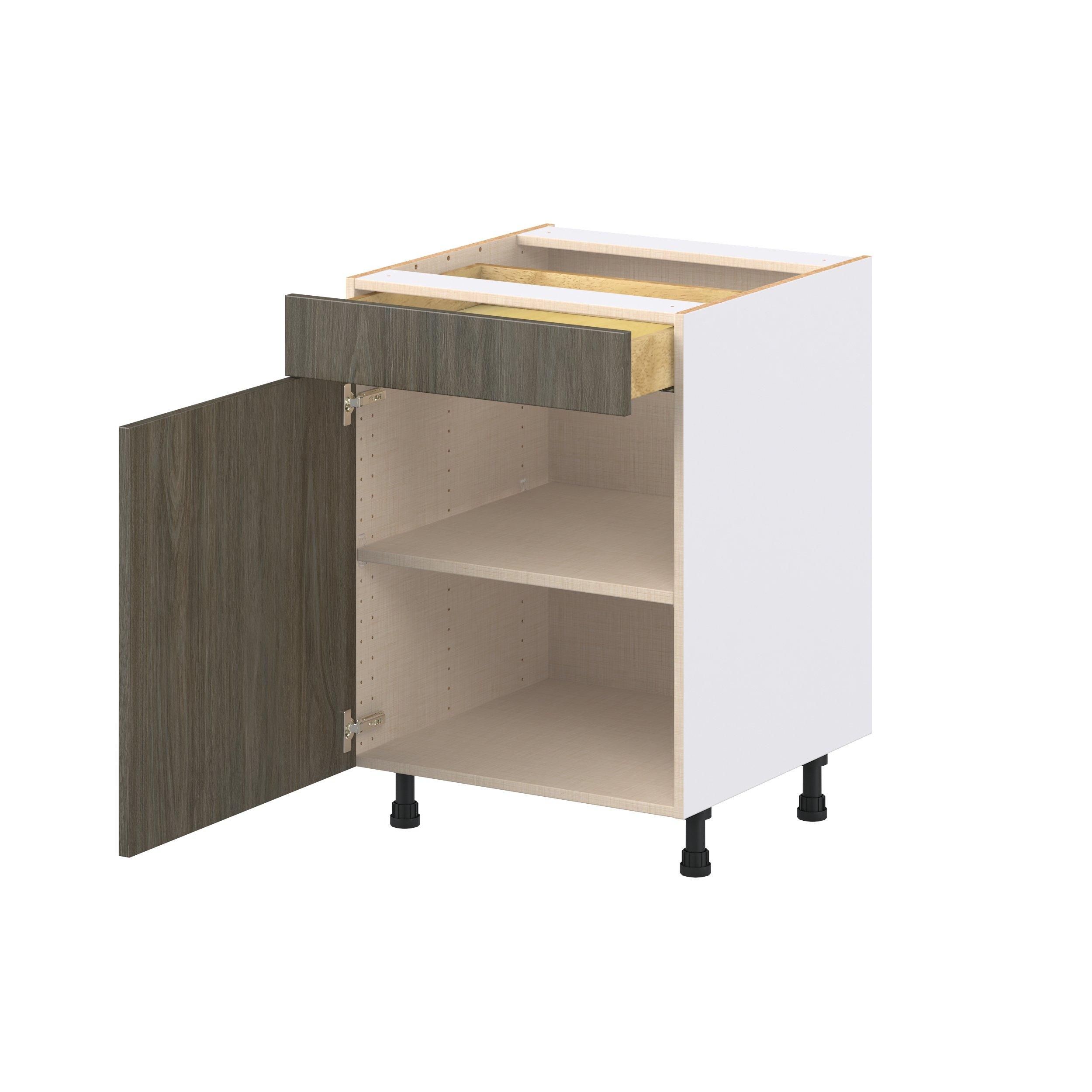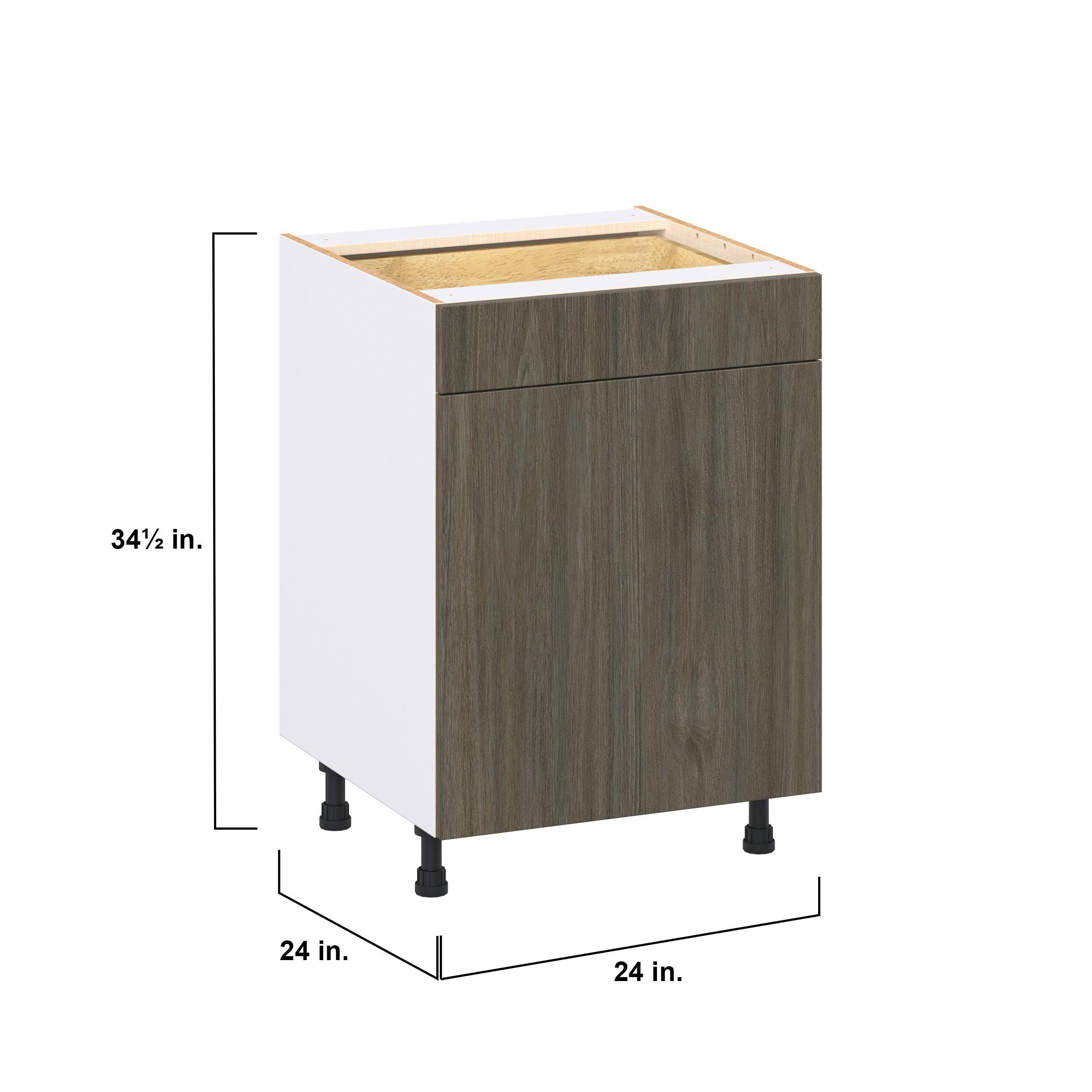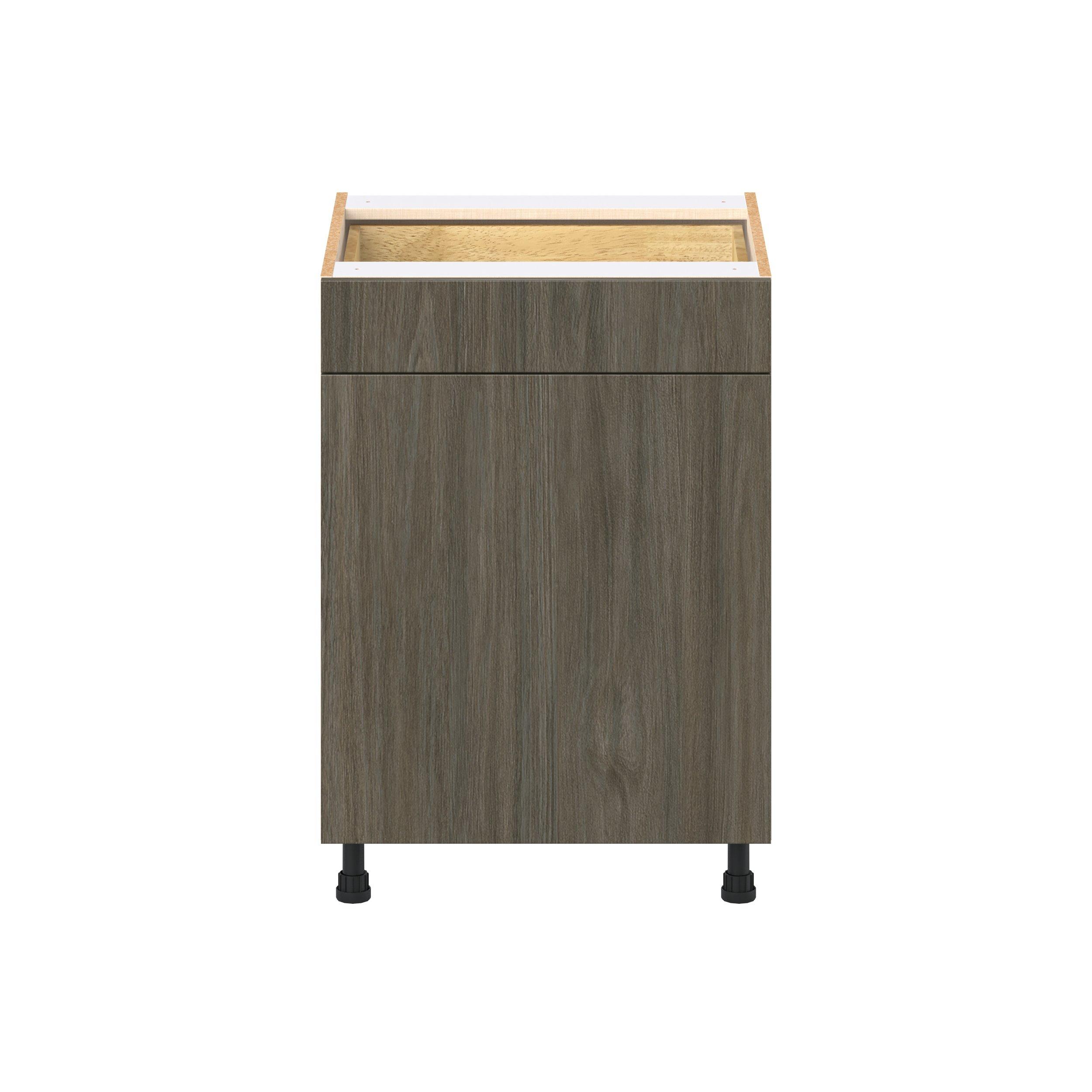 Elevate your project with the contemporary charm of Glenwood slab-style cabinets. Available in desert Mojavi oak and rich burnt walnut finishes, this collection captures the warmth and beauty of natural wood with the practicality of textured melamine. Crafted from one-piece MDF Studio Design Collection Glenwood 24 in. Burnt Walnut Door and Drawer Base Cabinet is designed to resist hairline cracks while the easy-to-clean finish stands up to stains and moisture. Featuring 5-piece doors and dovetail drawer joints, these cabinets offer durability and elegance. This collection combines style with everyday storage solutions.