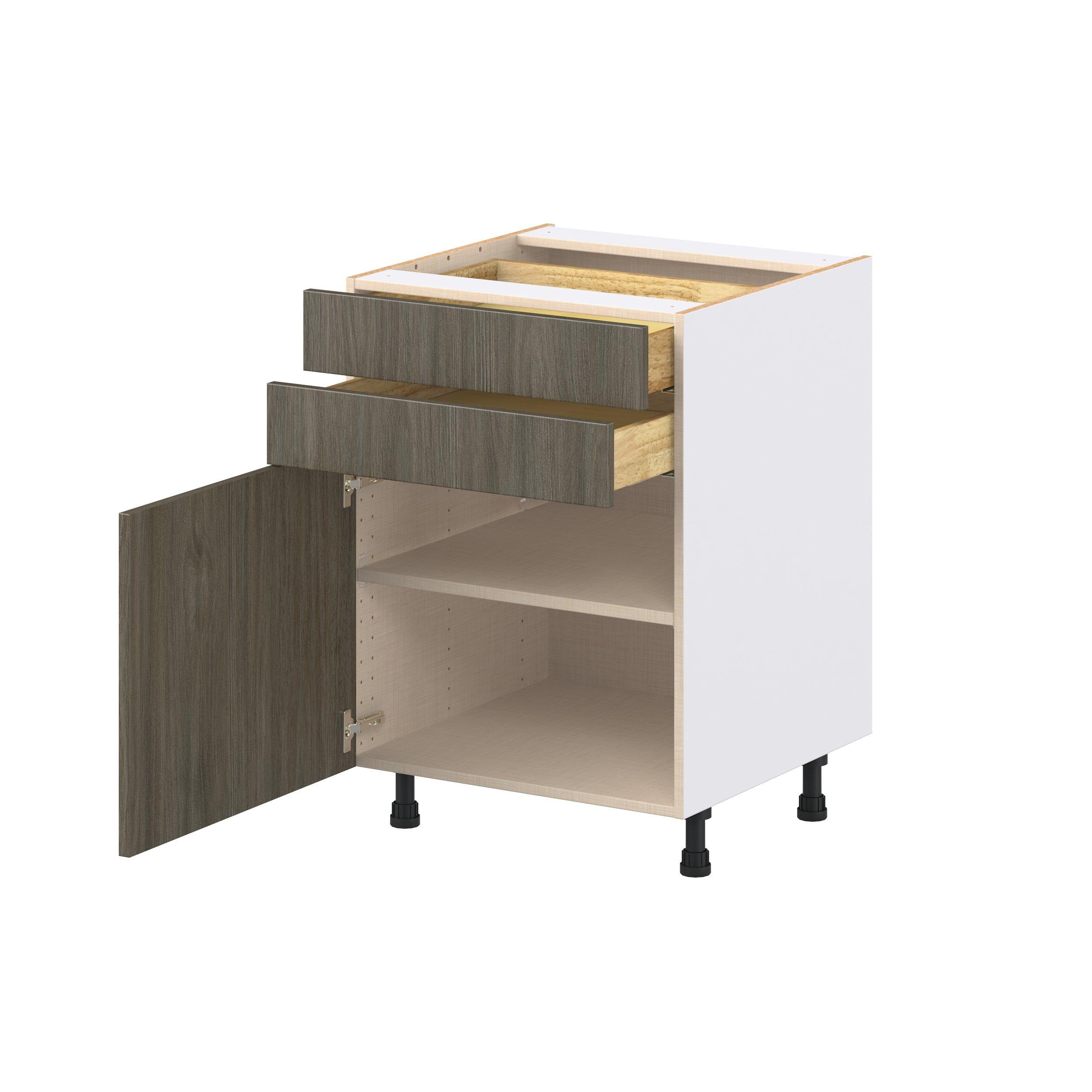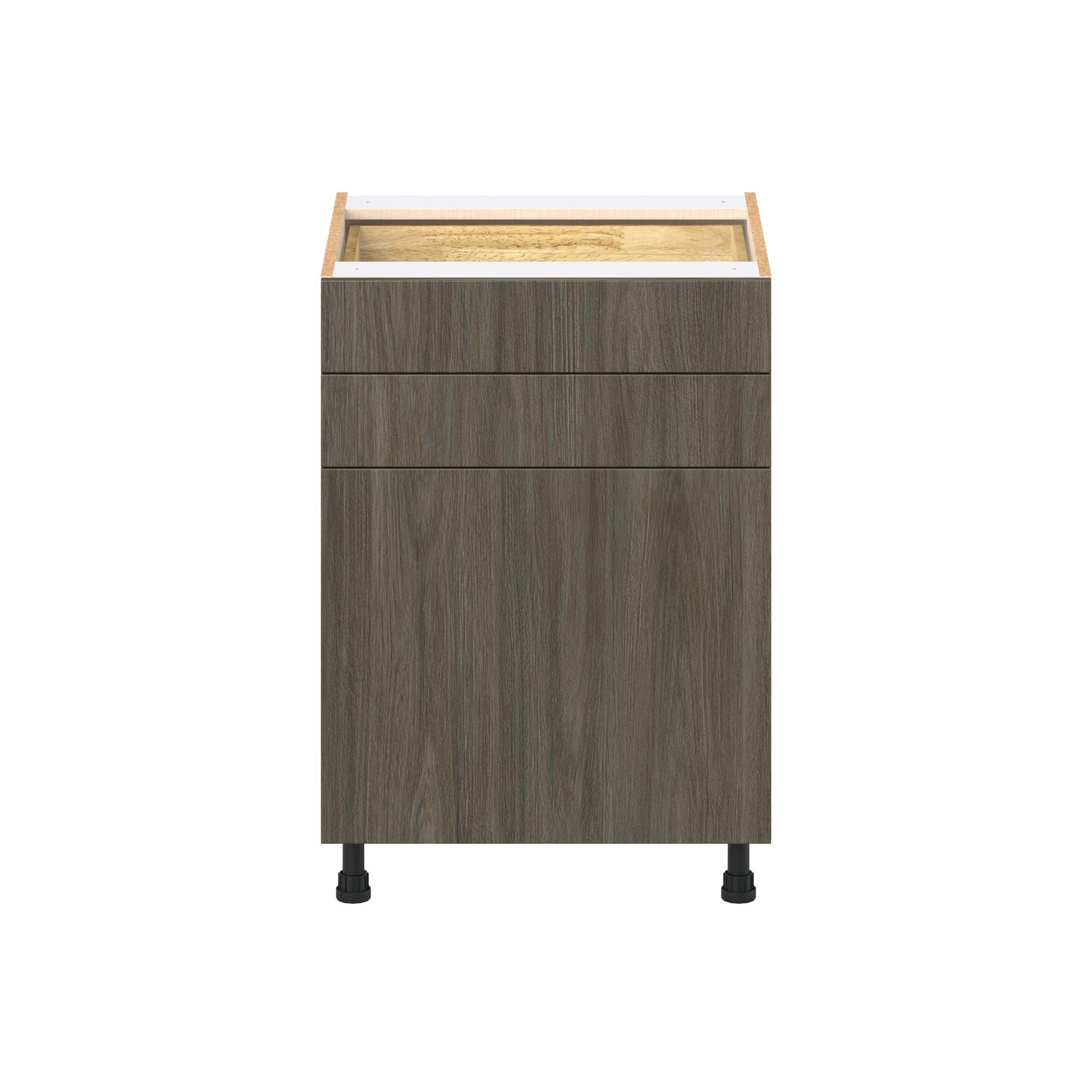 Elevate your project with the contemporary charm of Glenwood slab-style cabinets. Available in desert Mojavi oak and rich burnt walnut finishes, this collection captures the warmth and beauty of natural wood with the practicality of textured melamine. Crafted from one-piece MDF Studio Design Collection Glenwood 24 in. Burnt Walnut Door and Drawer Base Cabinet is designed to resist hairline cracks while the easy-to-clean finish stands up to stains and moisture. Featuring 5-piece doors and dovetail drawer joints, these cabinets offer durability and elegance. This collection combines style with everyday storage solutions.