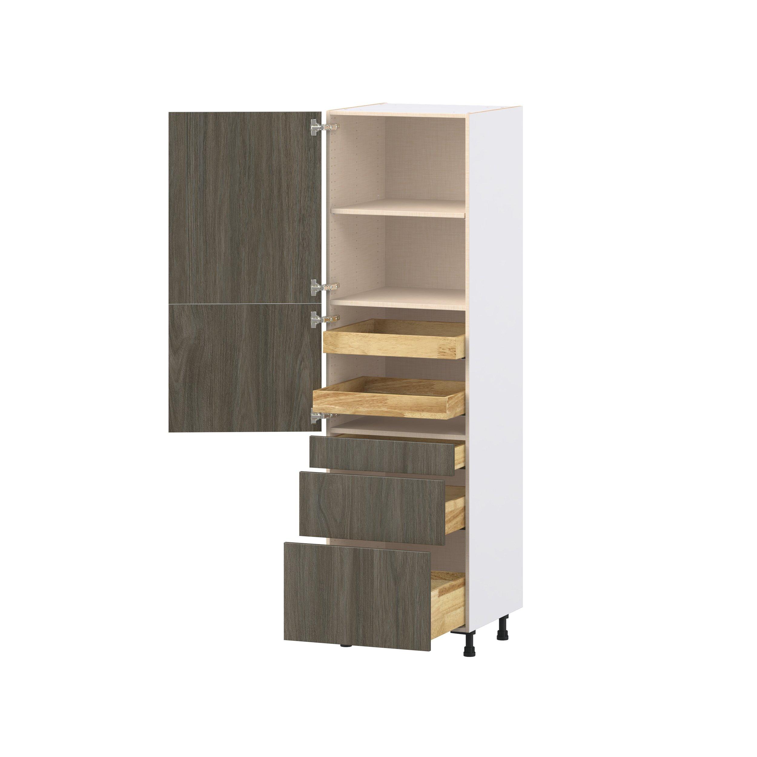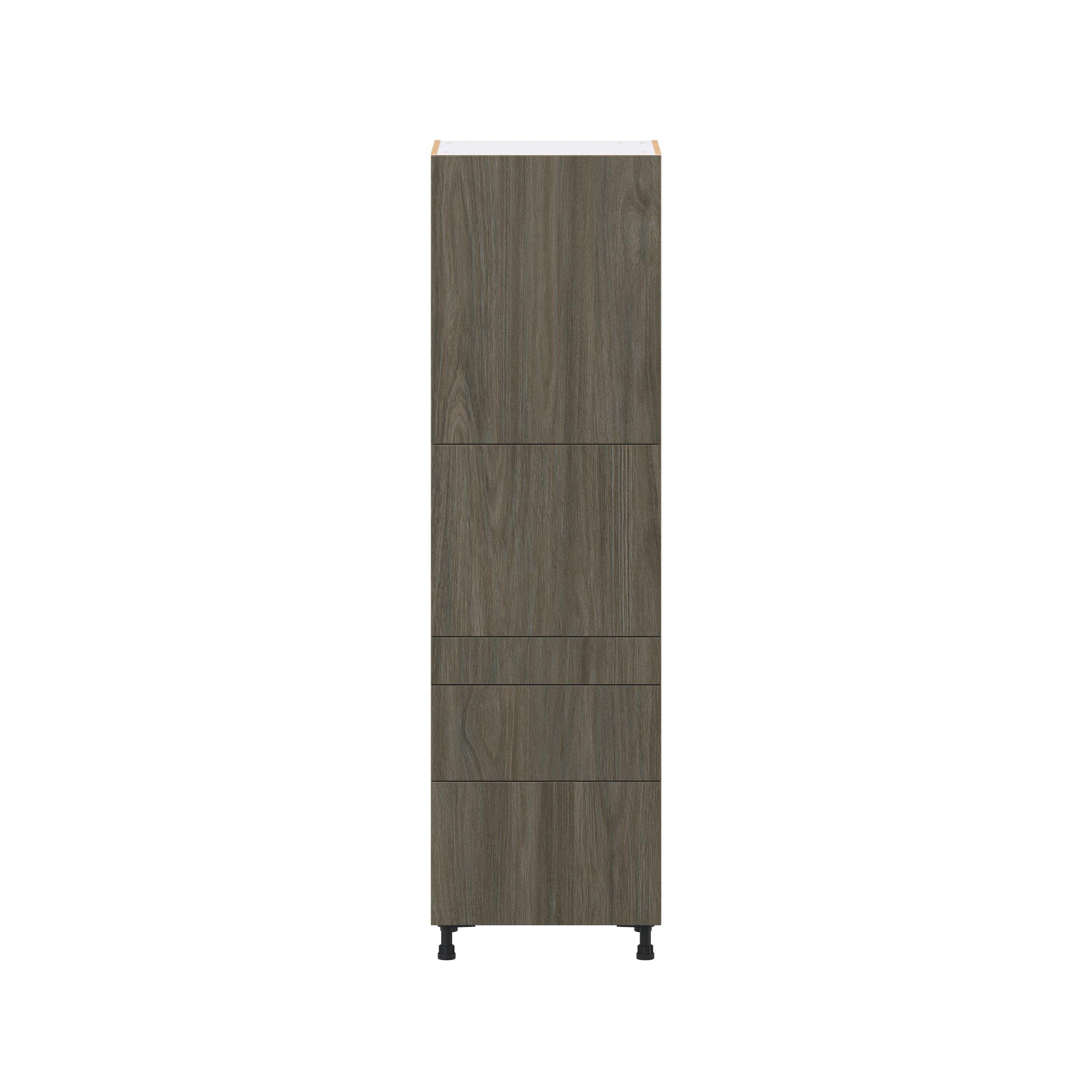 Elevate your project with the contemporary charm of Glenwood slab-style cabinets. Available in desert Mojavi oak and rich burnt walnut finishes, this collection captures the warmth and beauty of natural wood with the practicality of textured melamine. Crafted from one-piece MDF Studio Design Collection Glenwood 24 in. Burnt Walnut Door and Drawer Pantry Cabinet with Inner Pull-Out is designed to resist hairline cracks while the easy-to-clean finish stands up to stains and moisture. Featuring 5-piece doors and dovetail drawer joints, these cabinets offer durability and elegance. This collection combines style with everyday storage solutions.