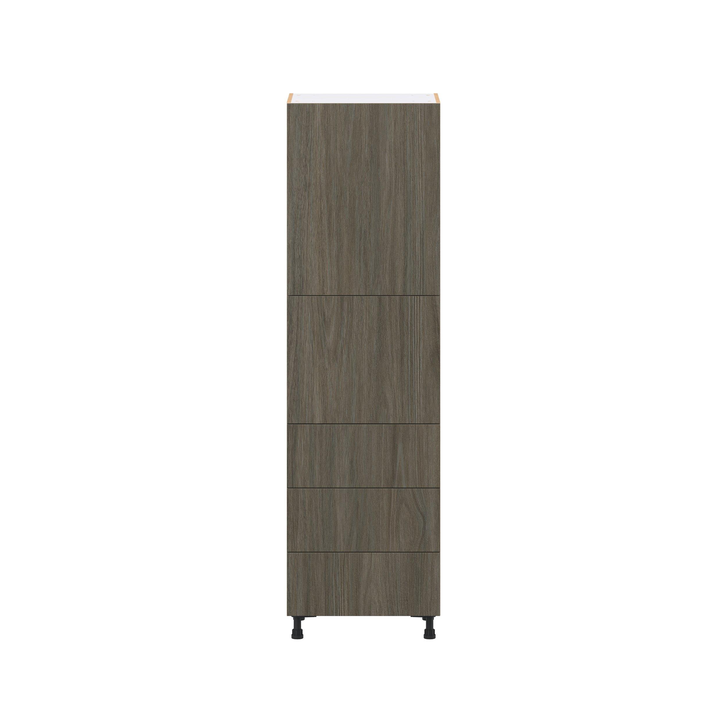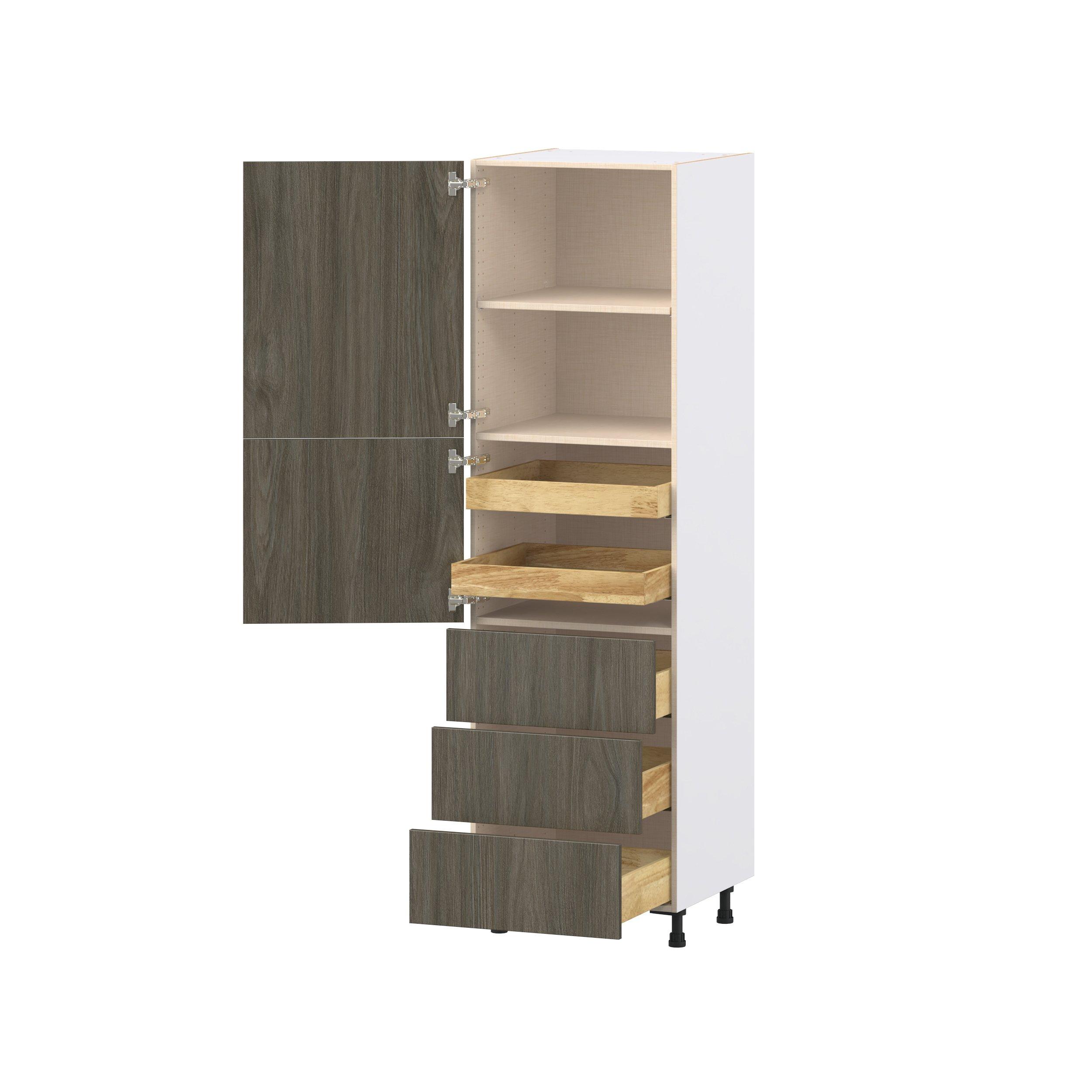 Elevate your project with the contemporary charm of Glenwood slab-style cabinets. Available in desert Mojavi oak and rich burnt walnut finishes, this collection captures the warmth and beauty of natural wood with the practicality of textured melamine. Crafted from one-piece MDF Studio Design Collection Glenwood 24 in. Burnt Walnut Door and Drawer Pantry Cabinet with Inner Pull-Out is designed to resist hairline cracks while the easy-to-clean finish stands up to stains and moisture. Featuring 5-piece doors and dovetail drawer joints, these cabinets offer durability and elegance. This collection combines style with everyday storage solutions.