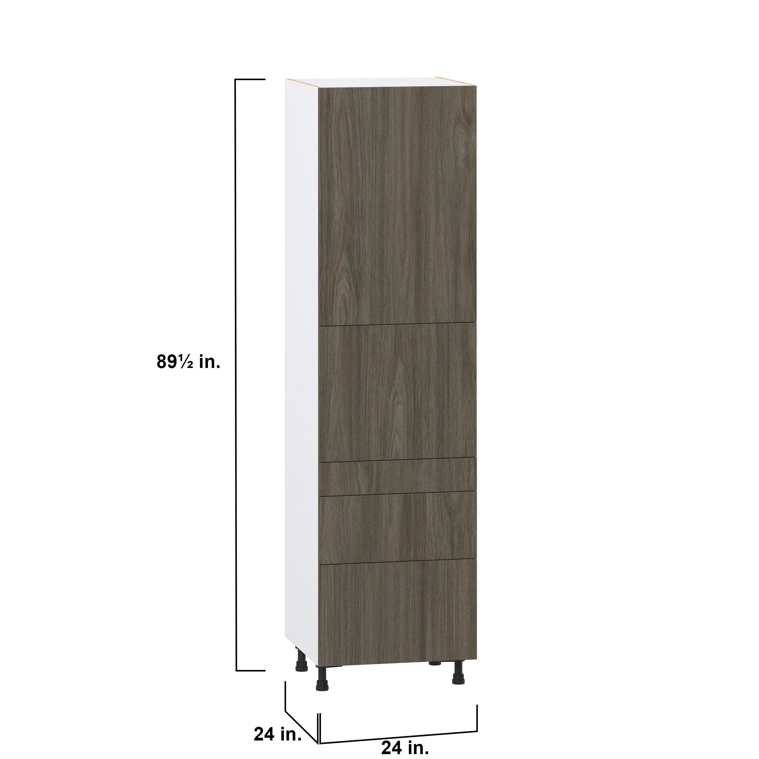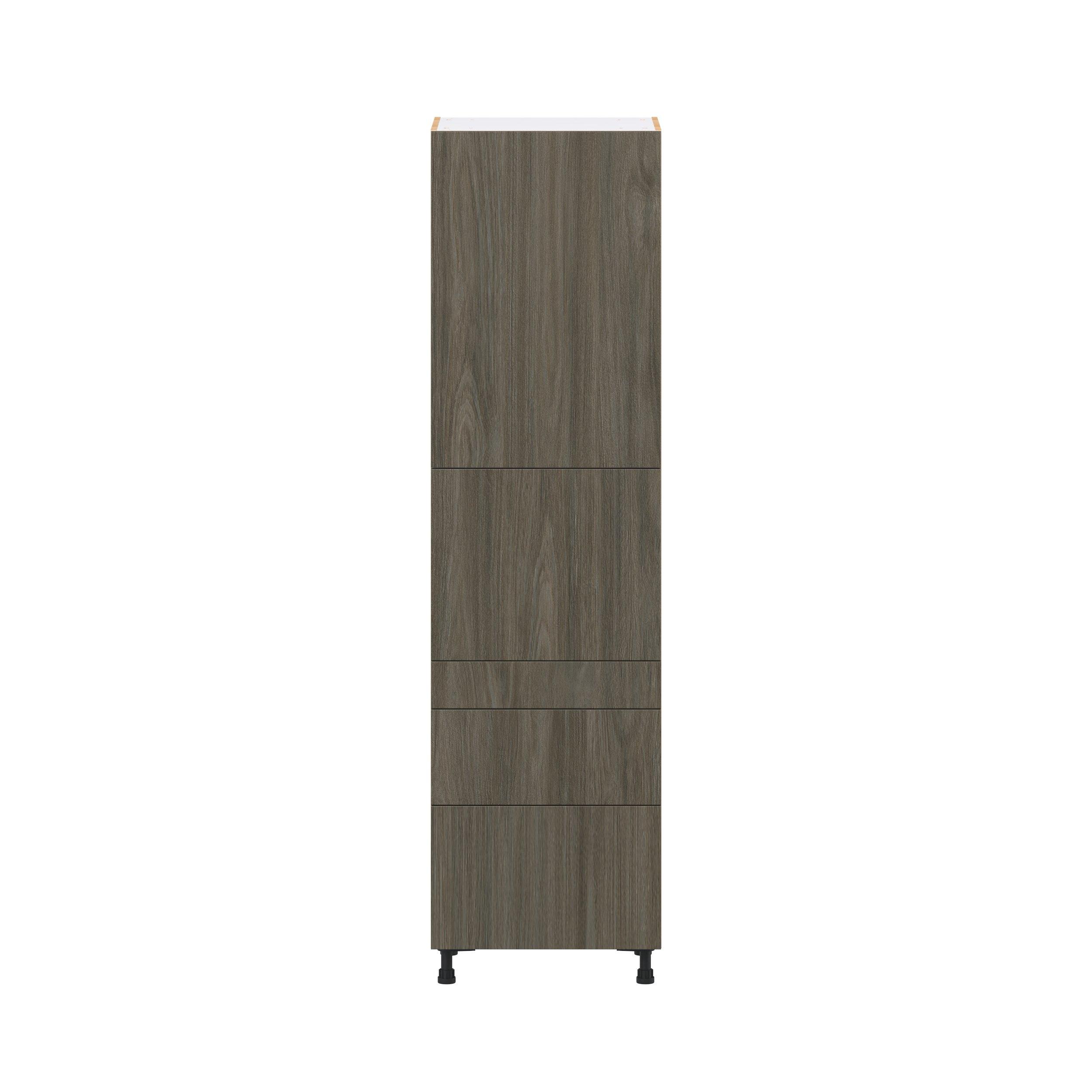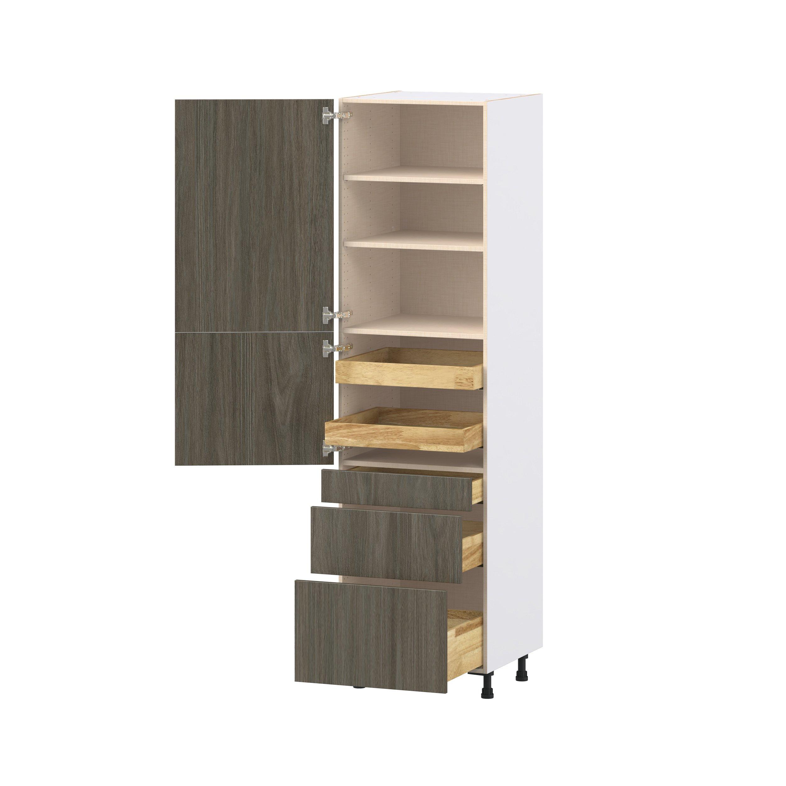 Elevate your project with the contemporary charm of Glenwood slab-style cabinets. Available in desert Mojavi oak and rich burnt walnut finishes, this collection captures the warmth and beauty of natural wood with the practicality of textured melamine. Crafted from one-piece MDF Studio Design Collection Glenwood 24 in. Burnt Walnut Door and Drawer Pantry Cabinet with Inner Pull-Out is designed to resist hairline cracks while the easy-to-clean finish stands up to stains and moisture. Featuring 5-piece doors and dovetail drawer joints, these cabinets offer durability and elegance. This collection combines style with everyday storage solutions.