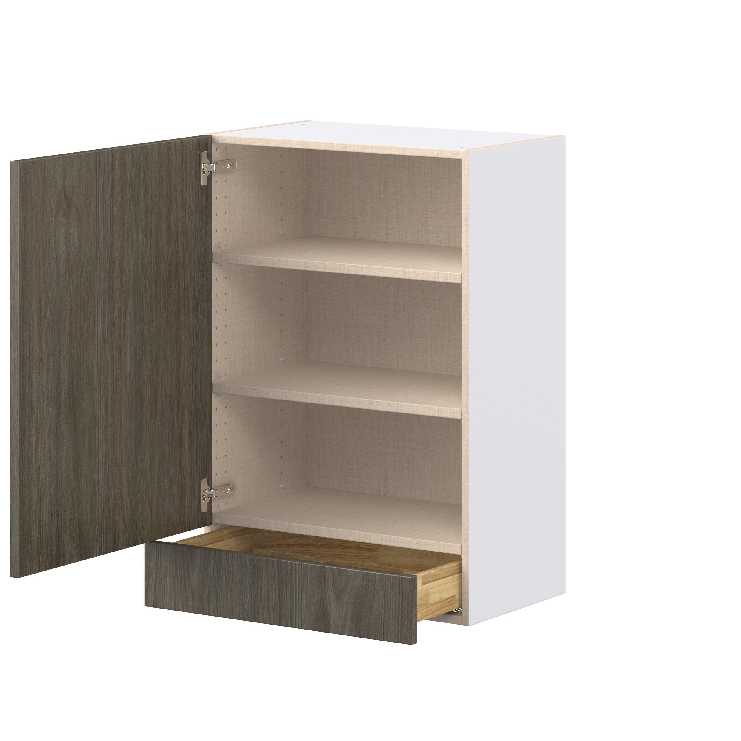 Elevate your project with the contemporary charm of Glenwood slab-style cabinets. Available in desert Mojavi oak and rich burnt walnut finishes, this collection captures the warmth and beauty of natural wood with the practicality of textured melamine. Crafted from one-piece MDF Studio Design Collection Glenwood 24 in. Burnt Walnut Door and Drawer Wall Cabinet is designed to resist hairline cracks while the easy-to-clean finish stands up to stains and moisture. Featuring 5-piece doors and dovetail drawer joints, these cabinets offer durability and elegance. This collection combines style with everyday storage solutions.
