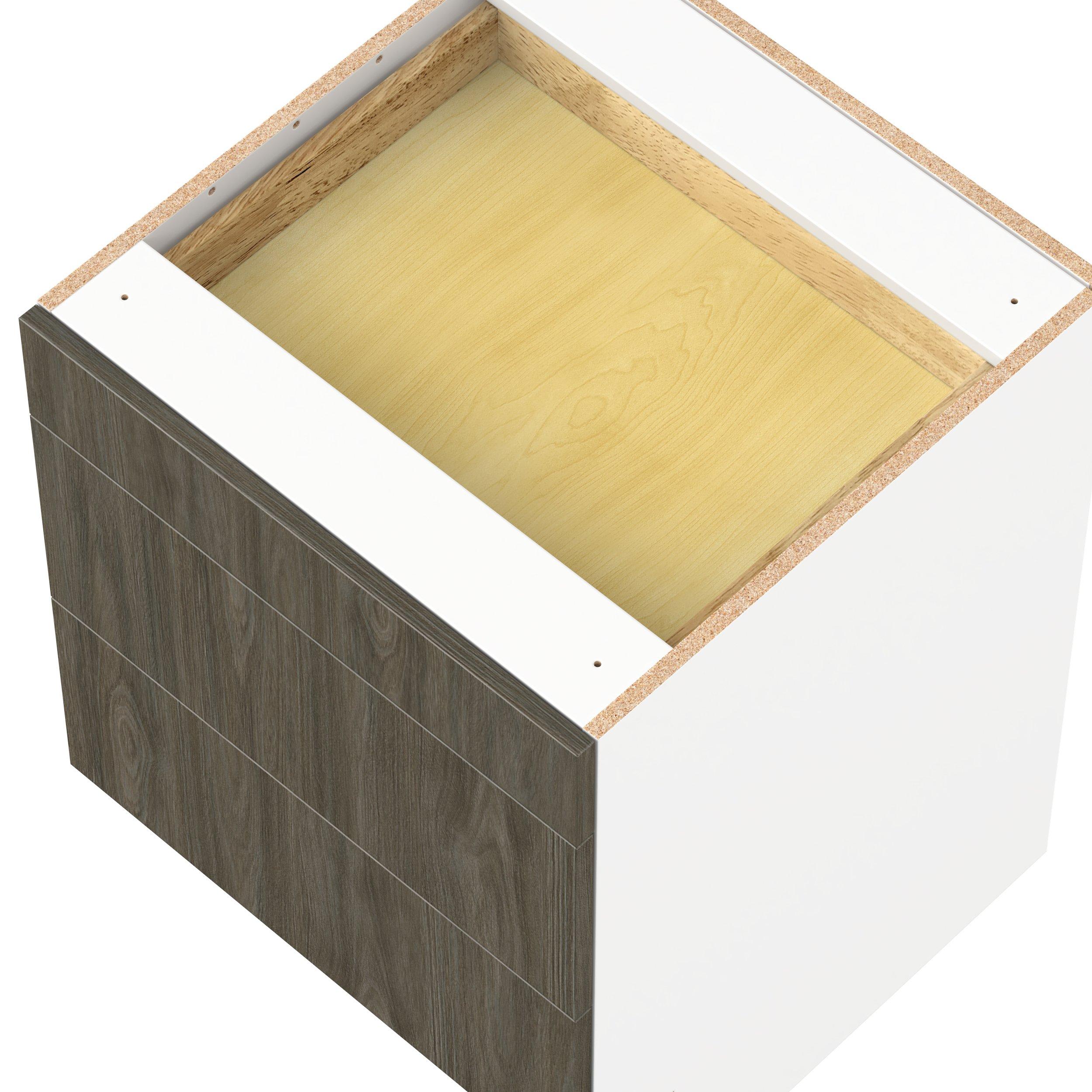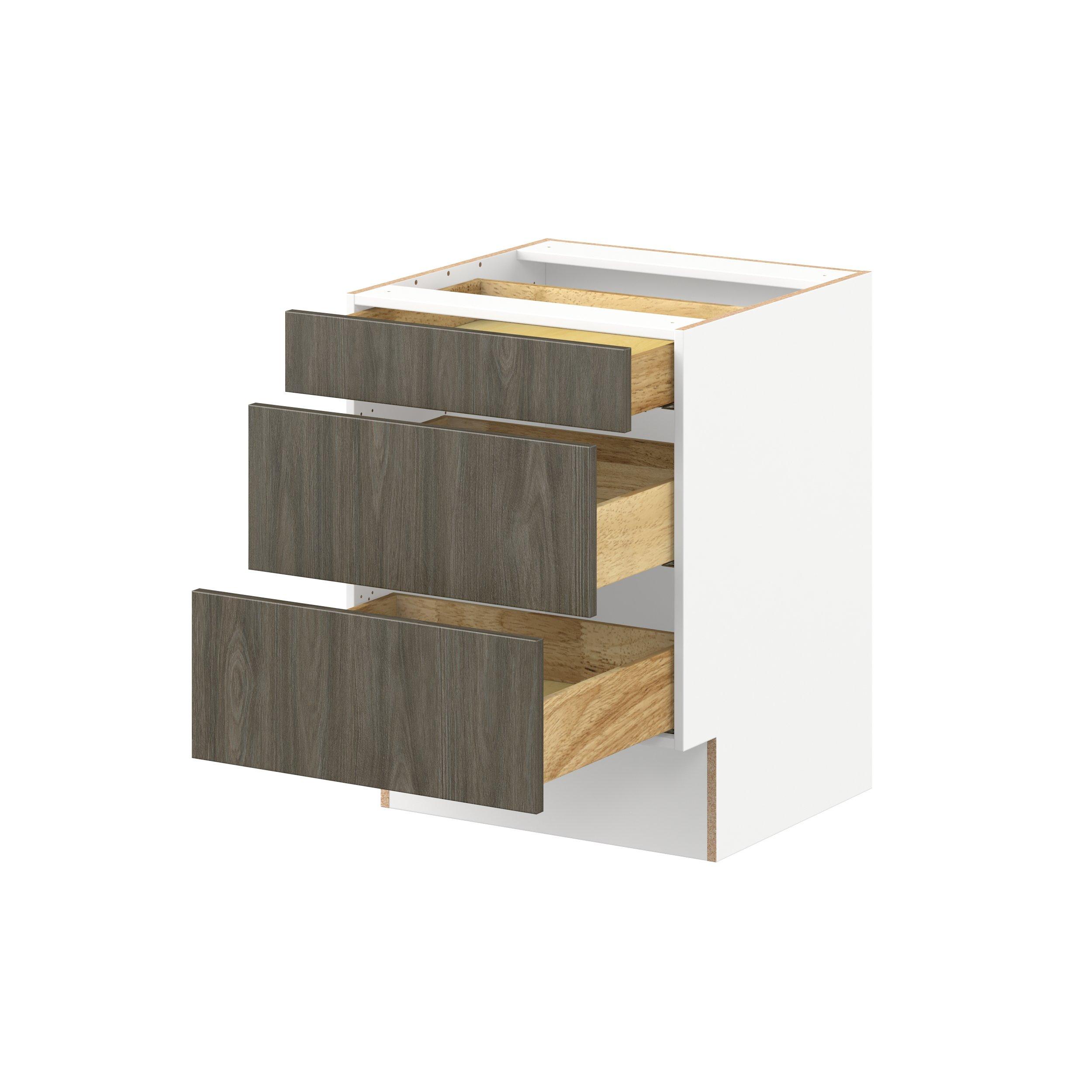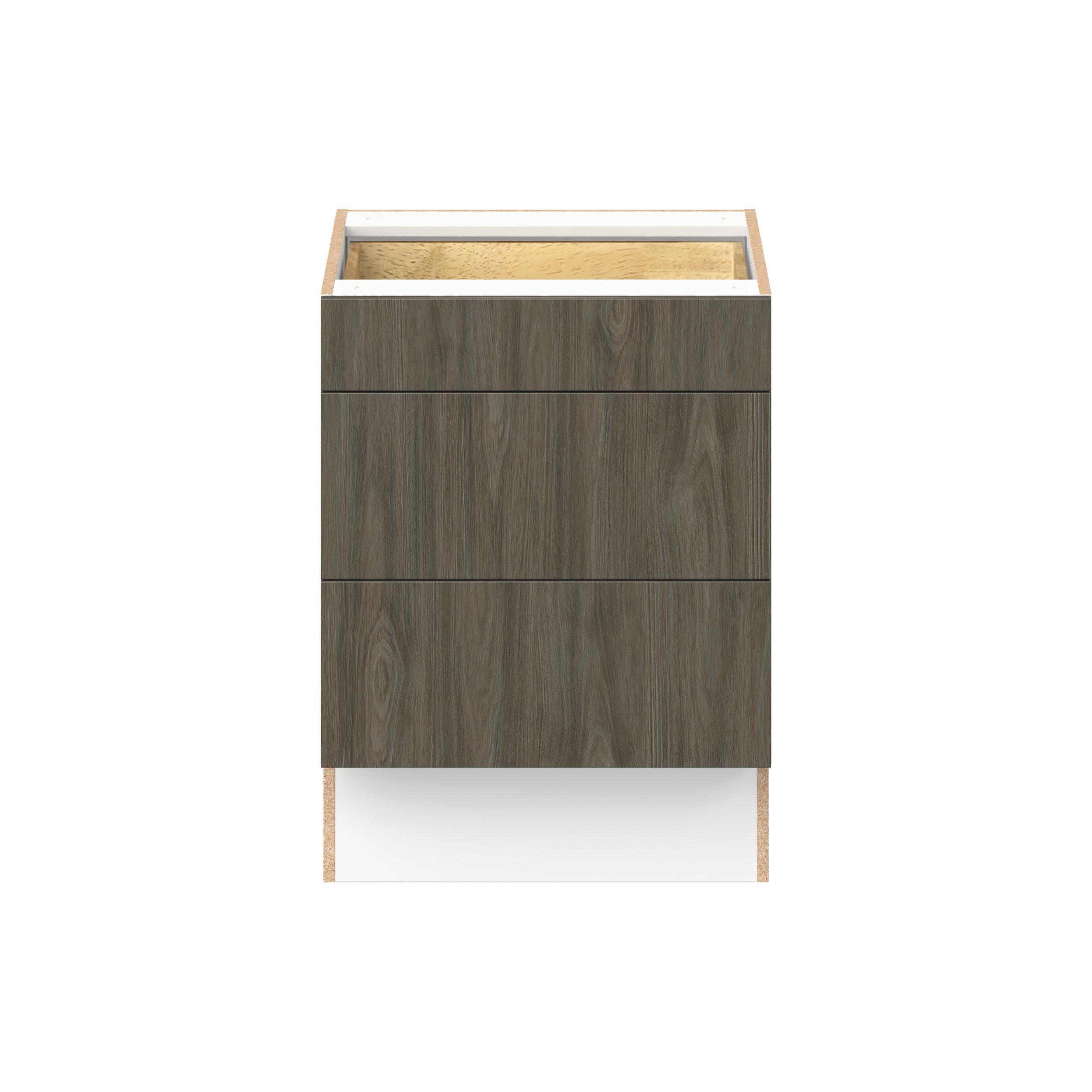 Elevate your project with the contemporary charm of Glenwood slab-style cabinets. Available in desert Mojavi oak and rich burnt walnut finishes, this collection captures the warmth and beauty of natural wood with the practicality of textured melamine. Crafted from one-piece MDF Studio Design Collection Glenwood 24 in. Burnt Walnut Drawer Base Cabinet - ADA is designed to resist hairline cracks while the easy-to-clean finish stands up to stains and moisture. Featuring 5-piece doors and dovetail drawer joints, these cabinets offer durability and elegance. This collection combines style with everyday storage solutions.