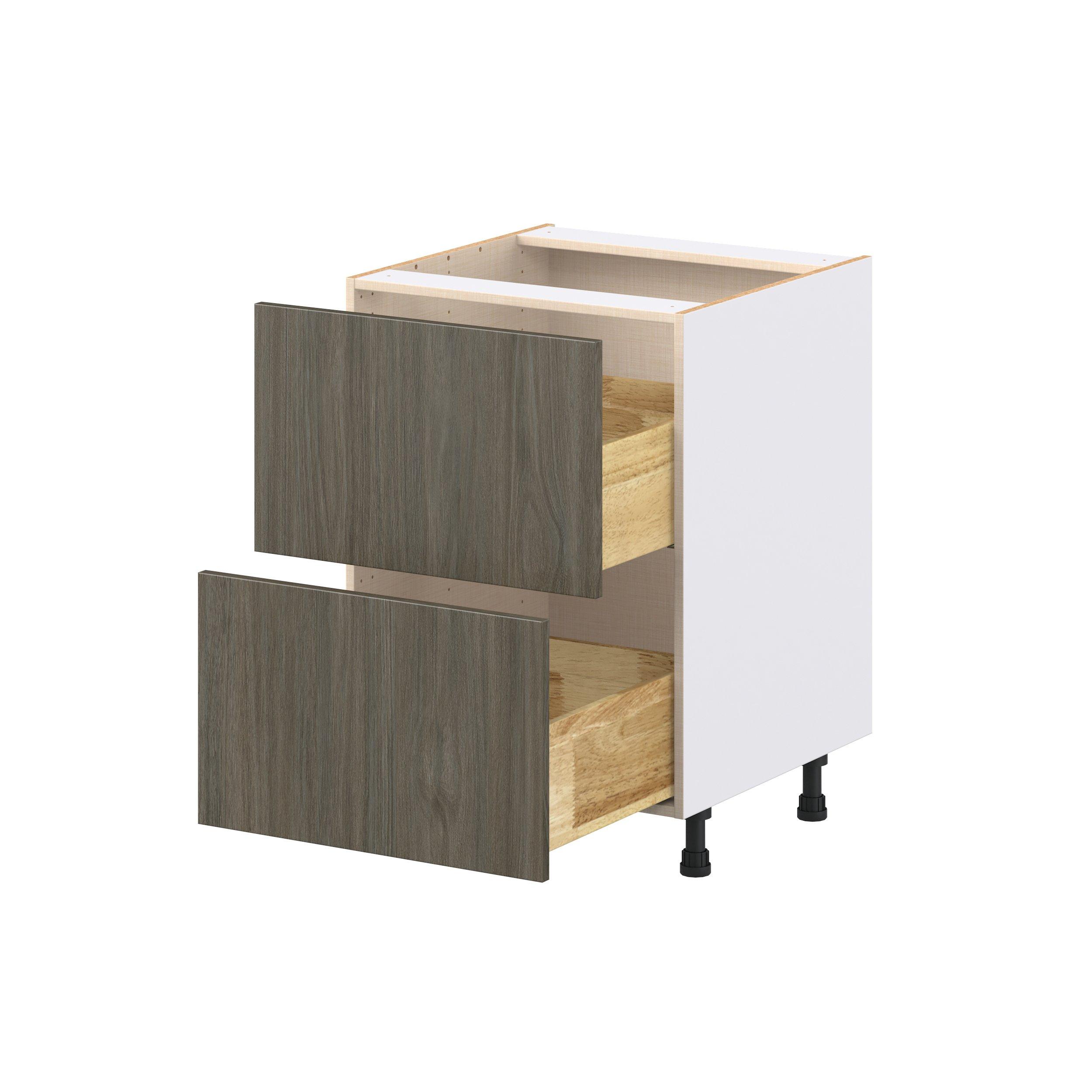 Elevate your project with the contemporary charm of Glenwood slab-style cabinets. Available in desert Mojavi oak and rich burnt walnut finishes, this collection captures the warmth and beauty of natural wood with the practicality of textured melamine. Crafted from one-piece MDF Studio Design Collection Glenwood 24 in. Burnt Walnut Drawer Base Cabinet is designed to resist hairline cracks while the easy-to-clean finish stands up to stains and moisture. Featuring 5-piece doors and dovetail drawer joints, these cabinets offer durability and elegance. This collection combines style with everyday storage solutions.