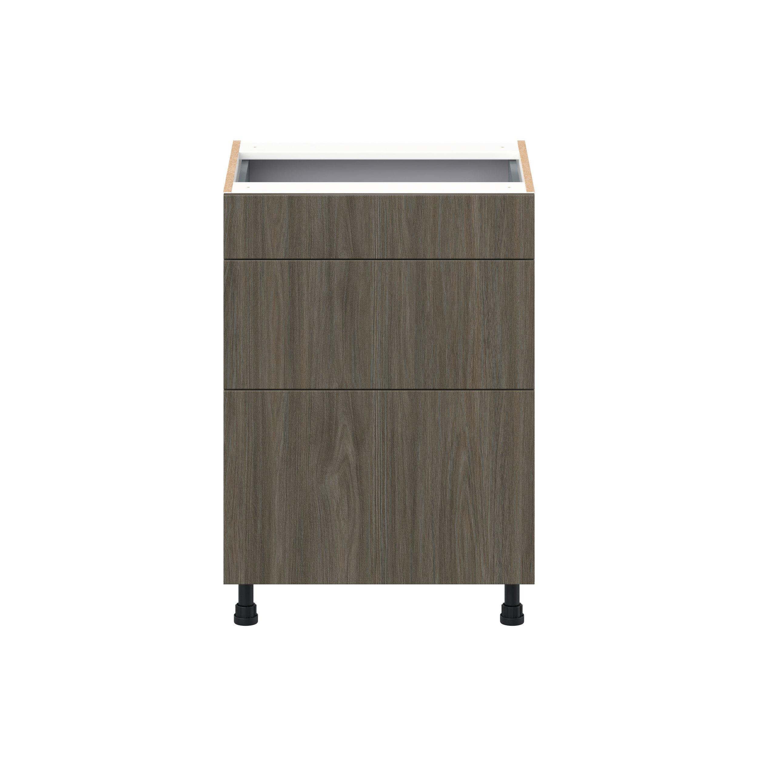Elevate your project with the contemporary charm of Glenwood slab-style cabinets. Available in desert Mojavi oak and rich burnt walnut finishes, this collection captures the warmth and beauty of natural wood with the practicality of textured melamine. Crafted from one-piece MDF Studio Design Collection Glenwood 24 in. Burnt Walnut Vanity Drawer Base Cabinet - ADA is designed to resist hairline cracks while the easy-to-clean finish stands up to stains and moisture. Featuring 5-piece doors and dovetail drawer joints, these cabinets offer durability and elegance. This collection combines style with everyday storage solutions.