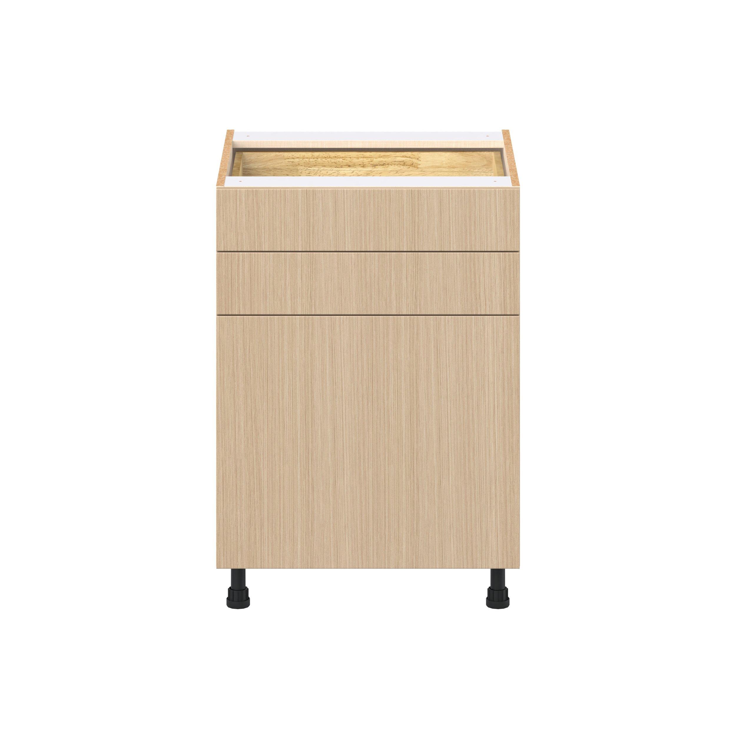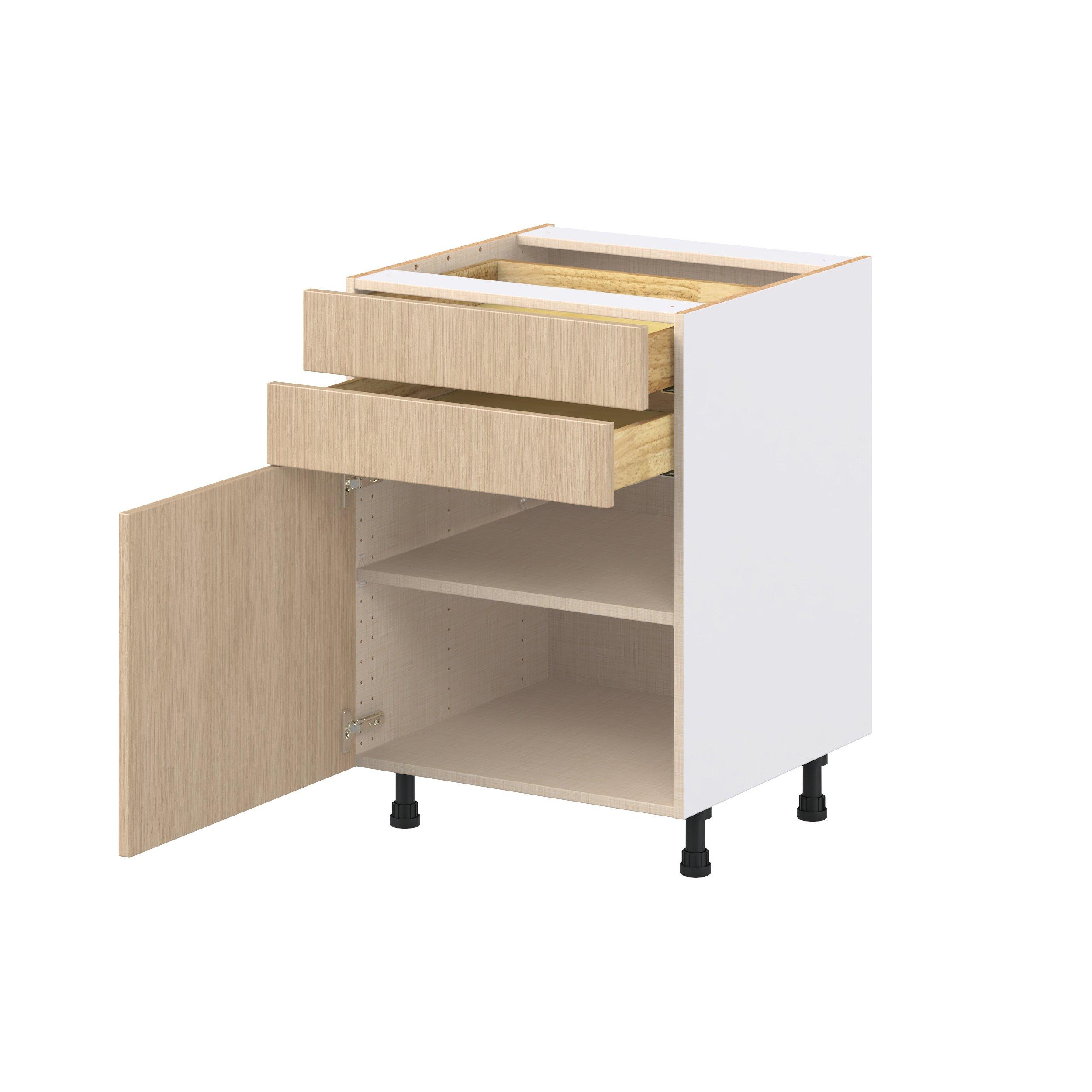 Elevate your project with the contemporary charm of Glenwood slab-style cabinets. Available in desert Mojavi oak and rich burnt walnut finishes, this collection captures the warmth and beauty of natural wood with the practicality of textured melamine. Crafted from one-piece MDF Studio Design Collection Glenwood 24 in. Mojavi Oak Door and Drawer Base Cabinet is designed to resist hairline cracks while the easy-to-clean finish stands up to stains and moisture. Featuring 5-piece doors and dovetail drawer joints, these cabinets offer durability and elegance. This collection combines style with everyday storage solutions.