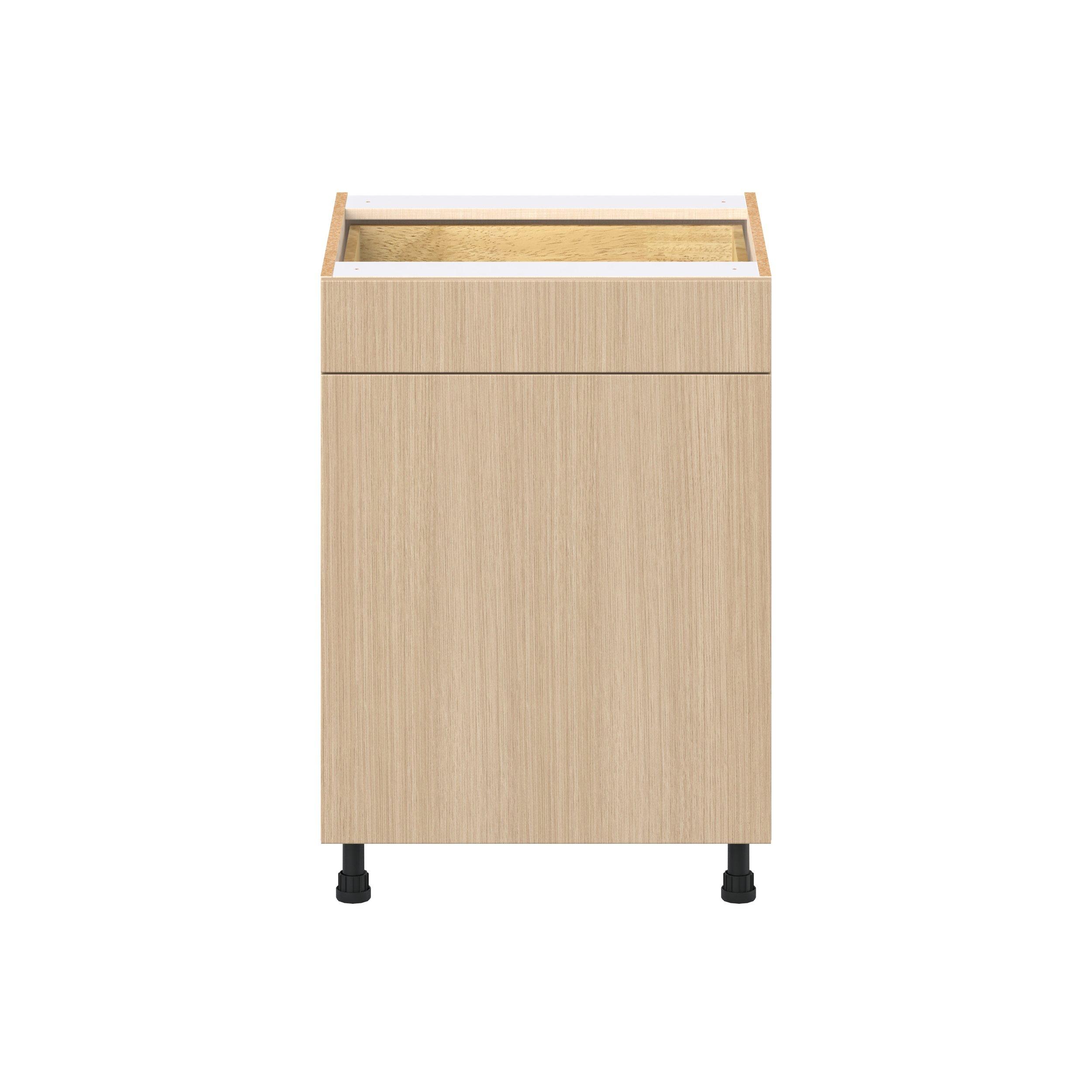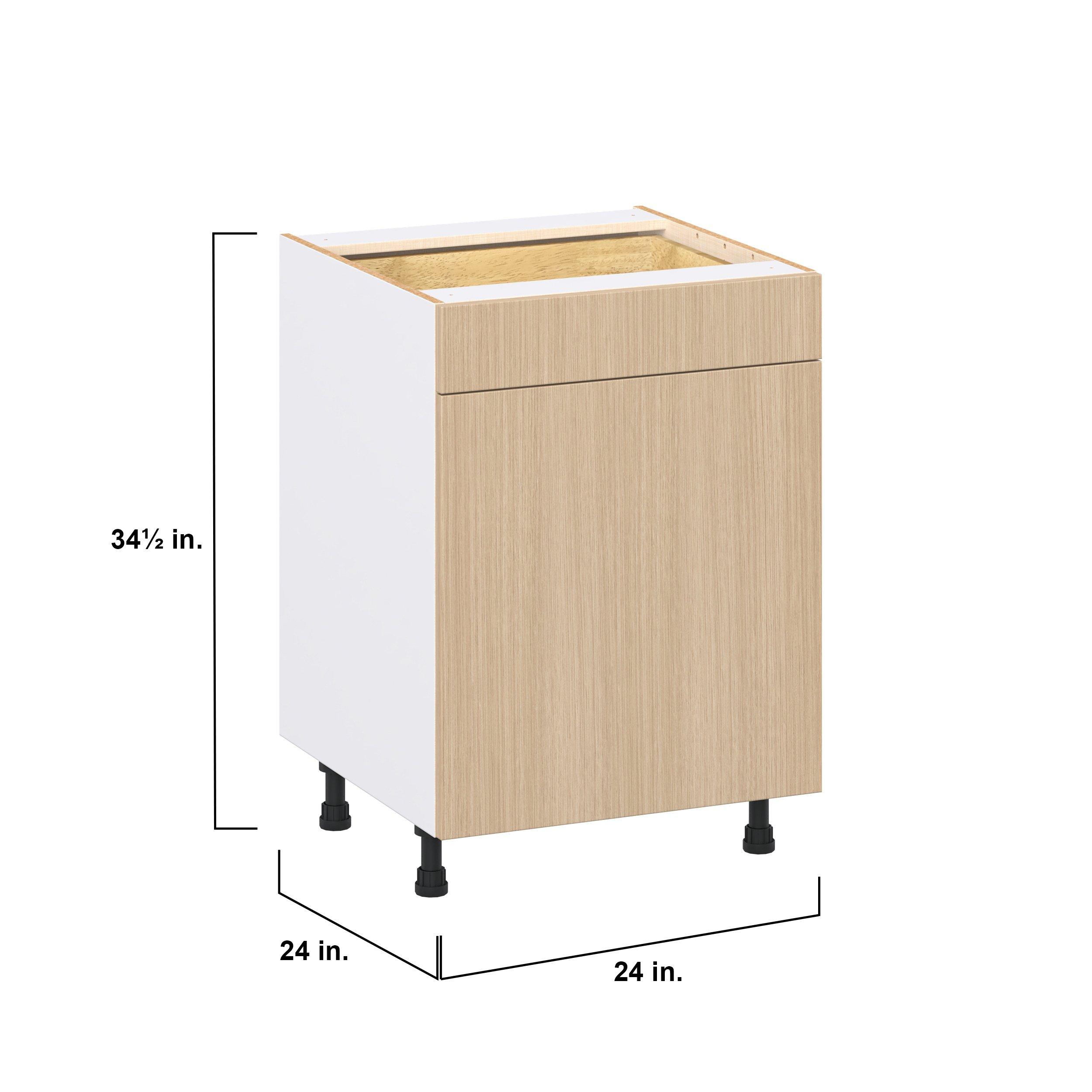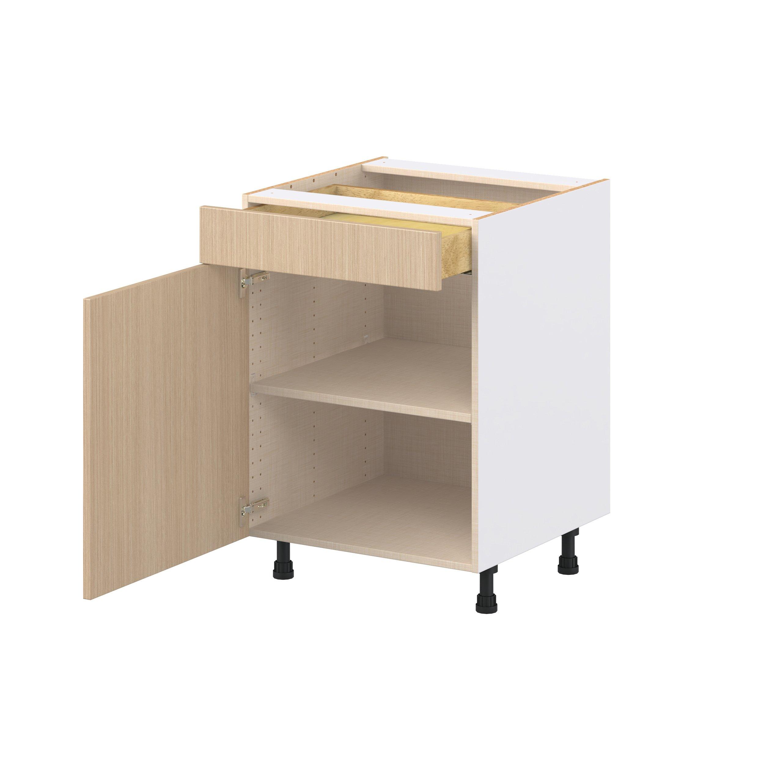 Elevate your project with the contemporary charm of Glenwood slab-style cabinets. Available in desert Mojavi oak and rich burnt walnut finishes, this collection captures the warmth and beauty of natural wood with the practicality of textured melamine. Crafted from one-piece MDF Studio Design Collection Glenwood 24 in. Mojavi Oak Door and Drawer Base Cabinet is designed to resist hairline cracks while the easy-to-clean finish stands up to stains and moisture. Featuring 5-piece doors and dovetail drawer joints, these cabinets offer durability and elegance. This collection combines style with everyday storage solutions.