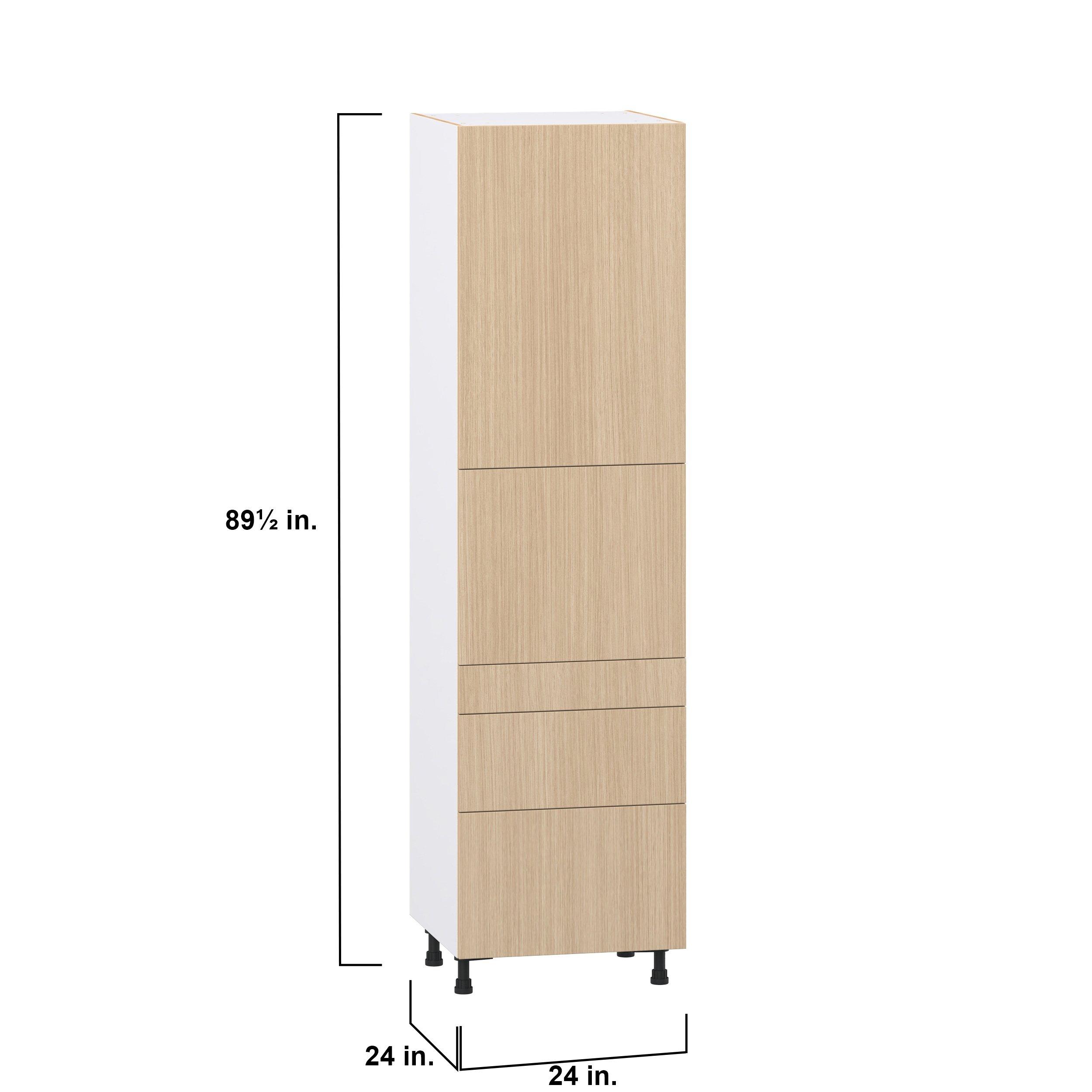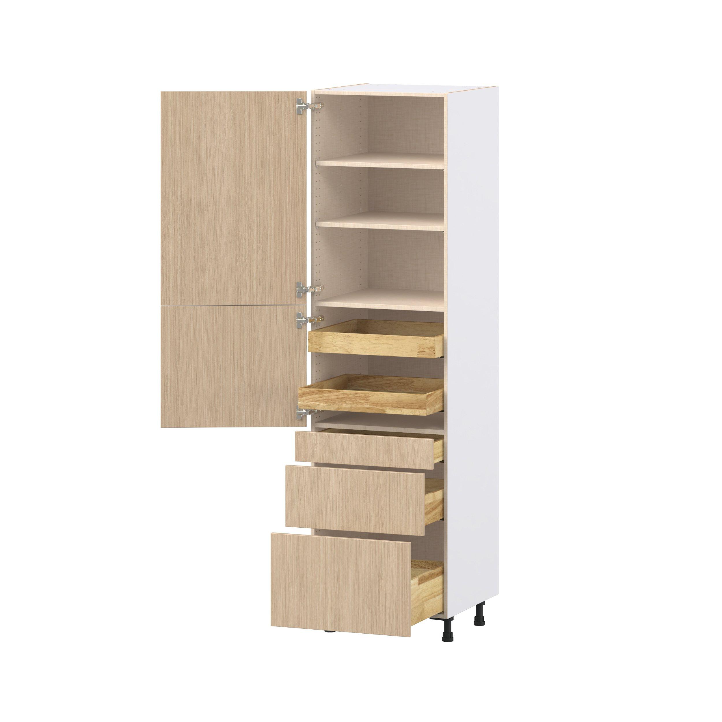Elevate your project with the contemporary charm of Glenwood slab-style cabinets. Available in desert Mojavi oak and rich burnt walnut finishes, this collection captures the warmth and beauty of natural wood with the practicality of textured melamine. Crafted from one-piece MDF Studio Design Collection Glenwood 24 in. Mojavi Oak Door and Drawer Pantry Cabinet with Inner Pull-Out is designed to resist hairline cracks while the easy-to-clean finish stands up to stains and moisture. Featuring 5-piece doors and dovetail drawer joints, these cabinets offer durability and elegance. This collection combines style with everyday storage solutions.