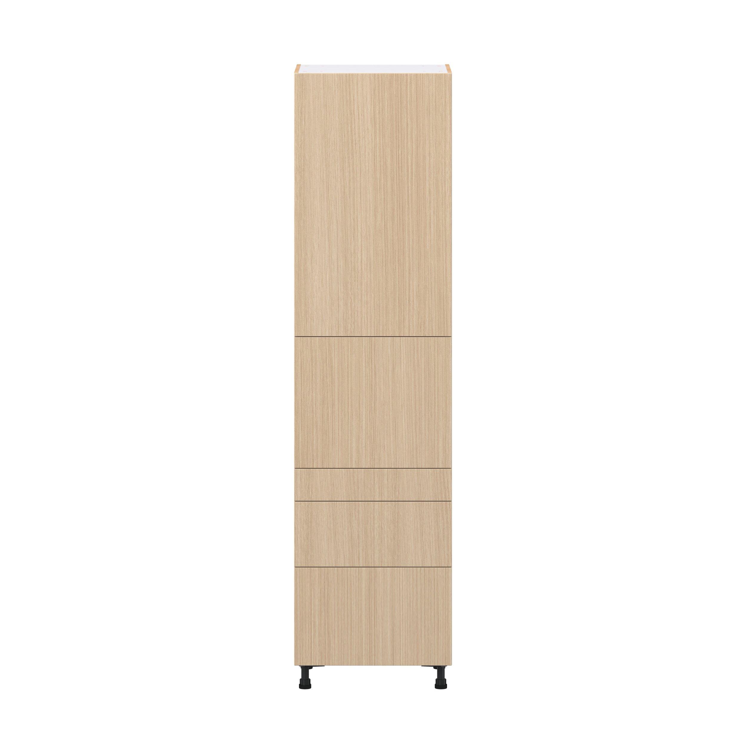 Elevate your project with the contemporary charm of Glenwood slab-style cabinets. Available in desert Mojavi oak and rich burnt walnut finishes, this collection captures the warmth and beauty of natural wood with the practicality of textured melamine. Crafted from one-piece MDF Studio Design Collection Glenwood 24 in. Mojavi Oak Door and Drawer Pantry Cabinet with Inner Pull-Out is designed to resist hairline cracks while the easy-to-clean finish stands up to stains and moisture. Featuring 5-piece doors and dovetail drawer joints, these cabinets offer durability and elegance. This collection combines style with everyday storage solutions.