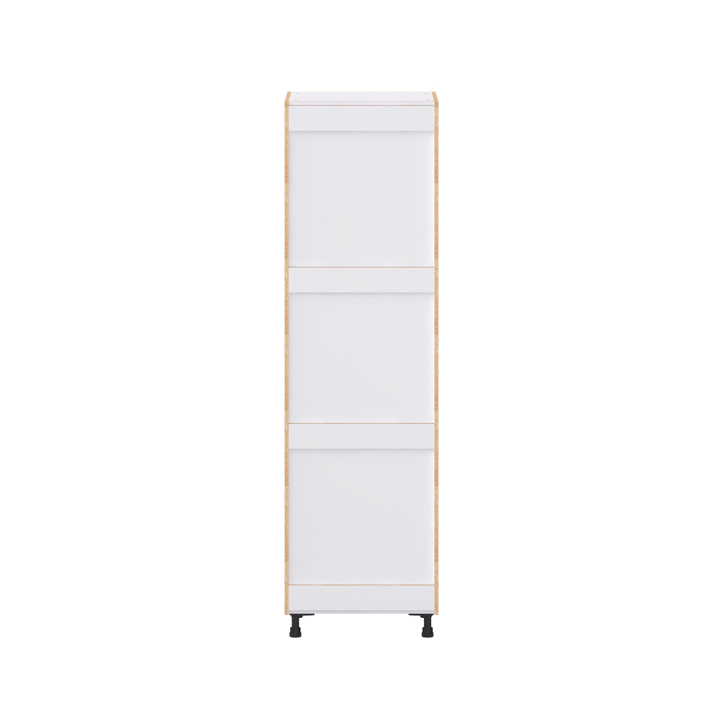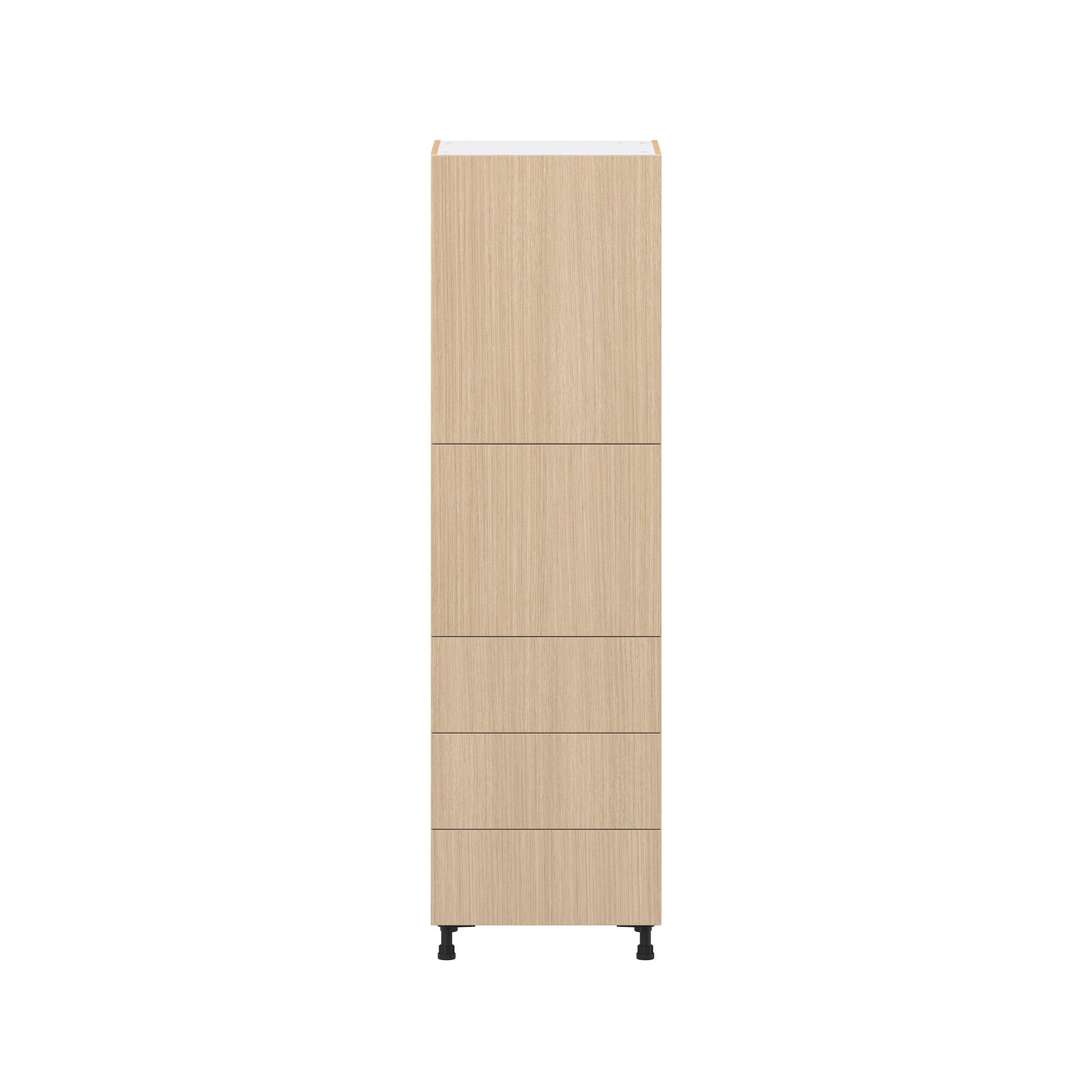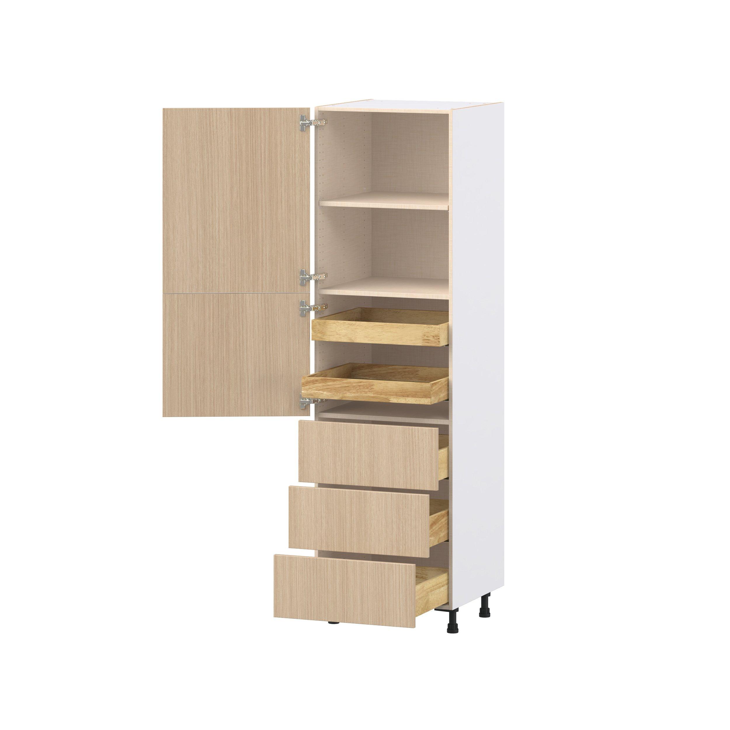 Elevate your project with the contemporary charm of Glenwood slab-style cabinets. Available in desert Mojavi oak and rich burnt walnut finishes, this collection captures the warmth and beauty of natural wood with the practicality of textured melamine. Crafted from one-piece MDF Studio Design Collection Glenwood 24 in. Mojavi Oak Door and Drawer Pantry Cabinet with Inner Pull-Out is designed to resist hairline cracks while the easy-to-clean finish stands up to stains and moisture. Featuring 5-piece doors and dovetail drawer joints, these cabinets offer durability and elegance. This collection combines style with everyday storage solutions.