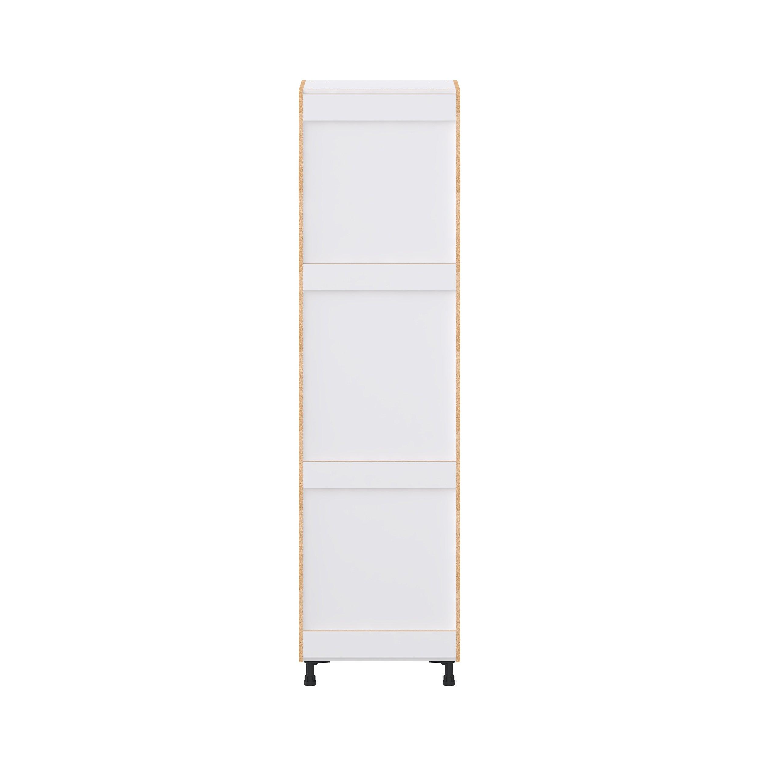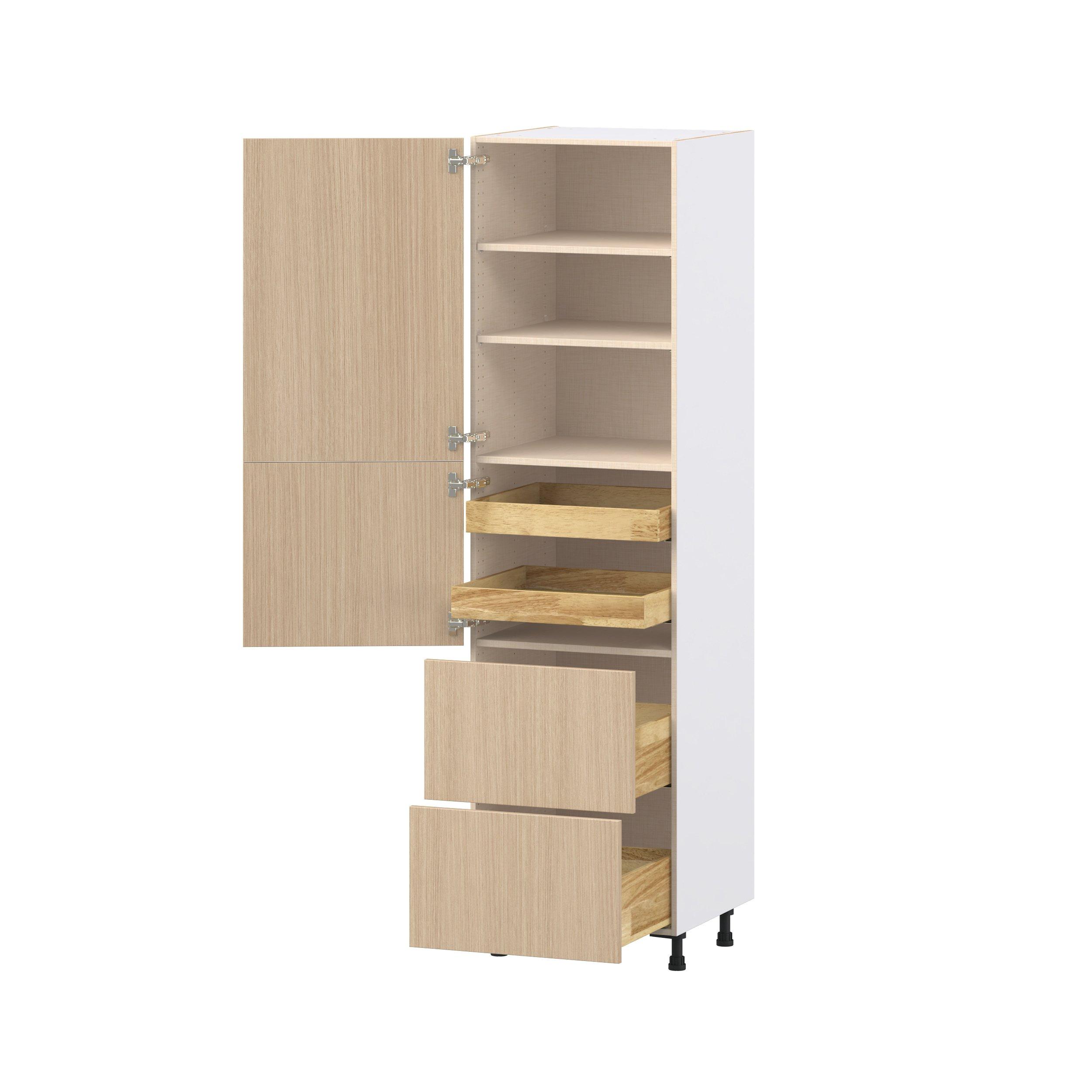 Elevate your project with the contemporary charm of Glenwood slab-style cabinets. Available in desert Mojavi oak and rich burnt walnut finishes, this collection captures the warmth and beauty of natural wood with the practicality of textured melamine. Crafted from one-piece MDF Studio Design Collection Glenwood 24 in. Mojavi Oak Door and Drawer Pantry Cabinet with Inner Pull-Out is designed to resist hairline cracks while the easy-to-clean finish stands up to stains and moisture. Featuring 5-piece doors and dovetail drawer joints, these cabinets offer durability and elegance. This collection combines style with everyday storage solutions.