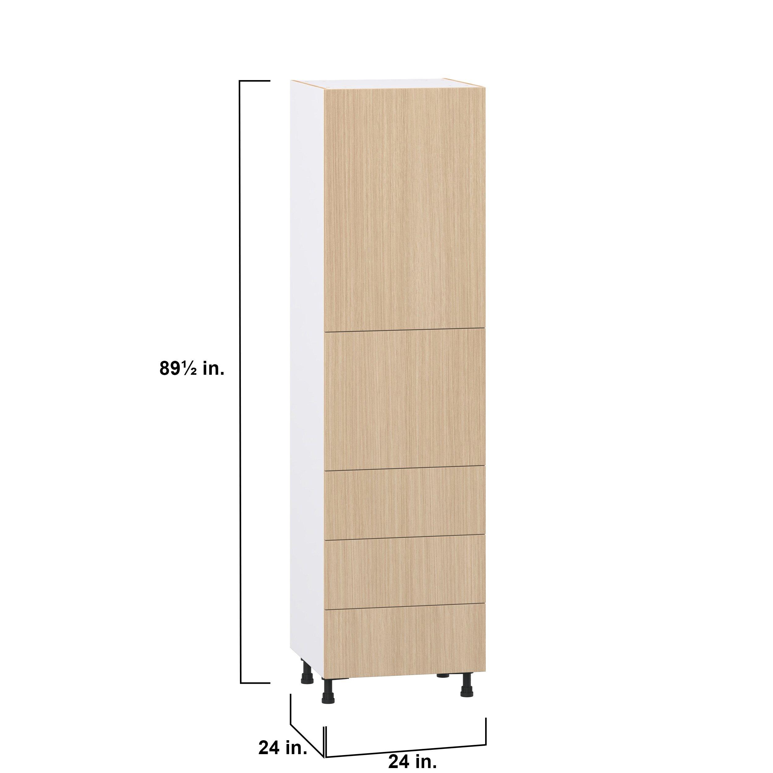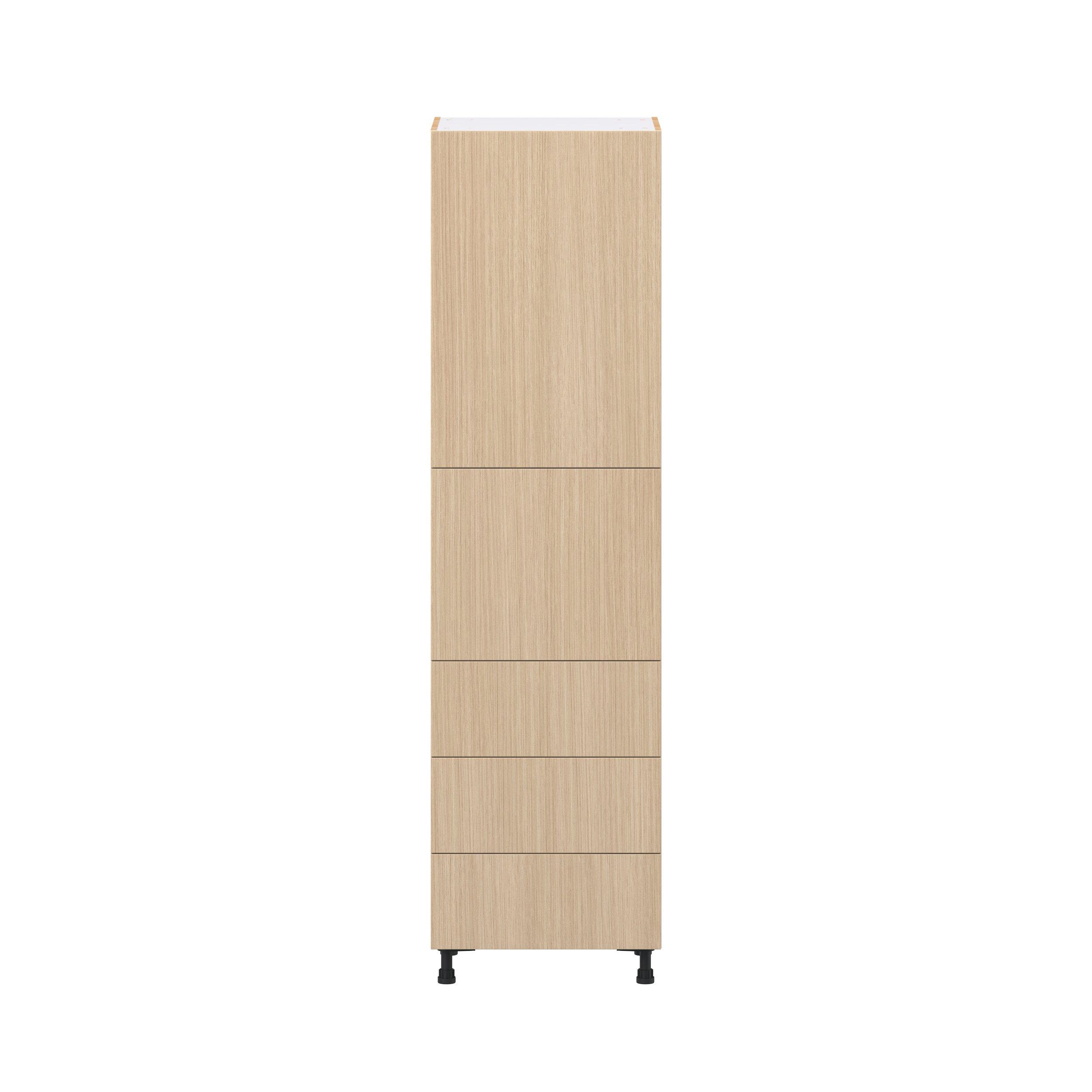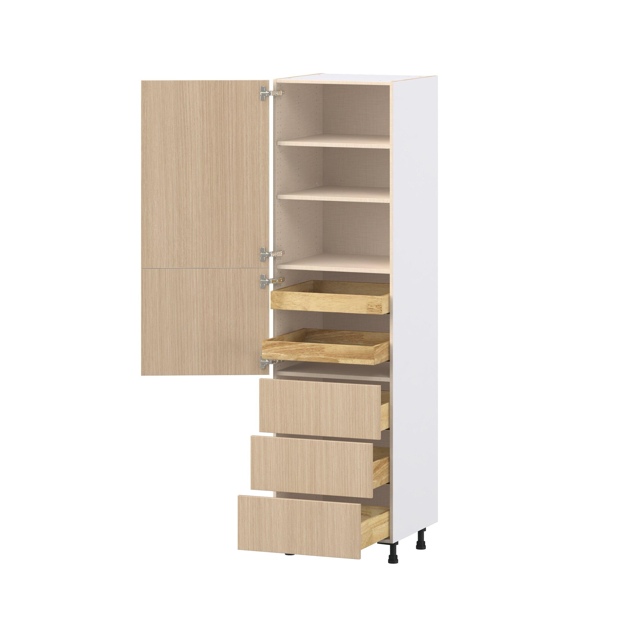 Elevate your project with the contemporary charm of Glenwood slab-style cabinets. Available in desert Mojavi oak and rich burnt walnut finishes, this collection captures the warmth and beauty of natural wood with the practicality of textured melamine. Crafted from one-piece MDF Studio Design Collection Glenwood 24 in. Mojavi Oak Door and Drawer Pantry Cabinet with Inner Pull-Out is designed to resist hairline cracks while the easy-to-clean finish stands up to stains and moisture. Featuring 5-piece doors and dovetail drawer joints, these cabinets offer durability and elegance. This collection combines style with everyday storage solutions.