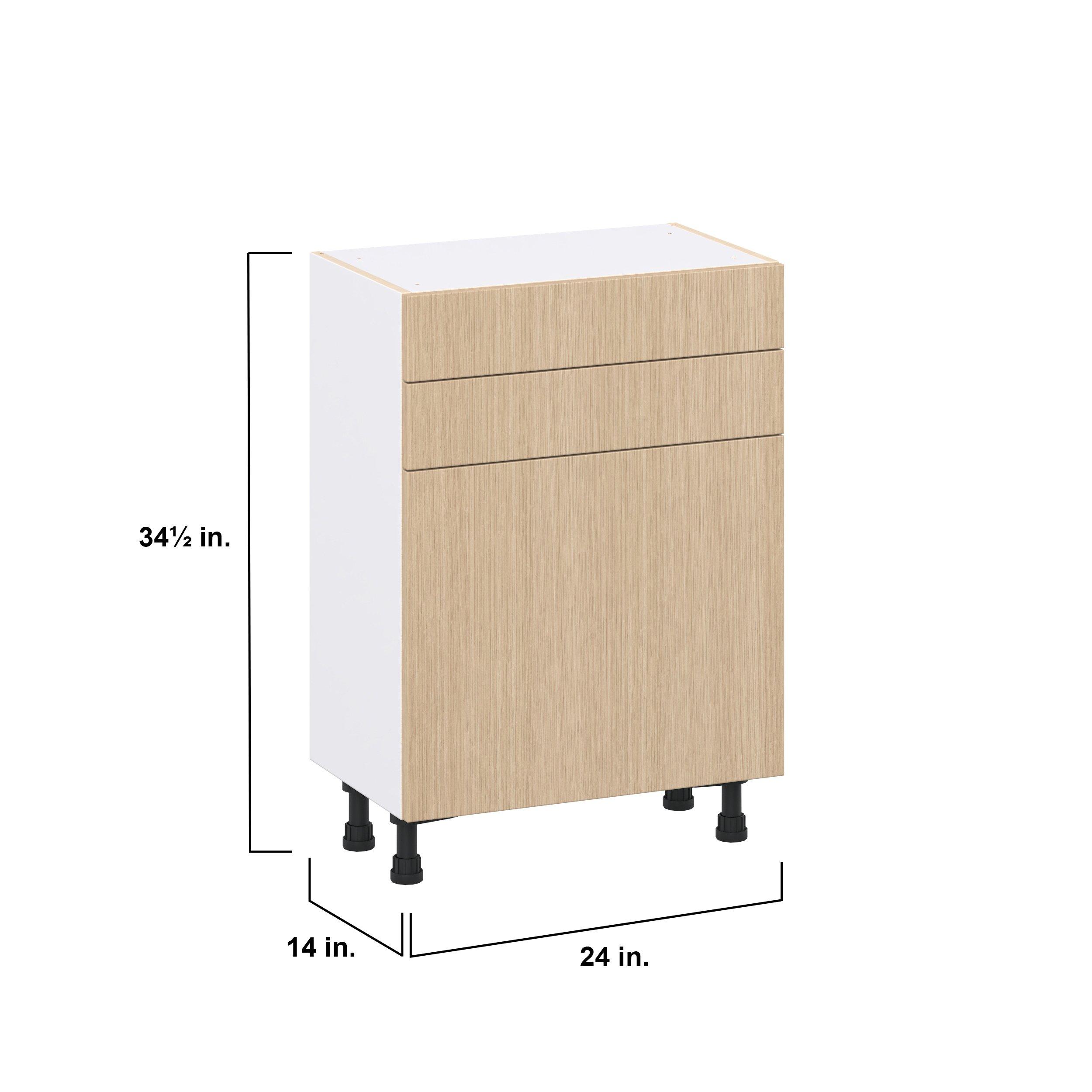 Elevate your project with the contemporary charm of Glenwood slab-style cabinets. Available in desert Mojavi oak and rich burnt walnut finishes, this collection captures the warmth and beauty of natural wood with the practicality of textured melamine. Crafted from one-piece MDF Studio Design Collection Glenwood 24 in. Mojavi Oak Shallow Base Cabinet is designed to resist hairline cracks while the easy-to-clean finish stands up to stains and moisture. Featuring 5-piece doors and dovetail drawer joints, these cabinets offer durability and elegance. This collection combines style with everyday storage solutions.