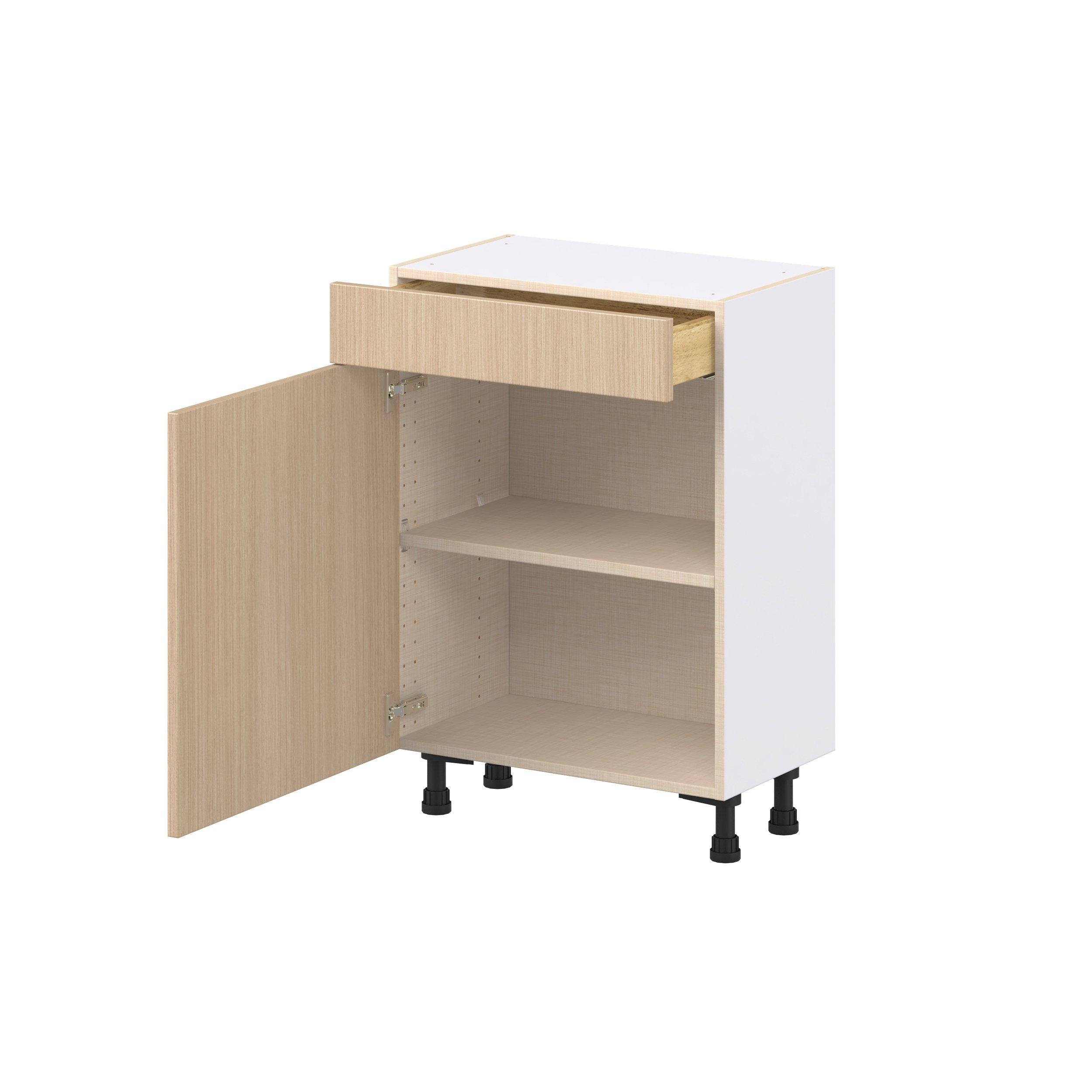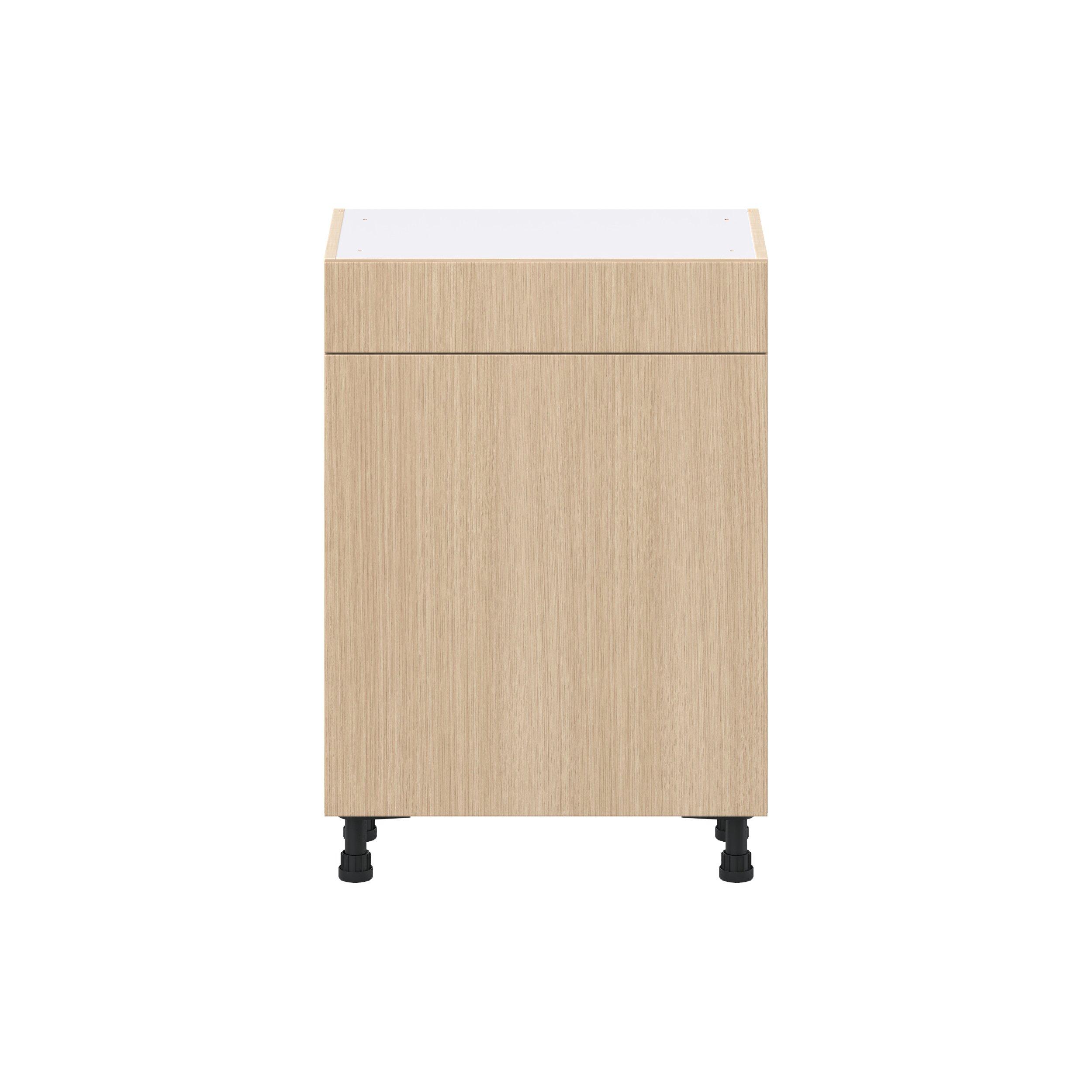 Elevate your project with the contemporary charm of Glenwood slab-style cabinets. Available in desert Mojavi oak and rich burnt walnut finishes, this collection captures the warmth and beauty of natural wood with the practicality of textured melamine. Crafted from one-piece MDF Studio Design Collection Glenwood 24 in. Mojavi Oak Shallow Base Cabinet is designed to resist hairline cracks while the easy-to-clean finish stands up to stains and moisture. Featuring 5-piece doors and dovetail drawer joints, these cabinets offer durability and elegance. This collection combines style with everyday storage solutions.
