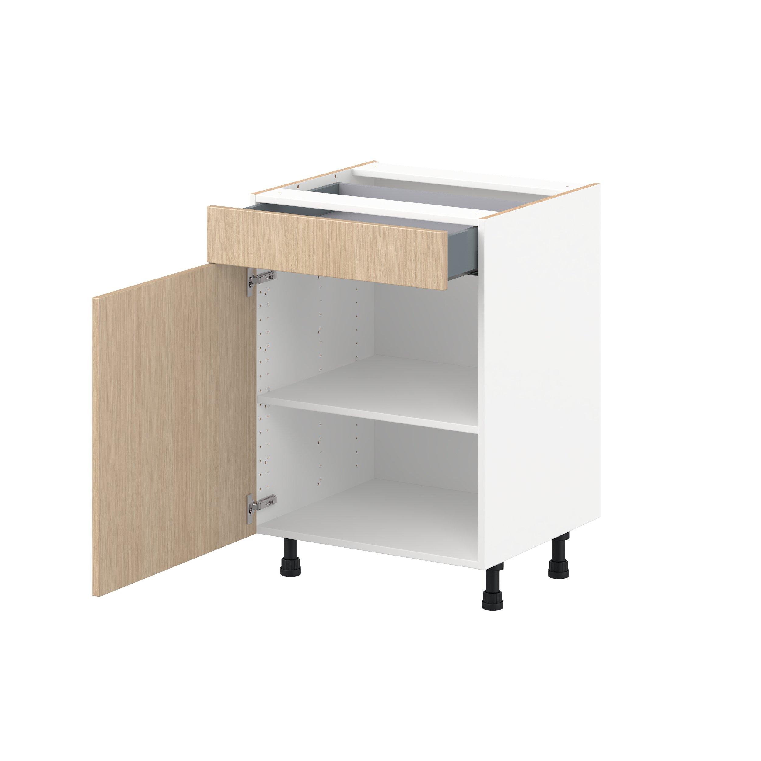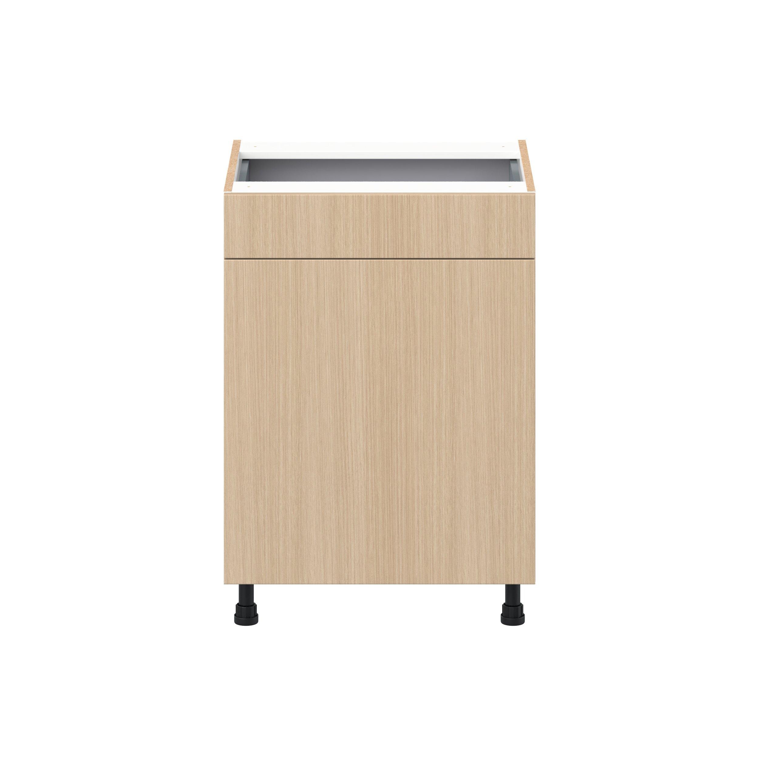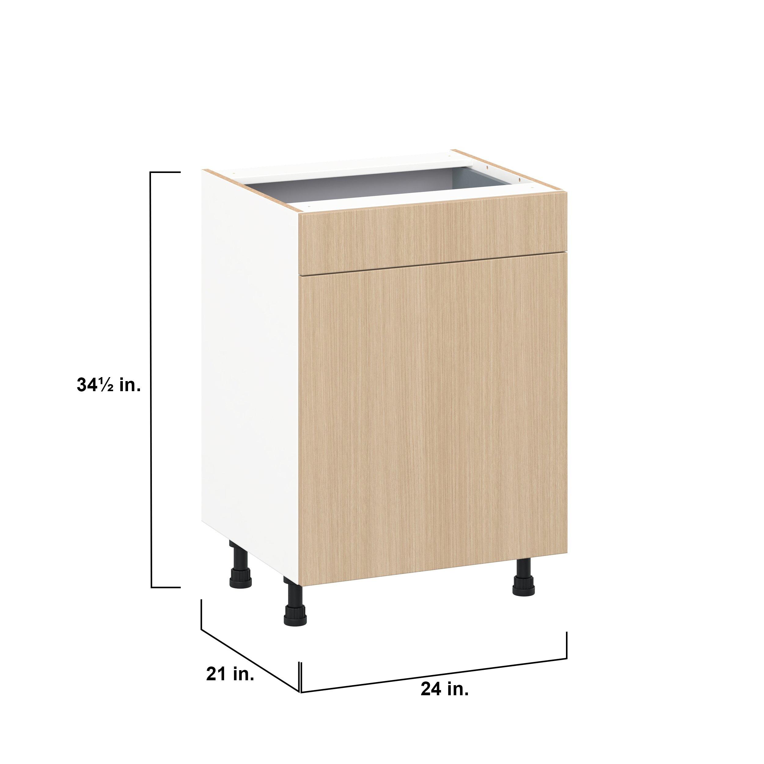 Elevate your project with the contemporary charm of Glenwood slab-style cabinets. Available in desert Mojavi oak and rich burnt walnut finishes, this collection captures the warmth and beauty of natural wood with the practicality of textured melamine. Crafted from one-piece MDF Studio Design Collection Glenwood 24 in. Mojavi Oak Vanity Door and Drawer Base Cabinet - ADA is designed to resist hairline cracks while the easy-to-clean finish stands up to stains and moisture. Featuring 5-piece doors and dovetail drawer joints, these cabinets offer durability and elegance. This collection combines style with everyday storage solutions.