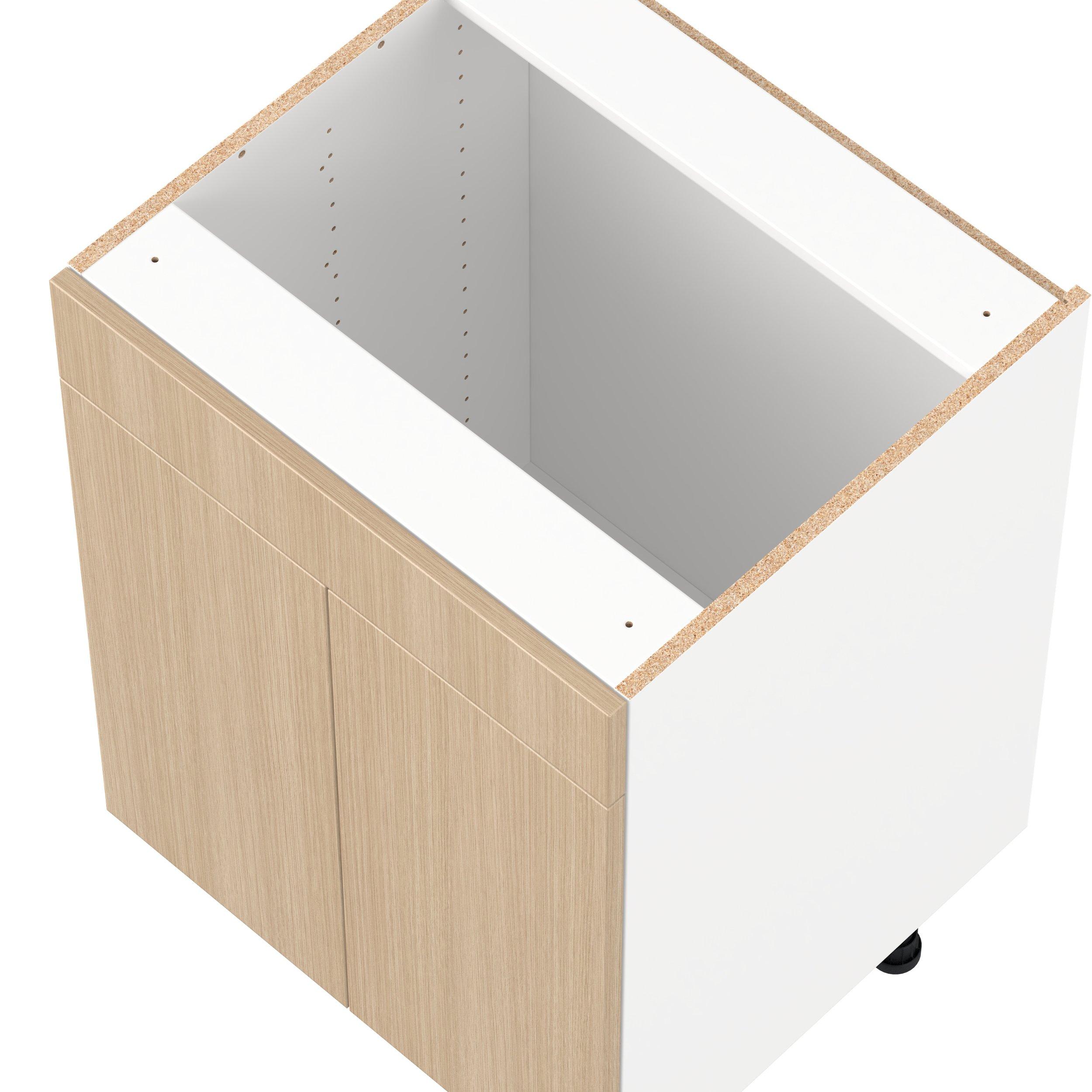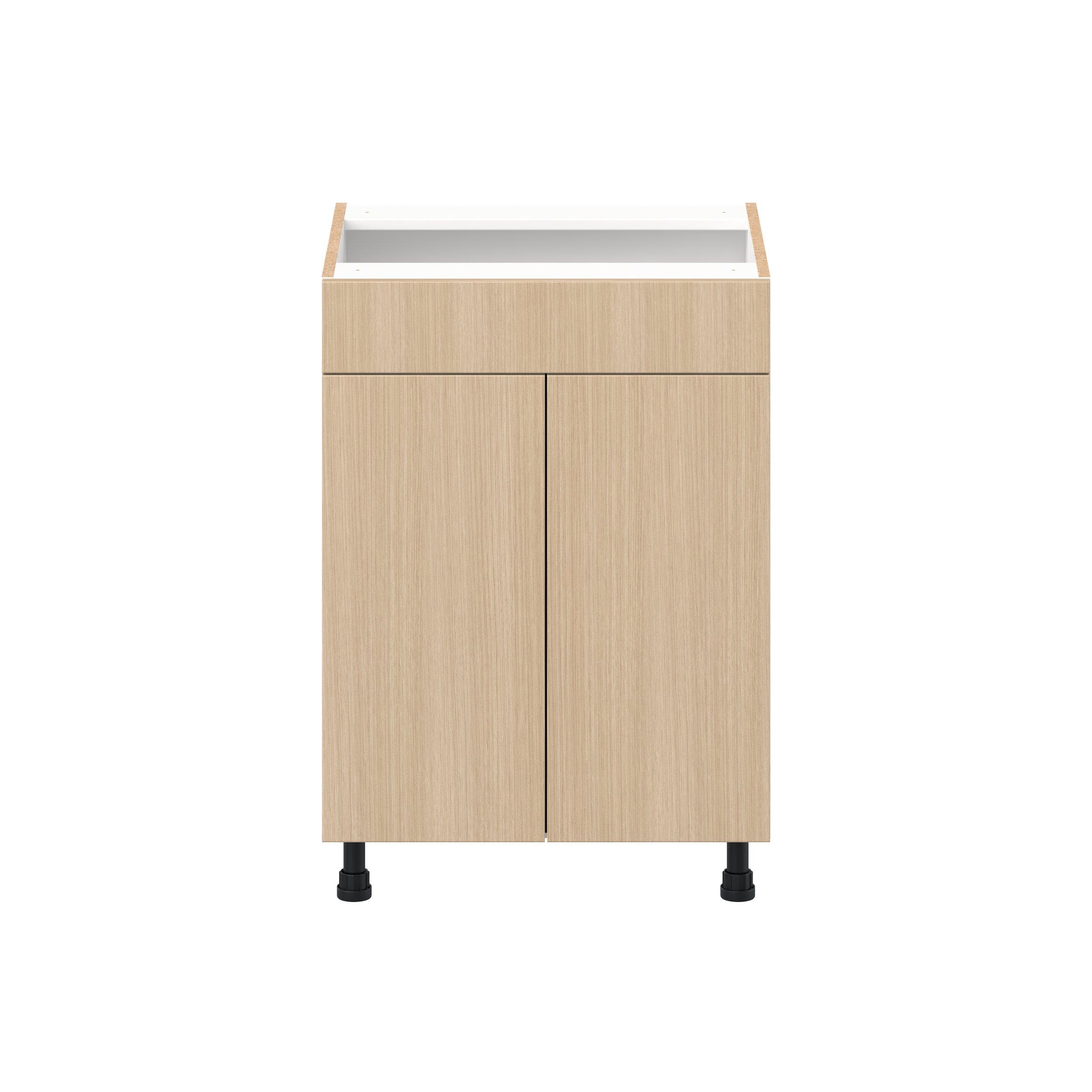 Elevate your project with the contemporary charm of Glenwood slab-style cabinets. Available in desert Mojavi oak and rich burnt walnut finishes, this collection captures the warmth and beauty of natural wood with the practicality of textured melamine. Crafted from one-piece MDF Studio Design Collection Glenwood 24 in. Mojavi Oak Vanity Sink Base Cabinet with False Front - ADA is designed to resist hairline cracks while the easy-to-clean finish stands up to stains and moisture. Featuring 5-piece doors and dovetail drawer joints, these cabinets offer durability and elegance. This collection combines style with everyday storage solutions.