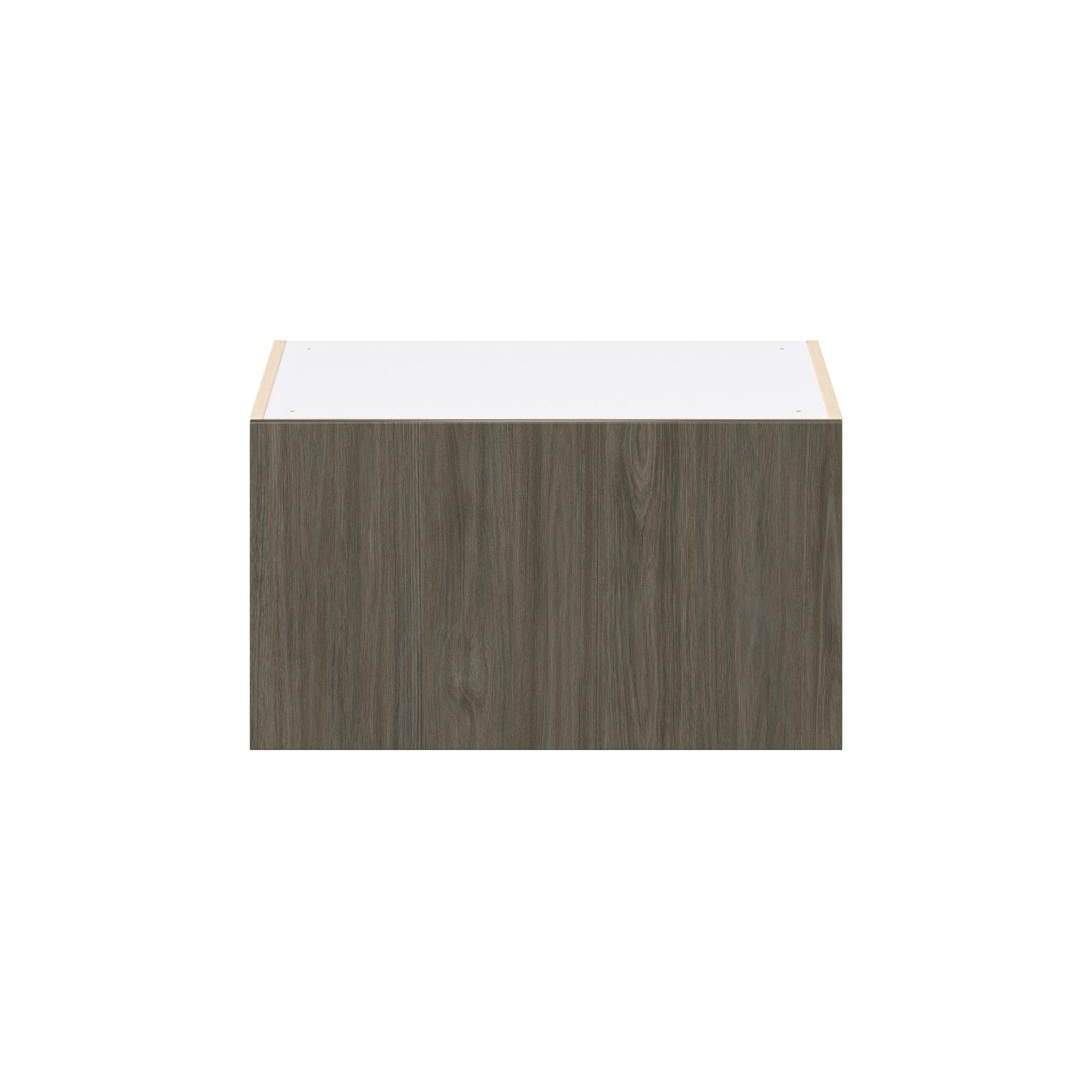 Elevate your project with the contemporary charm of Glenwood slab-style cabinets. Available in desert Mojavi oak and rich burnt walnut finishes, this collection captures the warmth and beauty of natural wood with the practicality of textured melamine. Crafted from one-piece MDF Studio Design Collection Glenwood 27 in. Burnt Walnut Lift Up Wall Cabinet is designed to resist hairline cracks while the easy-to-clean finish stands up to stains and moisture. Featuring 5-piece doors and dovetail drawer joints, these cabinets offer durability and elegance. This collection combines style with everyday storage solutions.