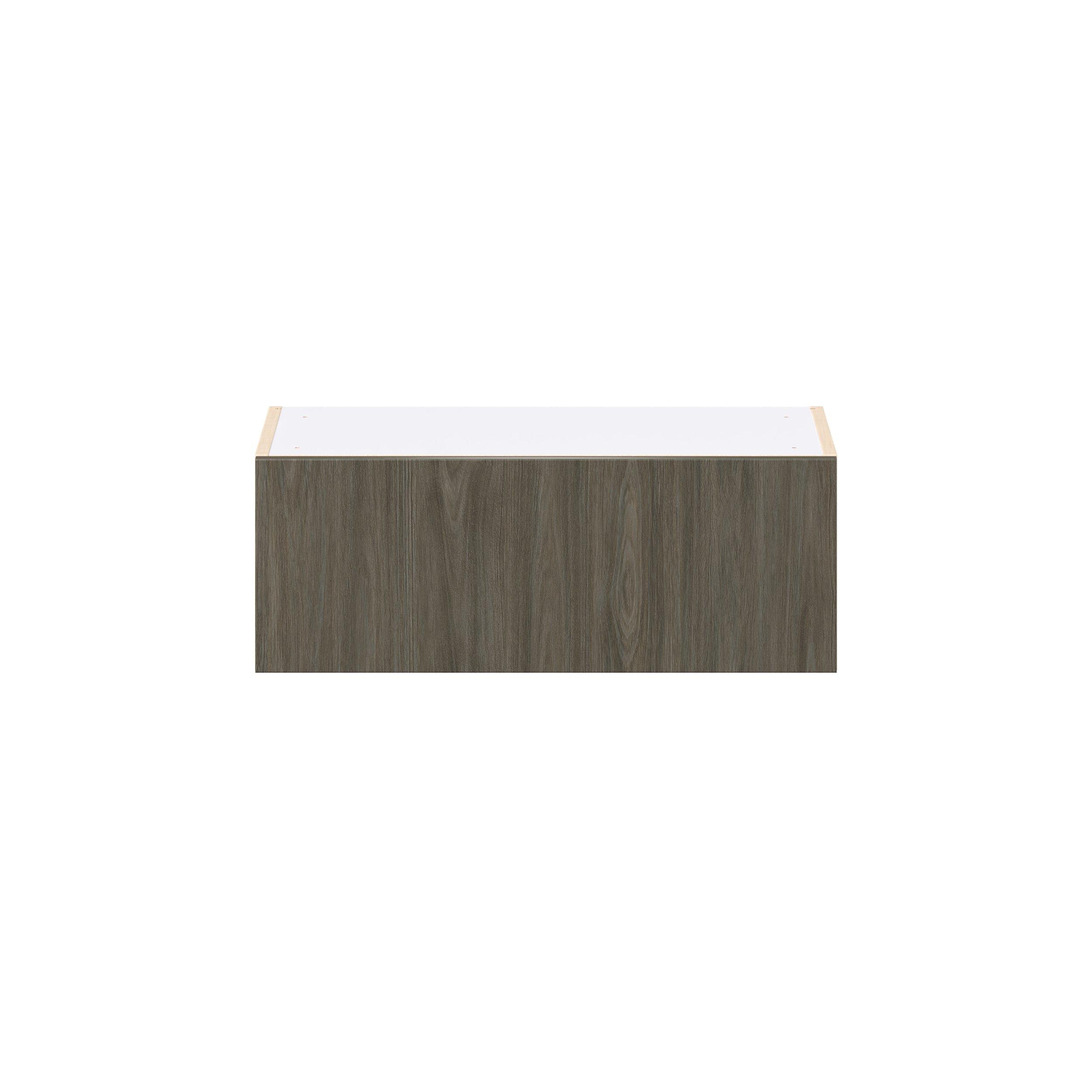 Elevate your project with the contemporary charm of Glenwood slab-style cabinets. Available in desert Mojavi oak and rich burnt walnut finishes, this collection captures the warmth and beauty of natural wood with the practicality of textured melamine. Crafted from one-piece MDF Studio Design Collection Glenwood 27 in. Burnt Walnut Lift Up Wall Cabinet is designed to resist hairline cracks while the easy-to-clean finish stands up to stains and moisture. Featuring 5-piece doors and dovetail drawer joints, these cabinets offer durability and elegance. This collection combines style with everyday storage solutions.