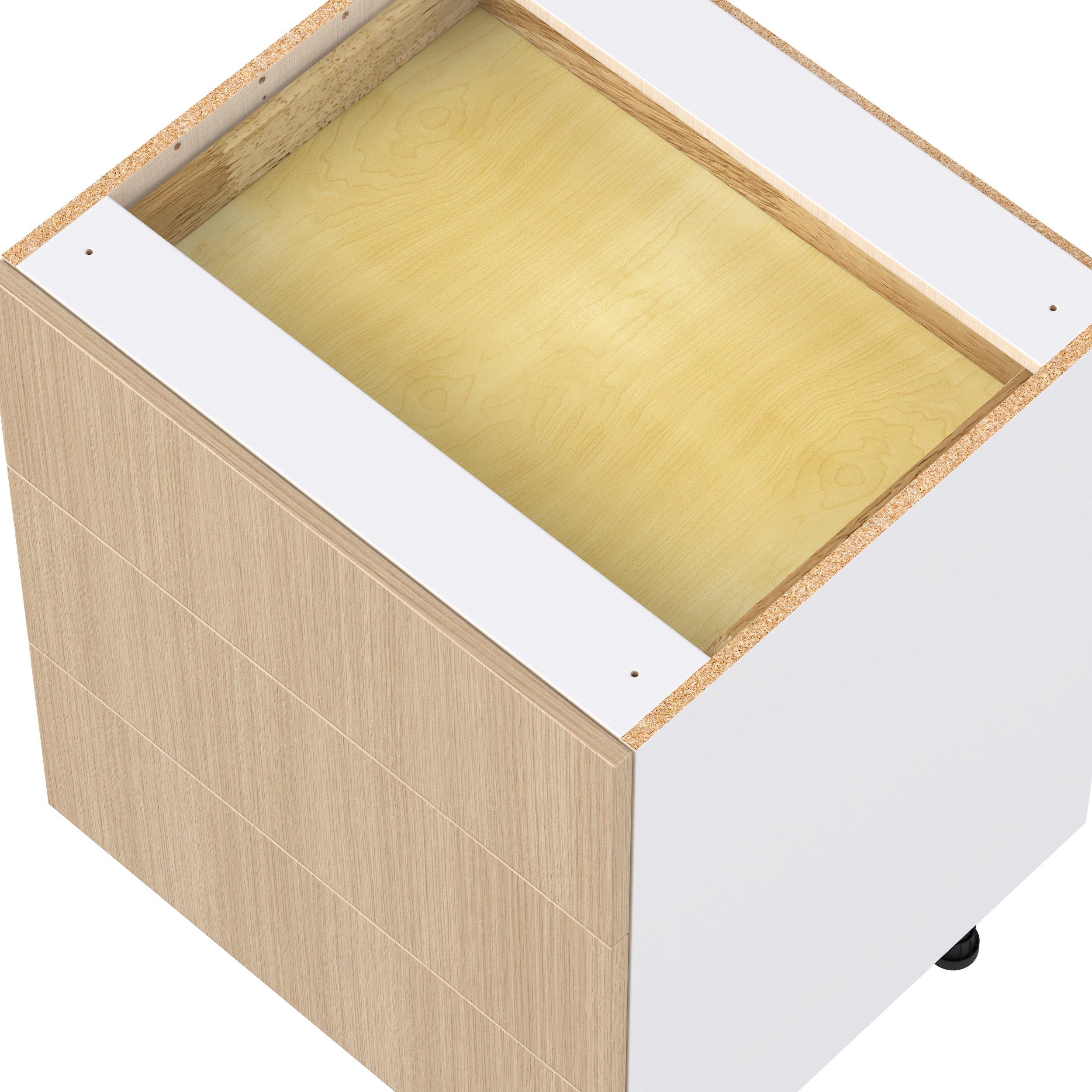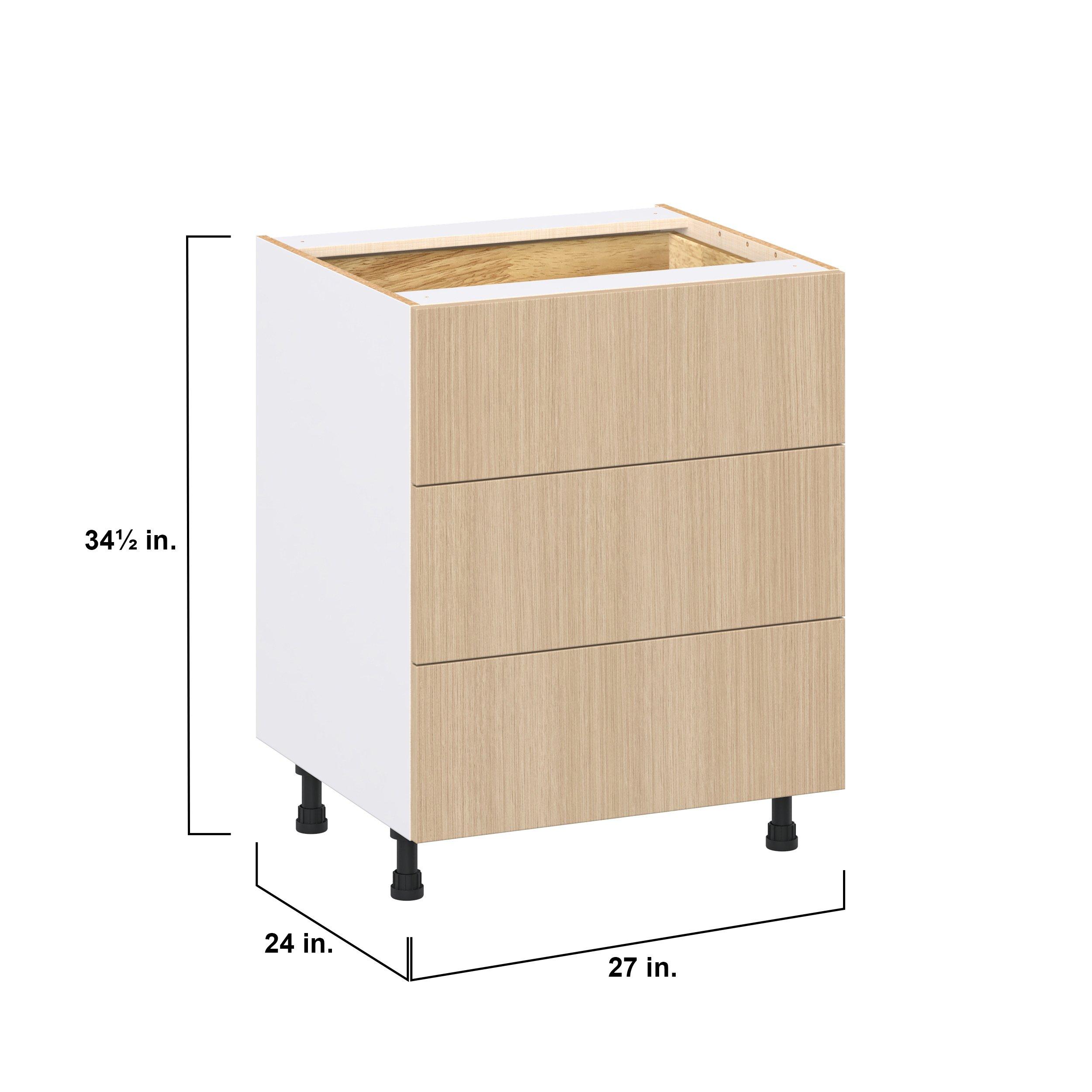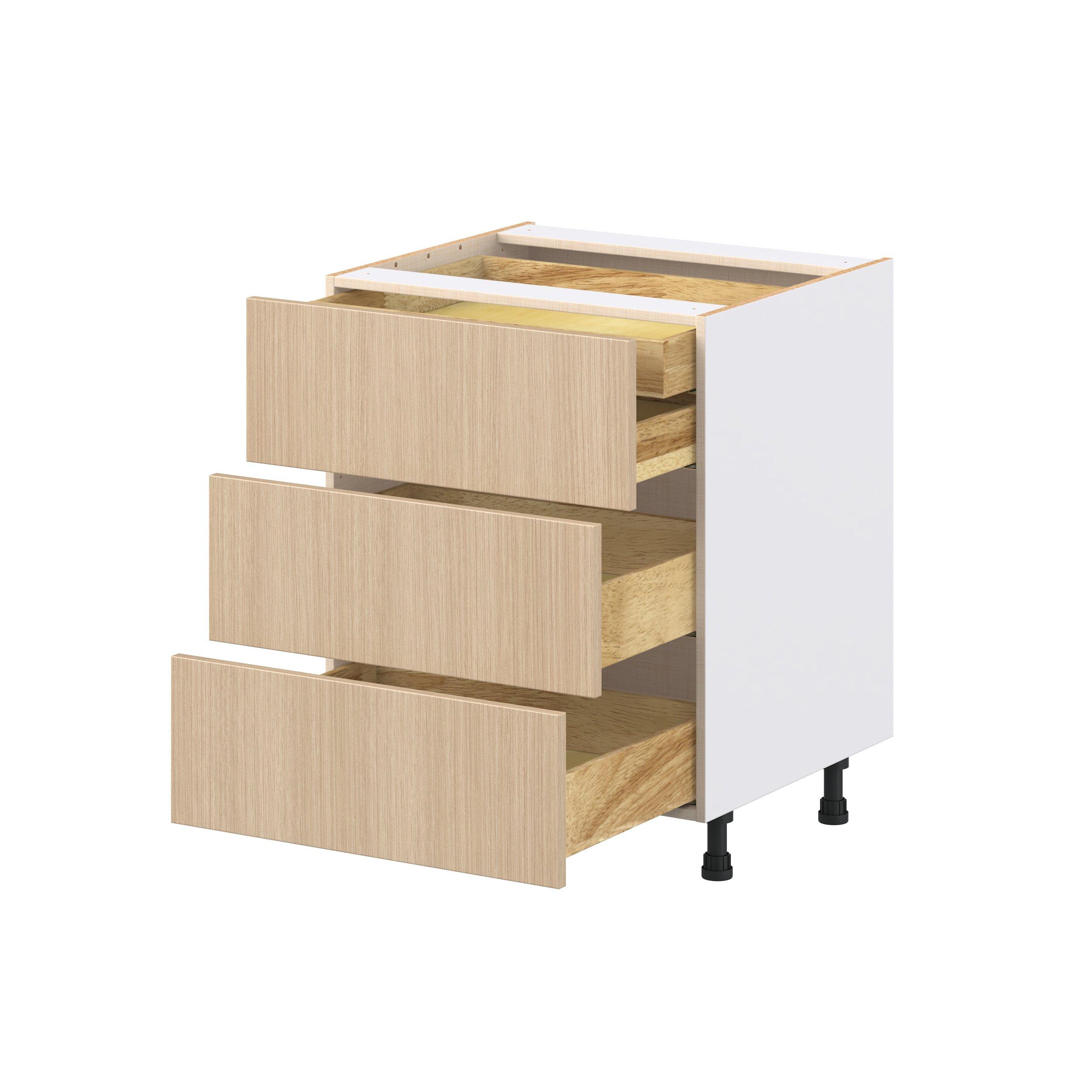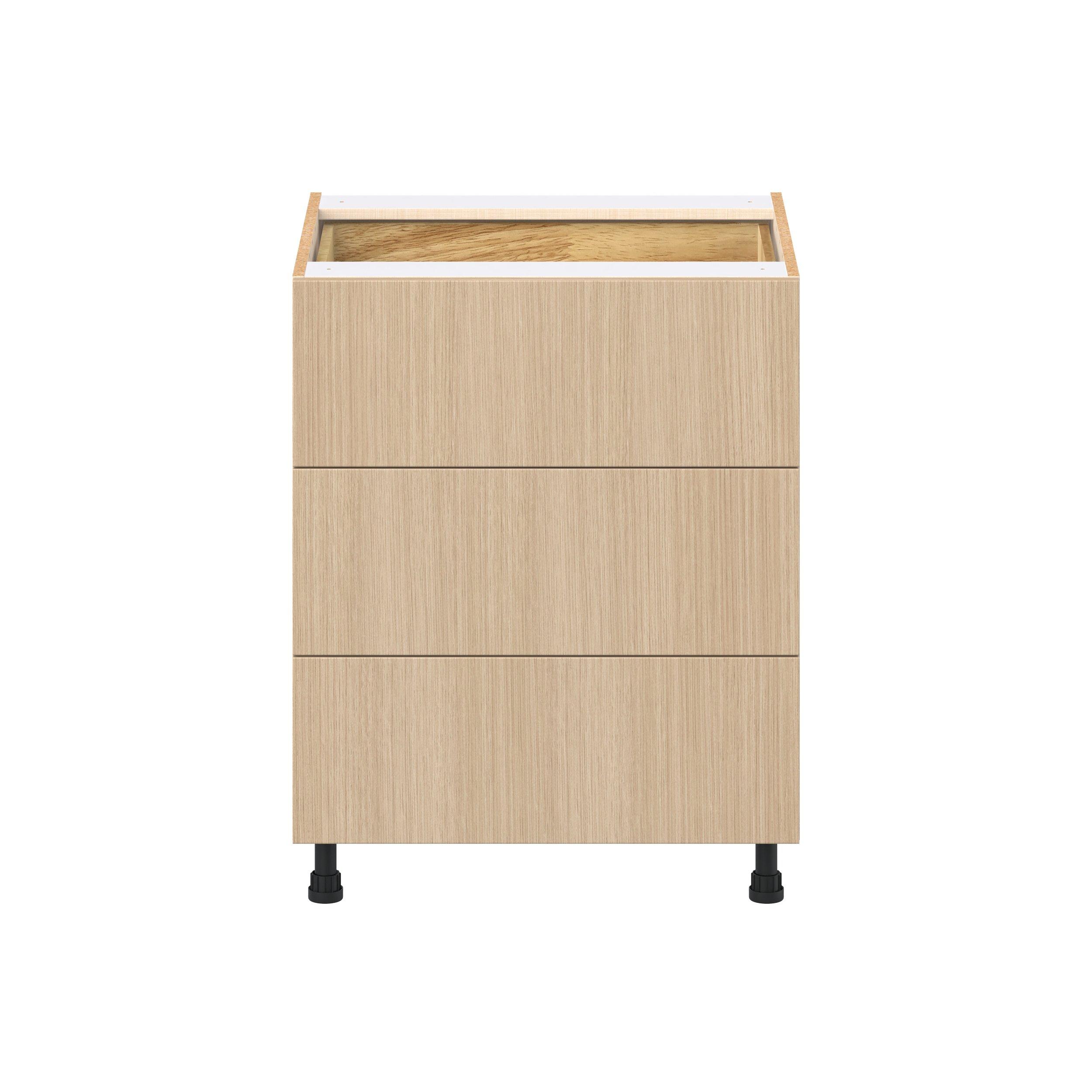 Elevate your project with the contemporary charm of Glenwood slab-style cabinets. Available in desert Mojavi oak and rich burnt walnut finishes, this collection captures the warmth and beauty of natural wood with the practicality of textured melamine. Crafted from one-piece MDF Studio Design Collection Glenwood 27 in. Mojavi Oak Base Cabinet with Inner Pull-Out Drawer is designed to resist hairline cracks while the easy-to-clean finish stands up to stains and moisture. Featuring 5-piece doors and dovetail drawer joints, these cabinets offer durability and elegance. This collection combines style with everyday storage solutions.