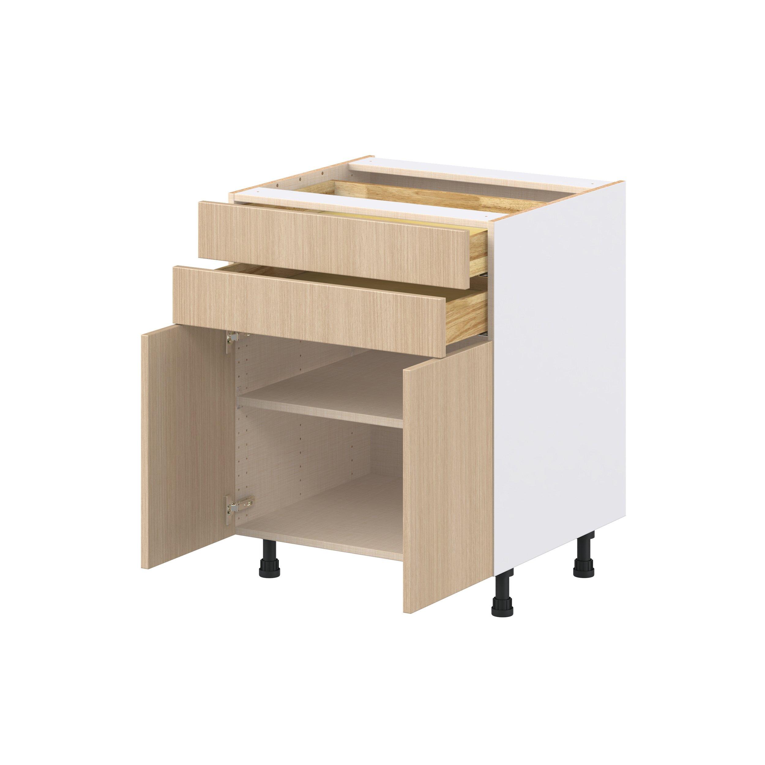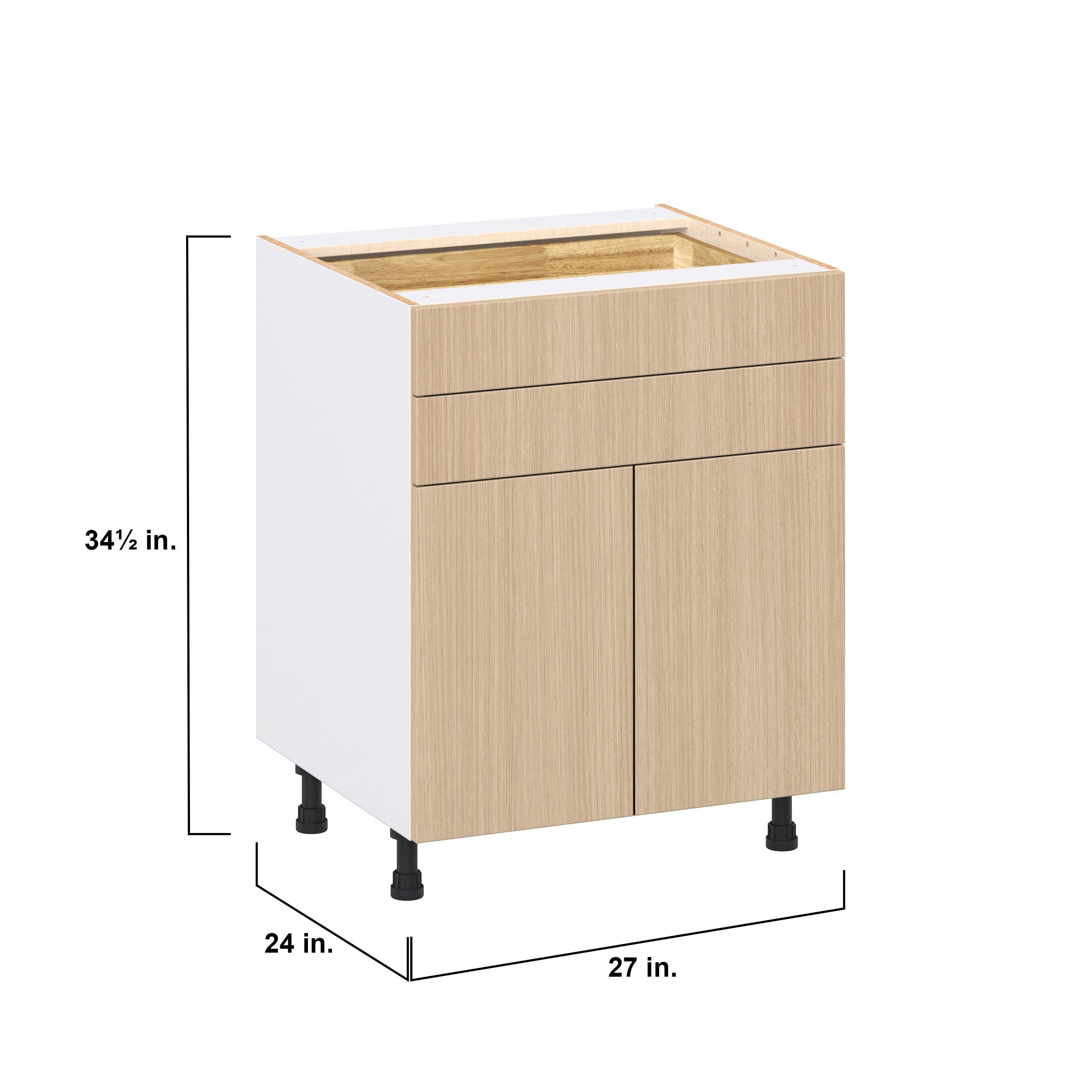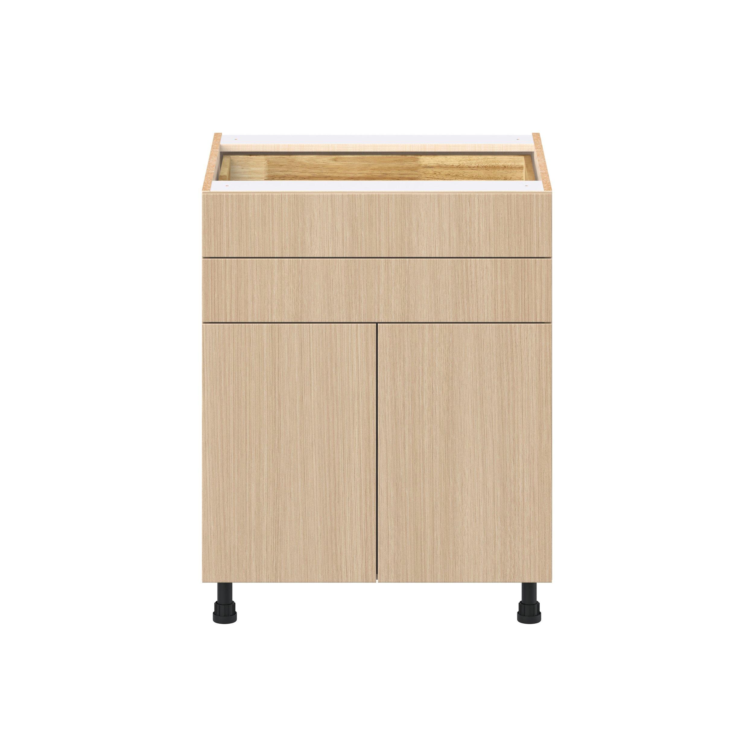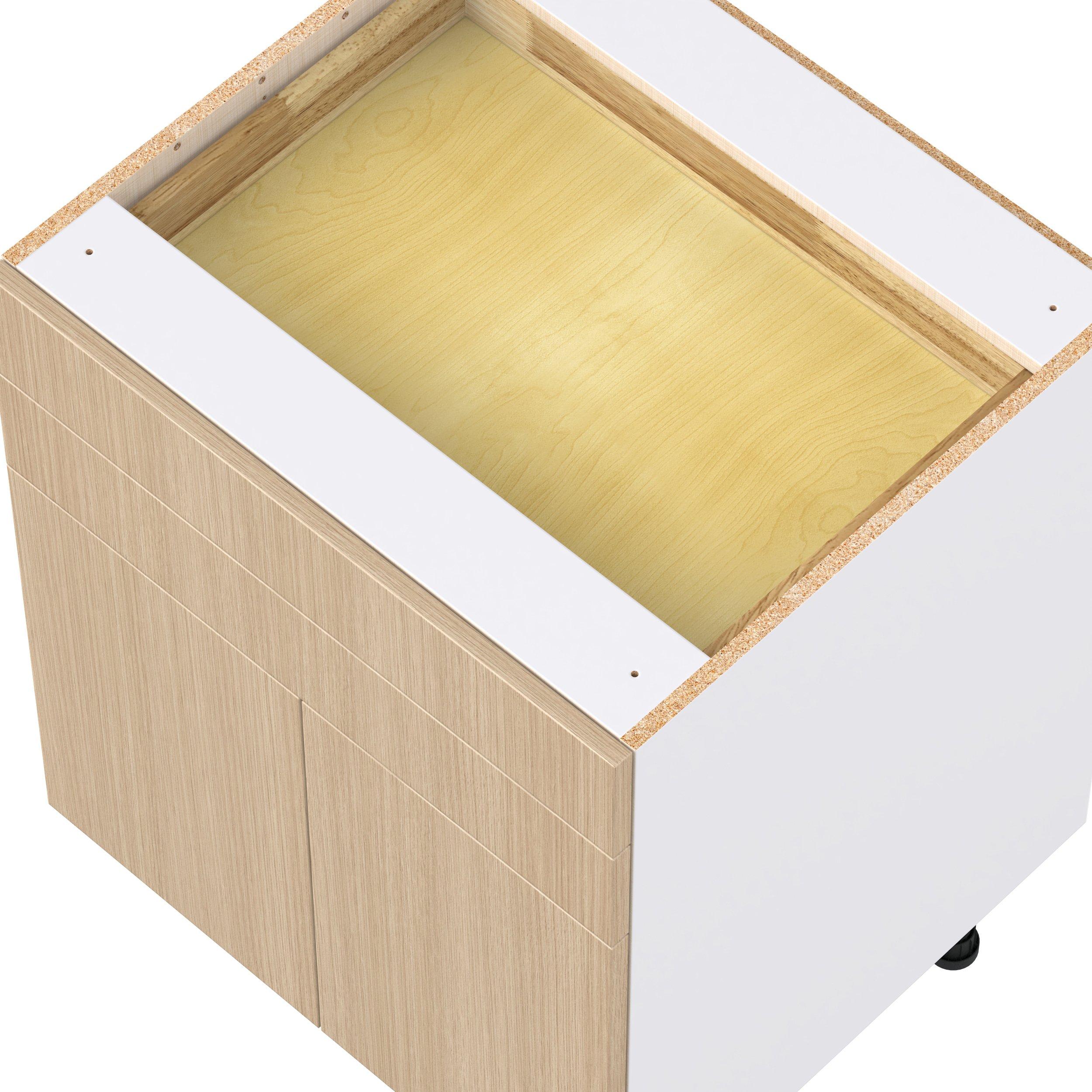 Elevate your project with the contemporary charm of Glenwood slab-style cabinets. Available in desert Mojavi oak and rich burnt walnut finishes, this collection captures the warmth and beauty of natural wood with the practicality of textured melamine. Crafted from one-piece MDF Studio Design Collection Glenwood 27 in. Mojavi Oak Door and Drawer Base Cabinet is designed to resist hairline cracks while the easy-to-clean finish stands up to stains and moisture. Featuring 5-piece doors and dovetail drawer joints, these cabinets offer durability and elegance. This collection combines style with everyday storage solutions.