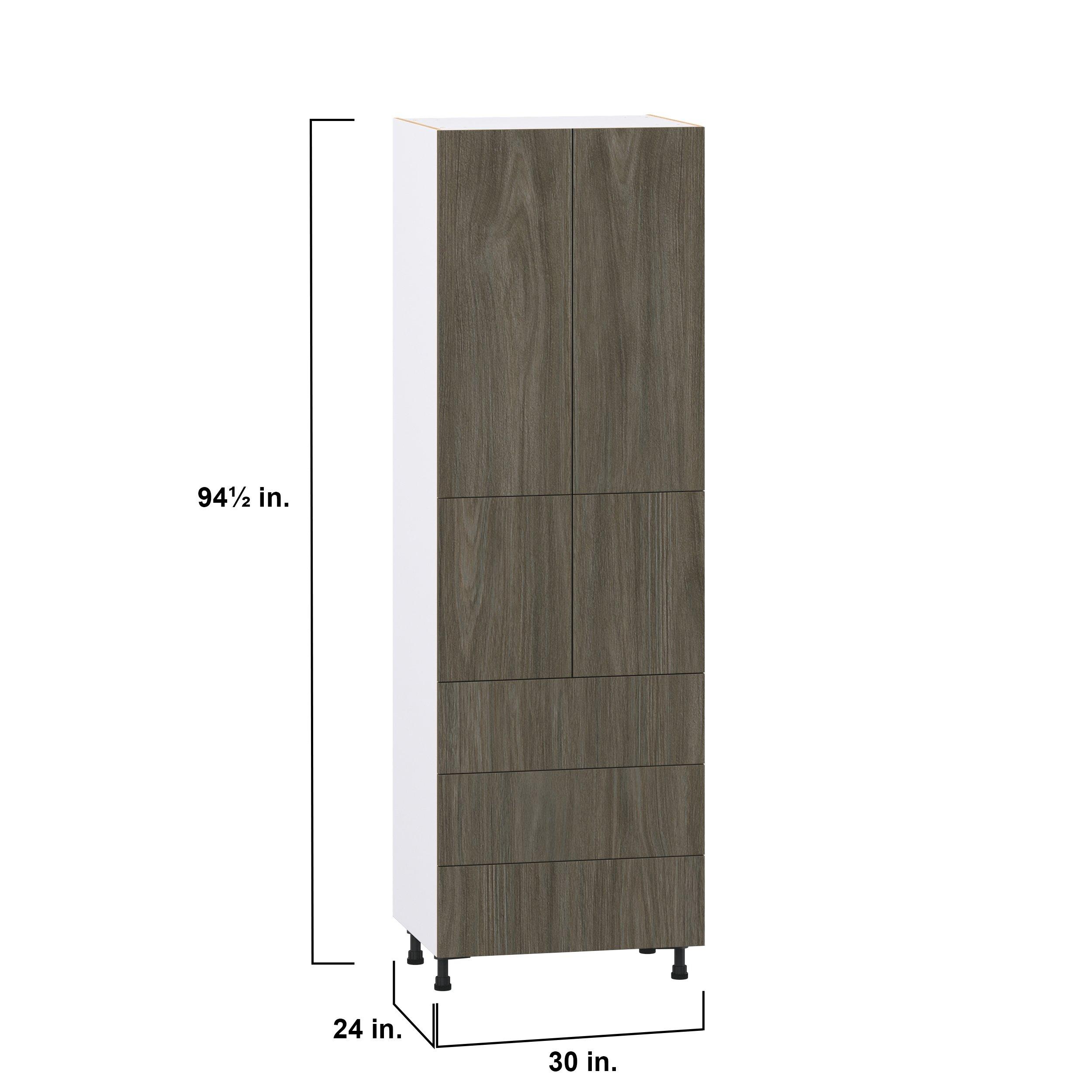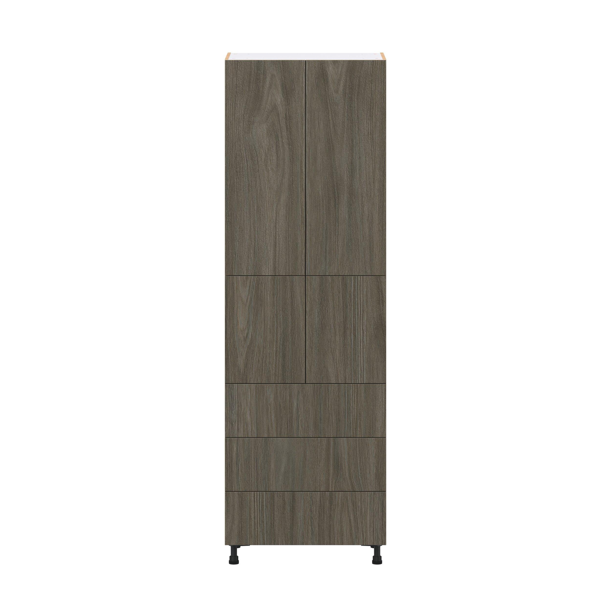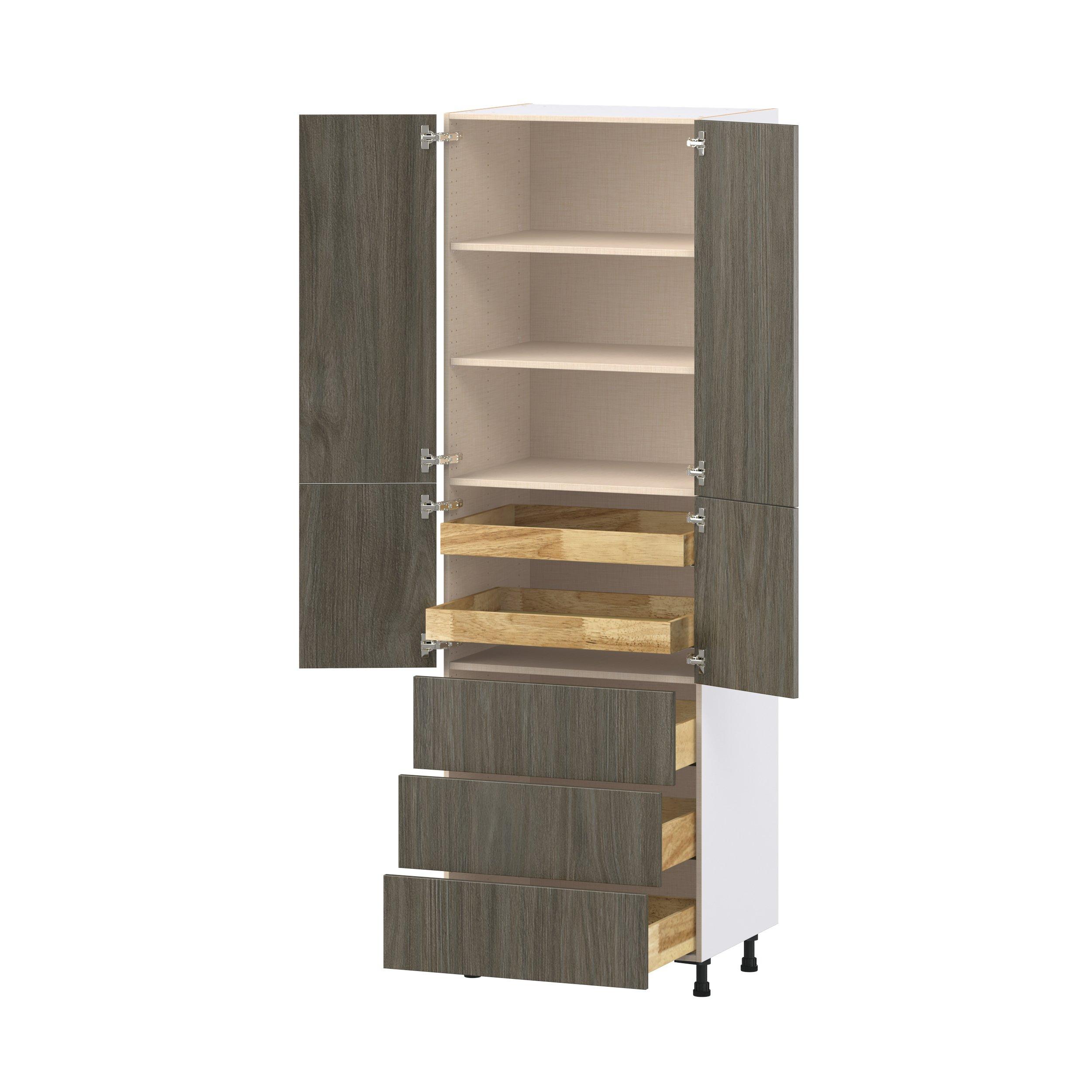 Elevate your project with the contemporary charm of Glenwood slab-style cabinets. Available in desert Mojavi oak and rich burnt walnut finishes, this collection captures the warmth and beauty of natural wood with the practicality of textured melamine. Crafted from one-piece MDF Studio Design Collection Glenwood 30 in. Burnt Walnut Door and Drawer Pantry Cabinet with Inner Pull-Out is designed to resist hairline cracks while the easy-to-clean finish stands up to stains and moisture. Featuring 5-piece doors and dovetail drawer joints, these cabinets offer durability and elegance. This collection combines style with everyday storage solutions.