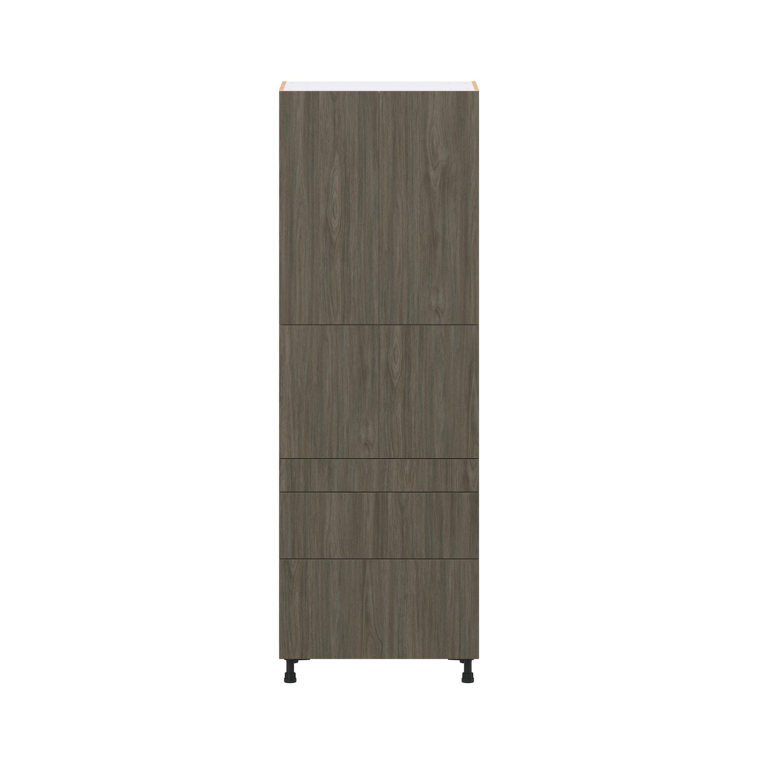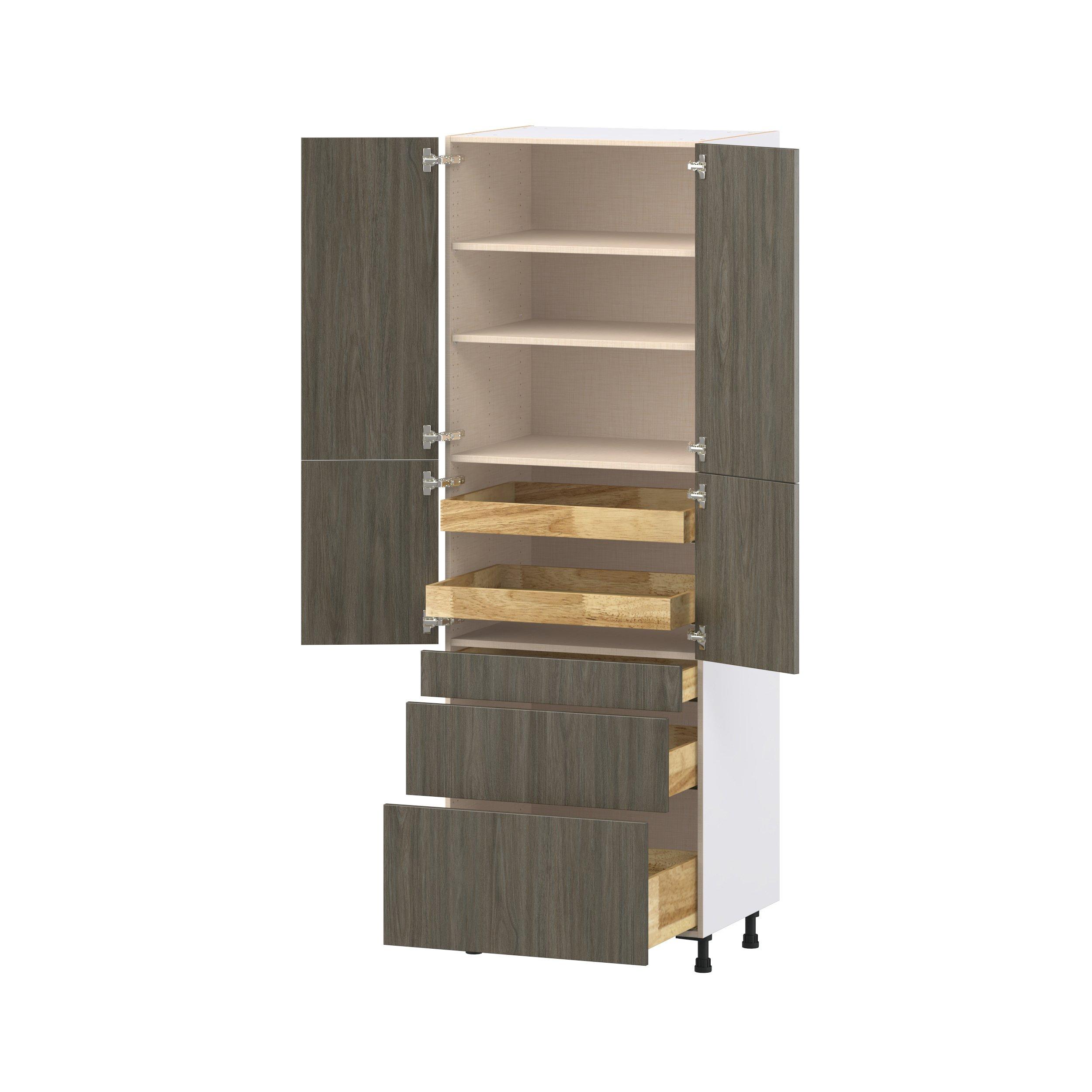 Elevate your project with the contemporary charm of Glenwood slab-style cabinets. Available in desert Mojavi oak and rich burnt walnut finishes, this collection captures the warmth and beauty of natural wood with the practicality of textured melamine. Crafted from one-piece MDF Studio Design Collection Glenwood 30 in. Burnt Walnut Door and Drawer Pantry Cabinet with Inner Pull-Out is designed to resist hairline cracks while the easy-to-clean finish stands up to stains and moisture. Featuring 5-piece doors and dovetail drawer joints, these cabinets offer durability and elegance. This collection combines style with everyday storage solutions.