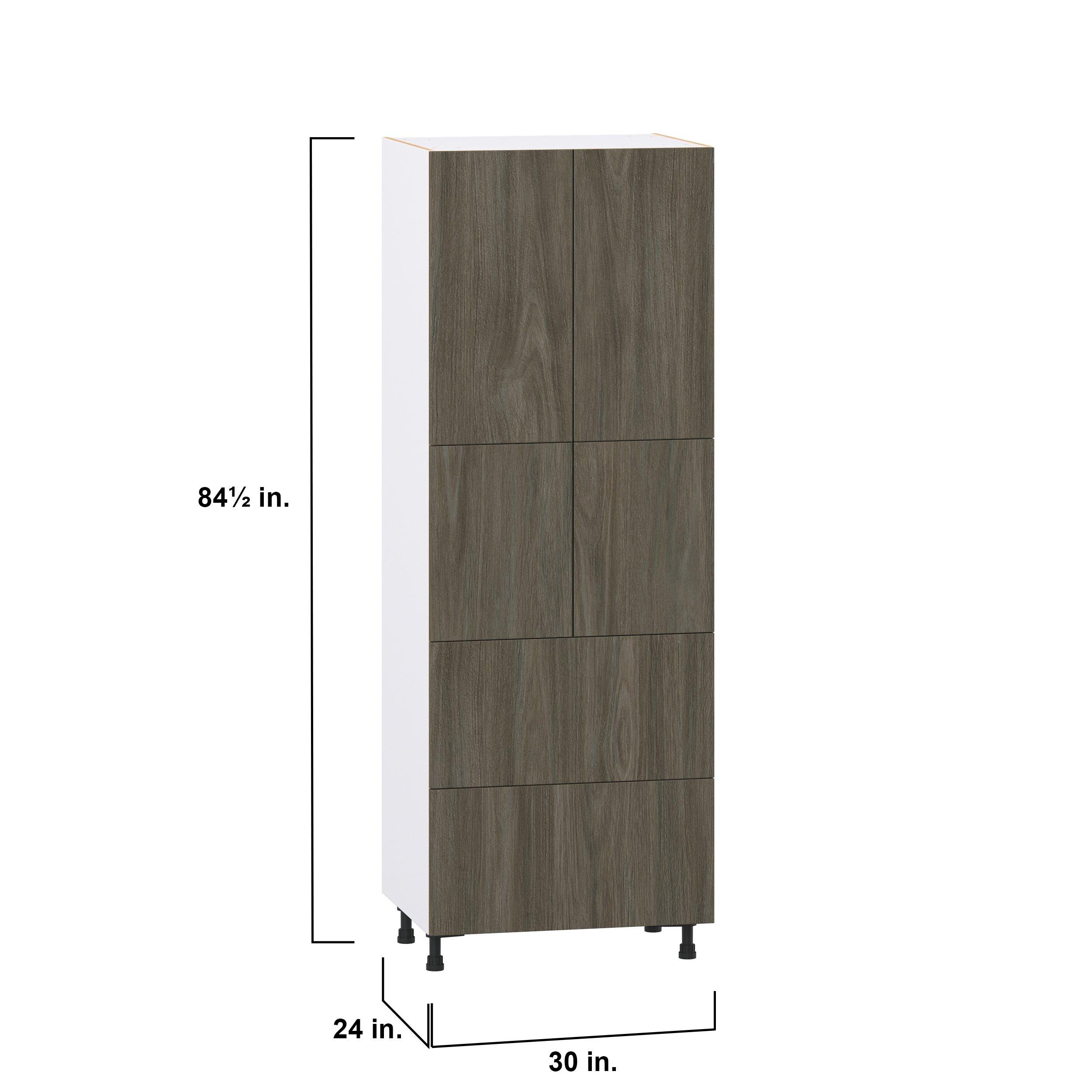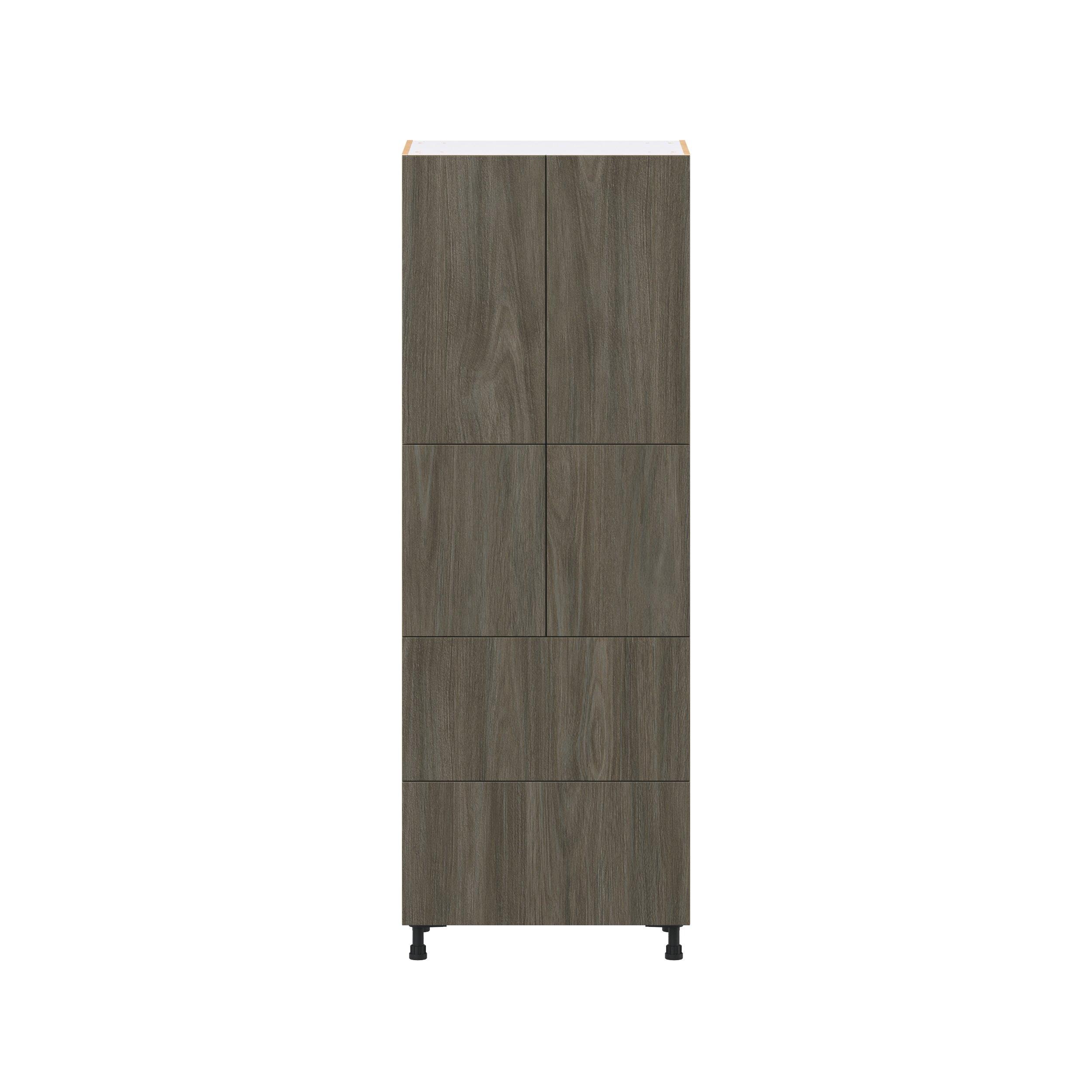 Elevate your project with the contemporary charm of Glenwood slab-style cabinets. Available in desert Mojavi oak and rich burnt walnut finishes, this collection captures the warmth and beauty of natural wood with the practicality of textured melamine. Crafted from one-piece MDF Studio Design Collection Glenwood 30 in. Burnt Walnut Door and Drawer Pantry Cabinet with Inner Pull-Out is designed to resist hairline cracks while the easy-to-clean finish stands up to stains and moisture. Featuring 5-piece doors and dovetail drawer joints, these cabinets offer durability and elegance. This collection combines style with everyday storage solutions.