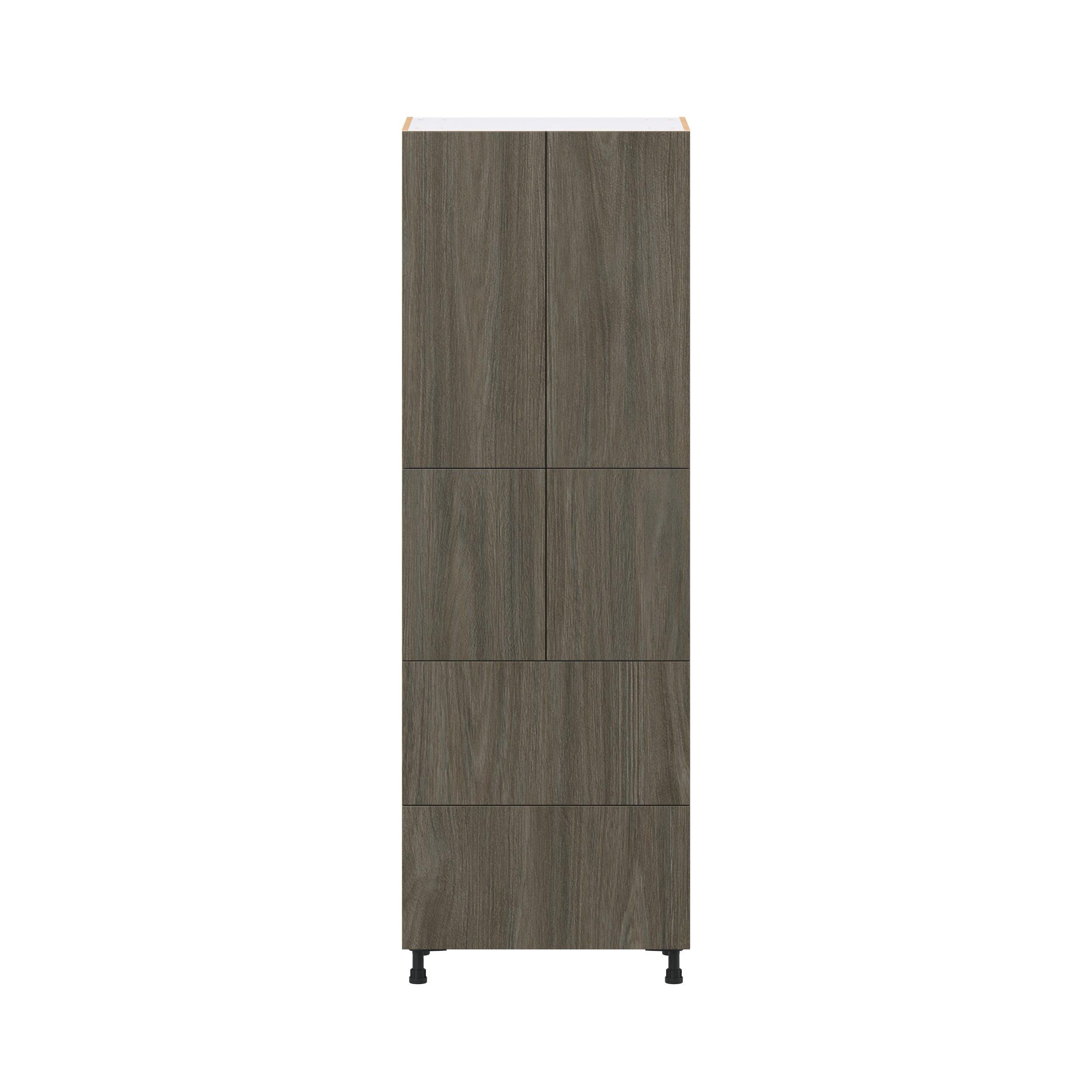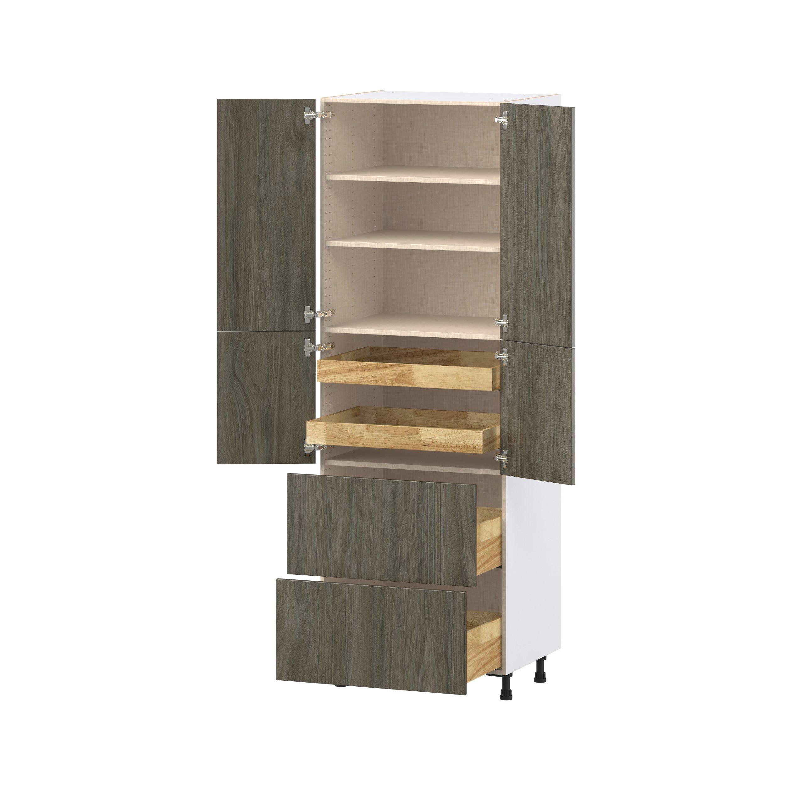 Elevate your project with the contemporary charm of Glenwood slab-style cabinets. Available in desert Mojavi oak and rich burnt walnut finishes, this collection captures the warmth and beauty of natural wood with the practicality of textured melamine. Crafted from one-piece MDF Studio Design Collection Glenwood 30 in. Burnt Walnut Door and Drawer Pantry Cabinet with Inner Pull-Out is designed to resist hairline cracks while the easy-to-clean finish stands up to stains and moisture. Featuring 5-piece doors and dovetail drawer joints, these cabinets offer durability and elegance. This collection combines style with everyday storage solutions.