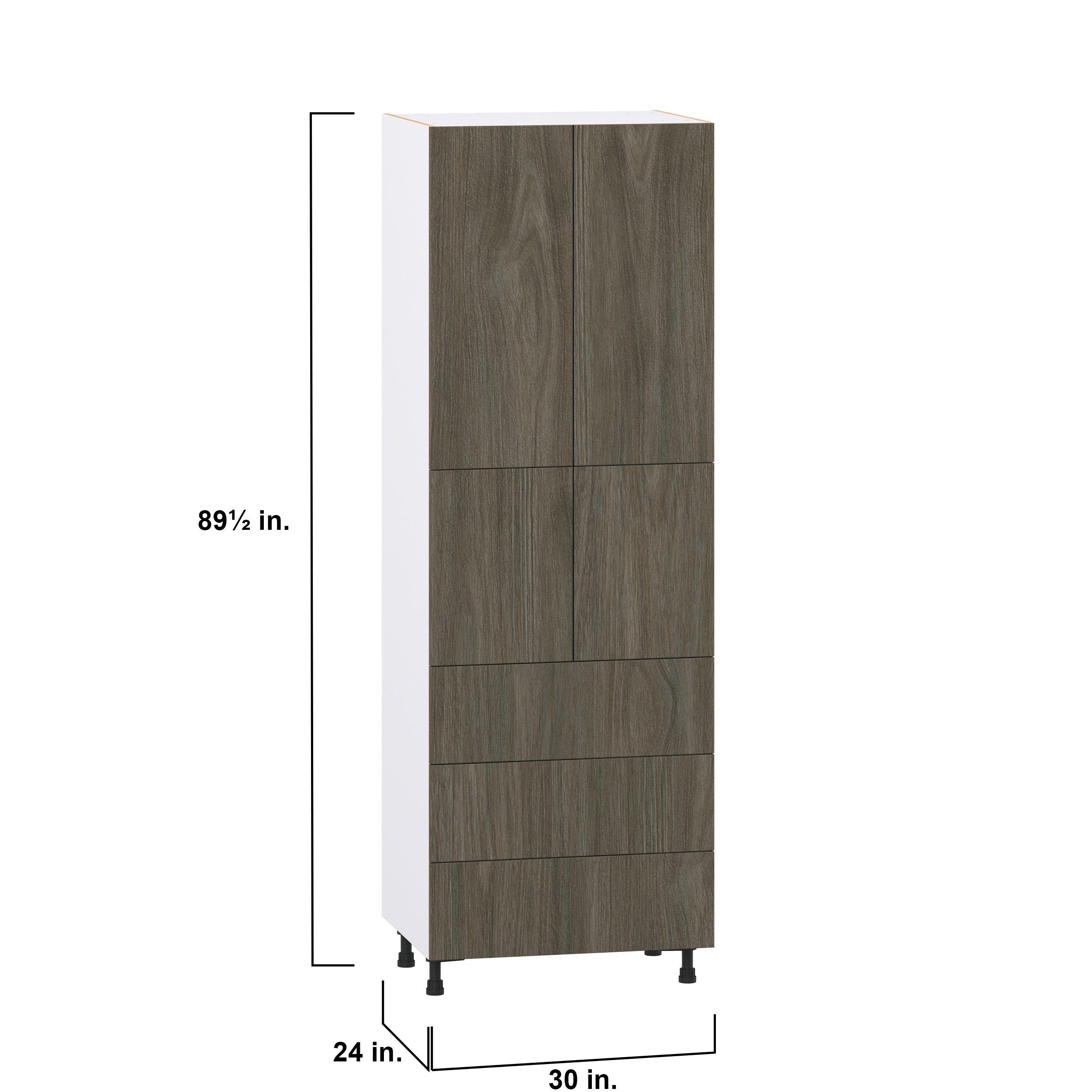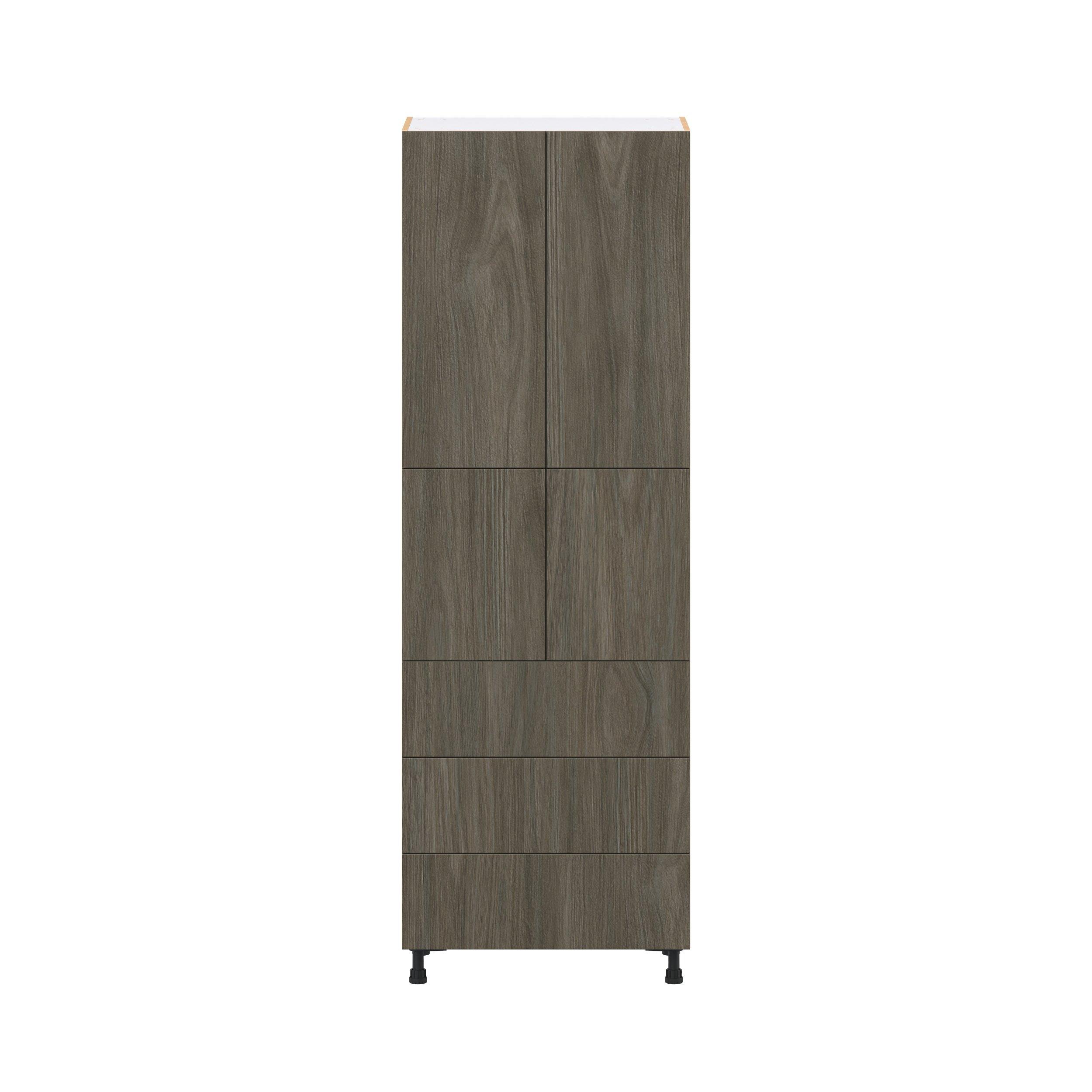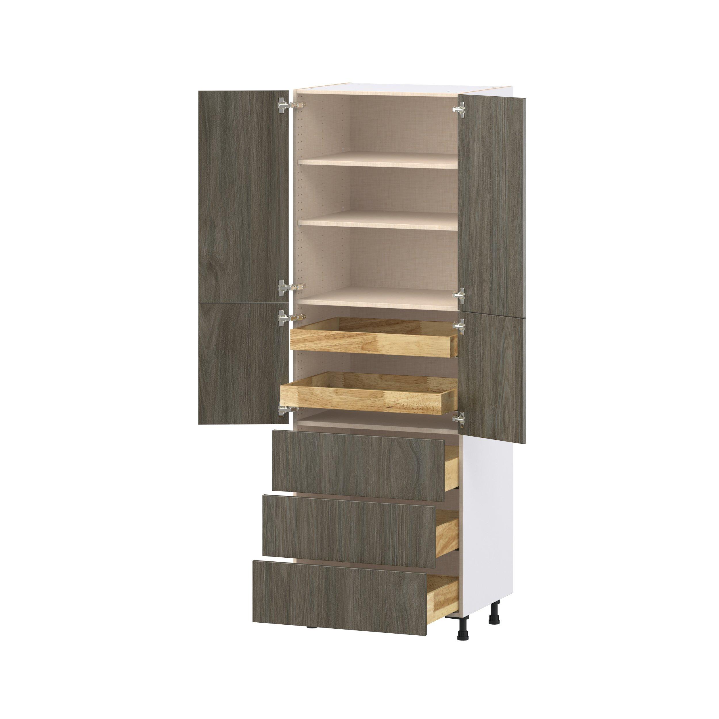 Elevate your project with the contemporary charm of Glenwood slab-style cabinets. Available in desert Mojavi oak and rich burnt walnut finishes, this collection captures the warmth and beauty of natural wood with the practicality of textured melamine. Crafted from one-piece MDF Studio Design Collection Glenwood 30 in. Burnt Walnut Door and Drawer Pantry Cabinet with Inner Pull-Out is designed to resist hairline cracks while the easy-to-clean finish stands up to stains and moisture. Featuring 5-piece doors and dovetail drawer joints, these cabinets offer durability and elegance. This collection combines style with everyday storage solutions.