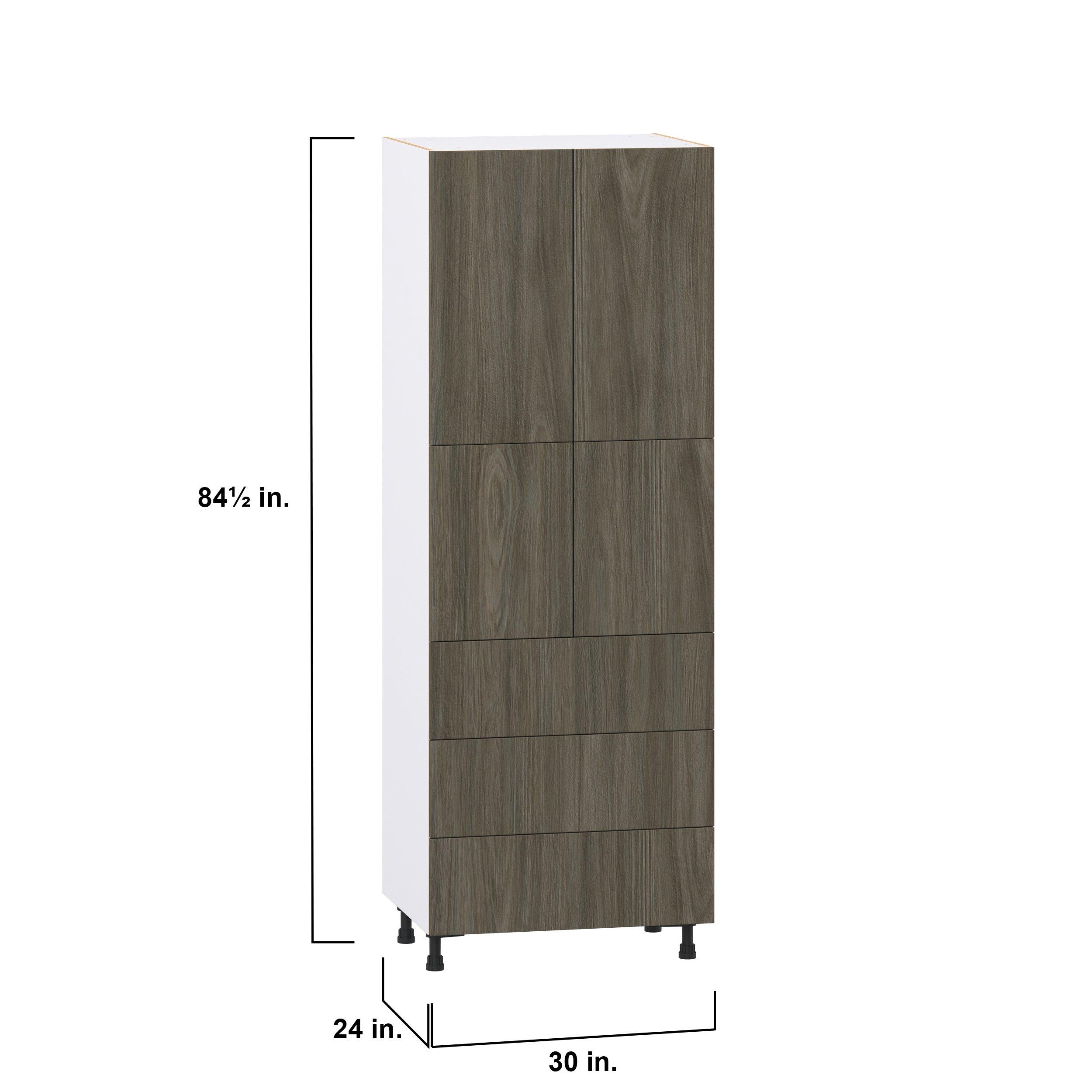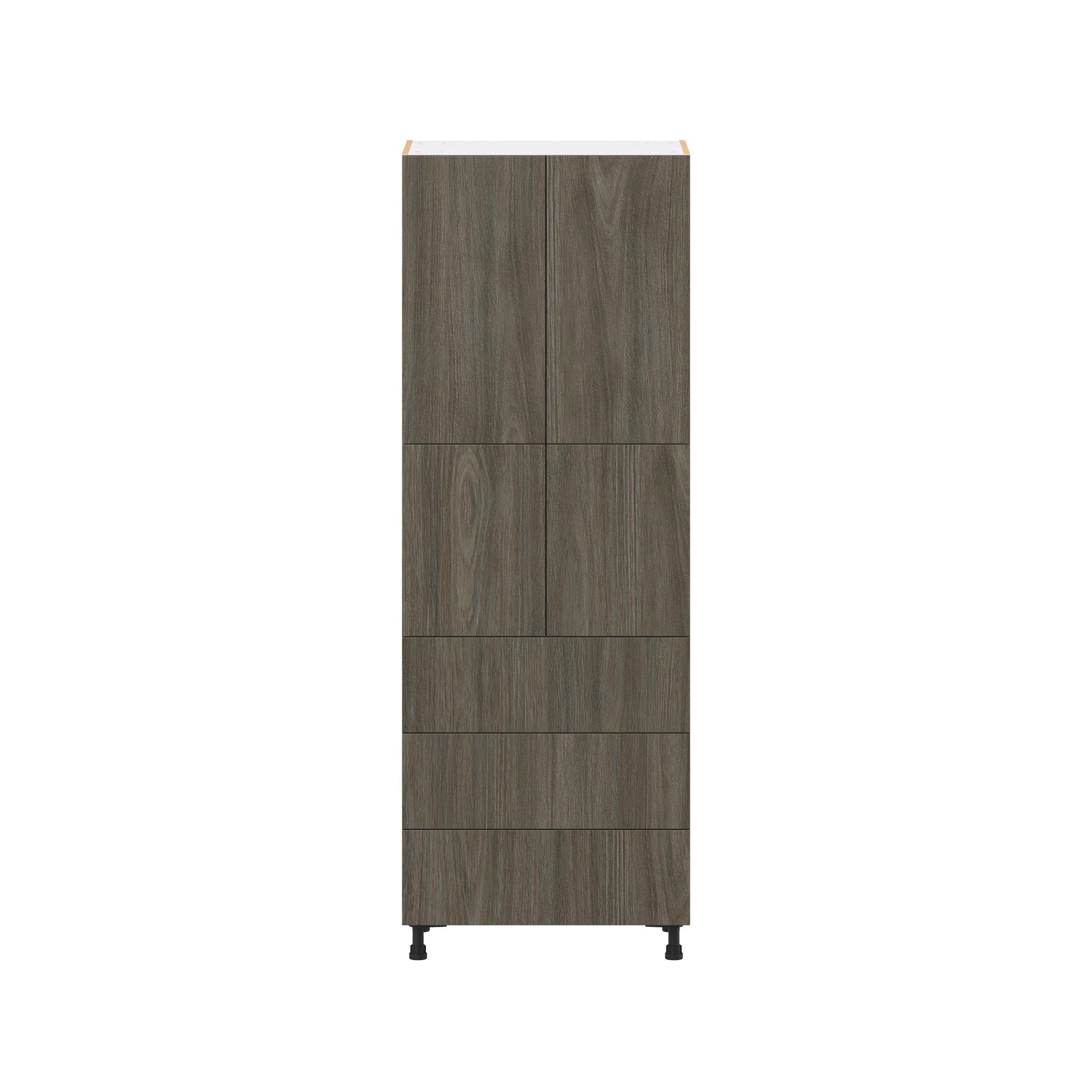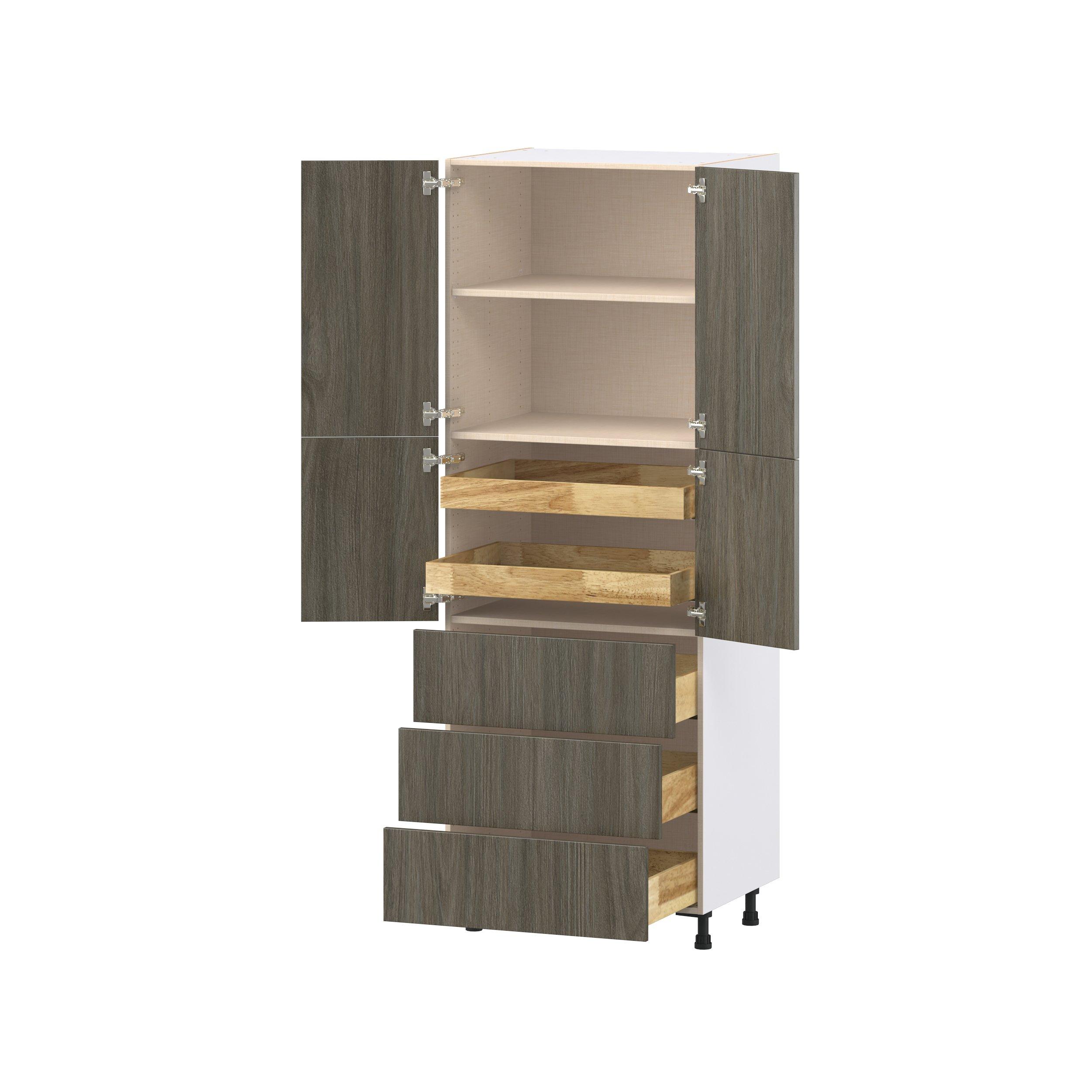 Elevate your project with the contemporary charm of Glenwood slab-style cabinets. Available in desert Mojavi oak and rich burnt walnut finishes, this collection captures the warmth and beauty of natural wood with the practicality of textured melamine. Crafted from one-piece MDF Studio Design Collection Glenwood 30 in. Burnt Walnut Door and Drawer Pantry Cabinet with Inner Pull-Out is designed to resist hairline cracks while the easy-to-clean finish stands up to stains and moisture. Featuring 5-piece doors and dovetail drawer joints, these cabinets offer durability and elegance. This collection combines style with everyday storage solutions.
