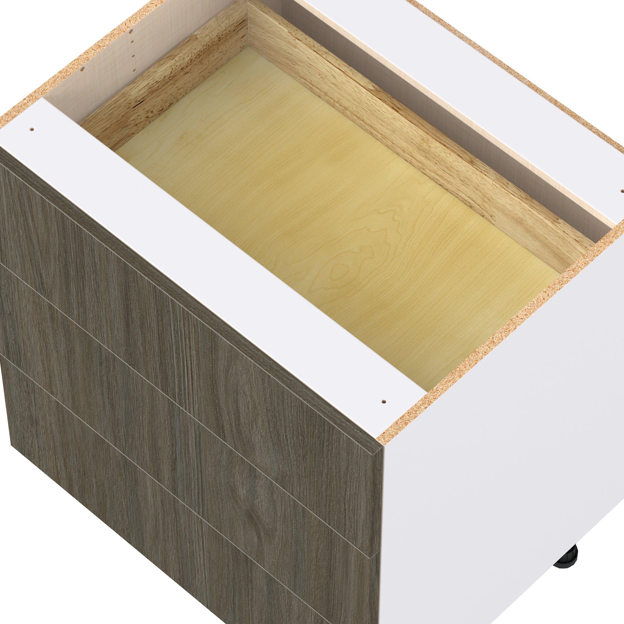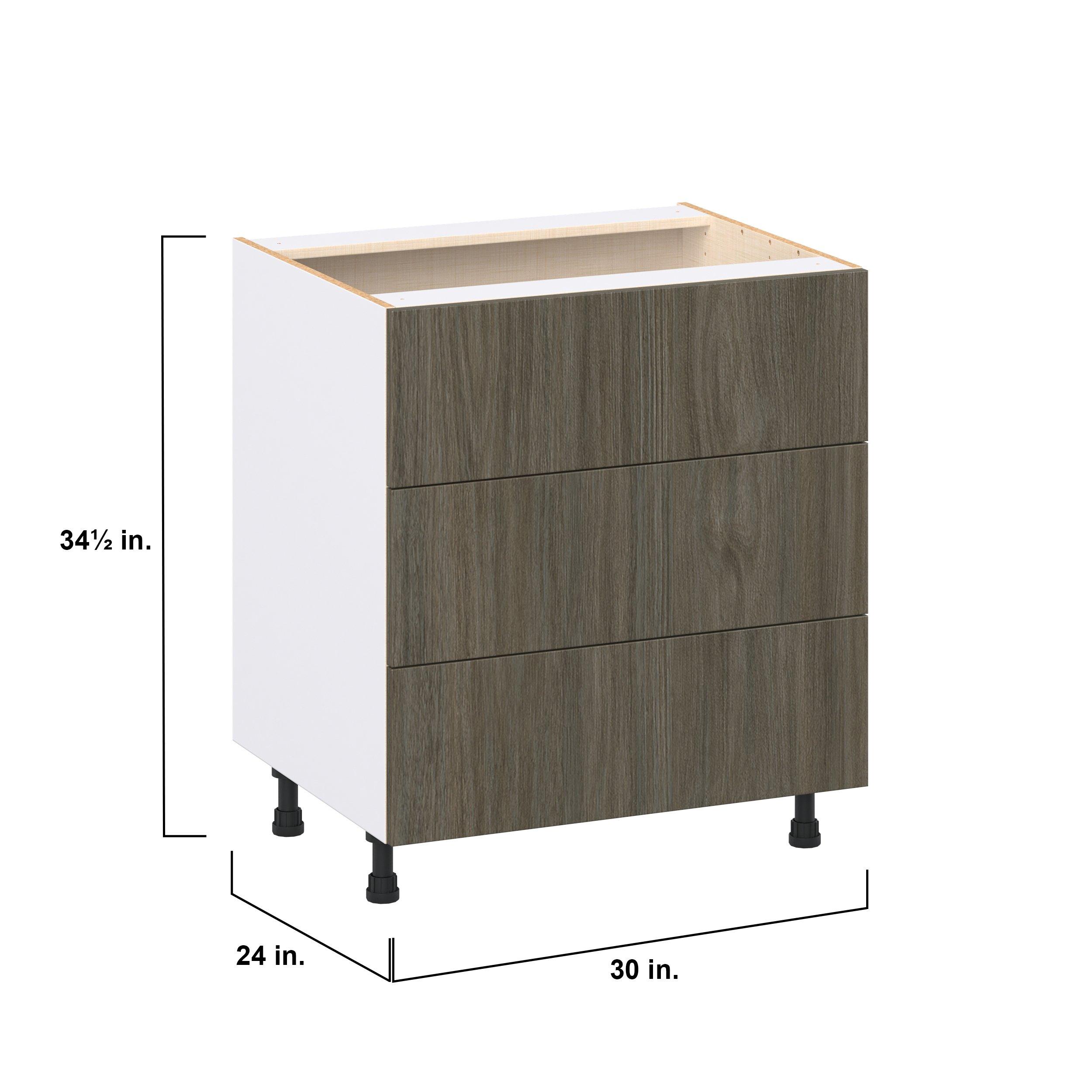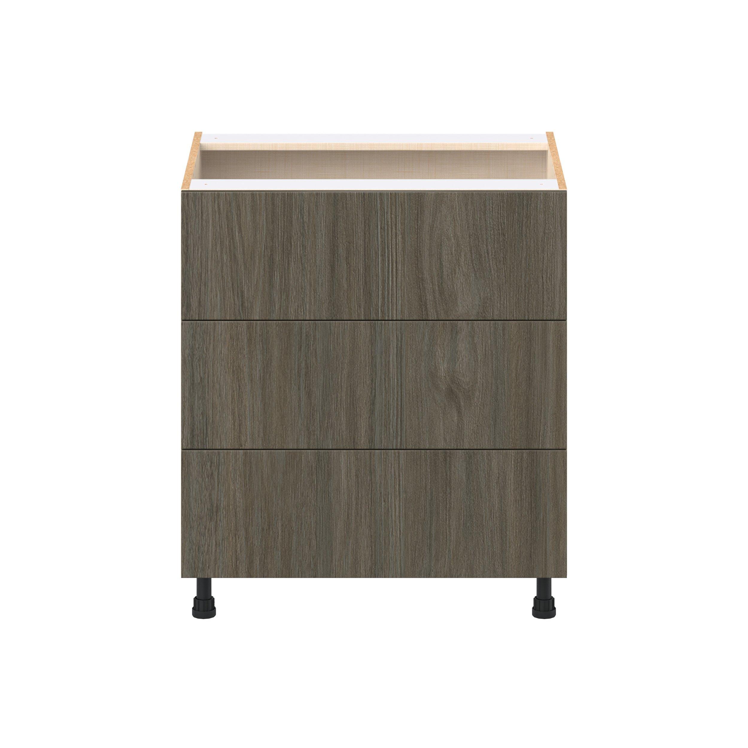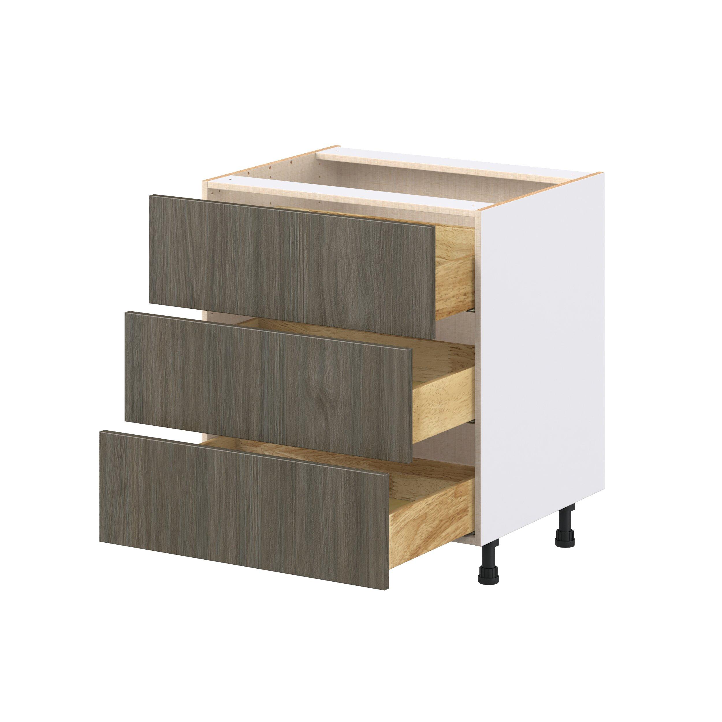 Elevate your project with the contemporary charm of Glenwood slab-style cabinets. Available in desert Mojavi oak and rich burnt walnut finishes, this collection captures the warmth and beauty of natural wood with the practicality of textured melamine. Crafted from one-piece MDF Studio Design Collection Glenwood 30 in. Burnt Walnut Drawer Base Cabinet is designed to resist hairline cracks while the easy-to-clean finish stands up to stains and moisture. Featuring 5-piece doors and dovetail drawer joints, these cabinets offer durability and elegance. This collection combines style with everyday storage solutions.