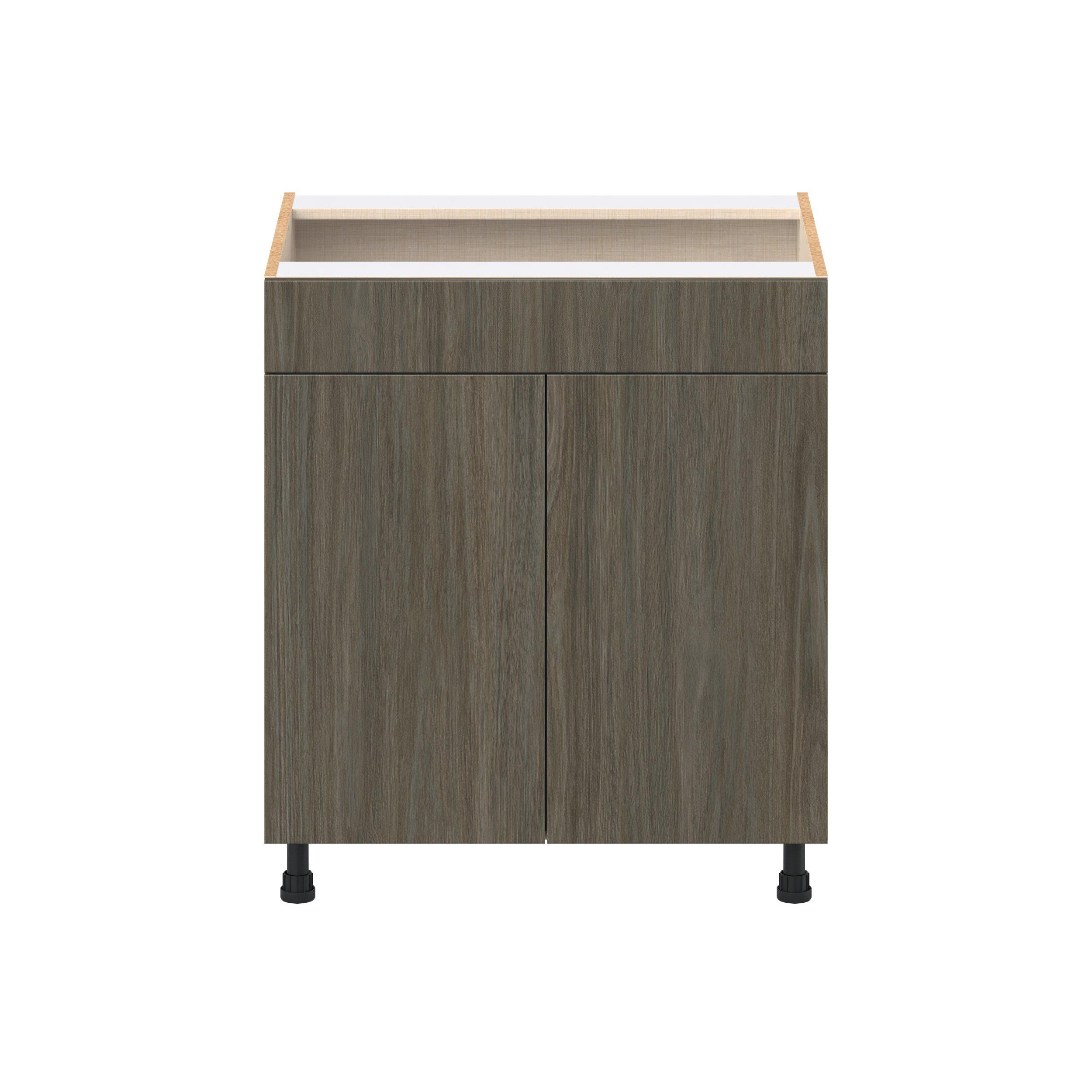 Elevate your project with the contemporary charm of Glenwood slab-style cabinets. Available in desert Mojavi oak and rich burnt walnut finishes, this collection captures the warmth and beauty of natural wood with the practicality of textured melamine. Crafted from one-piece MDF Studio Design Collection Glenwood 30 in. Burnt Walnut Sink Base Cabinet with False Front is designed to resist hairline cracks while the easy-to-clean finish stands up to stains and moisture. Featuring 5-piece doors and dovetail drawer joints, these cabinets offer durability and elegance. This collection combines style with everyday storage solutions.