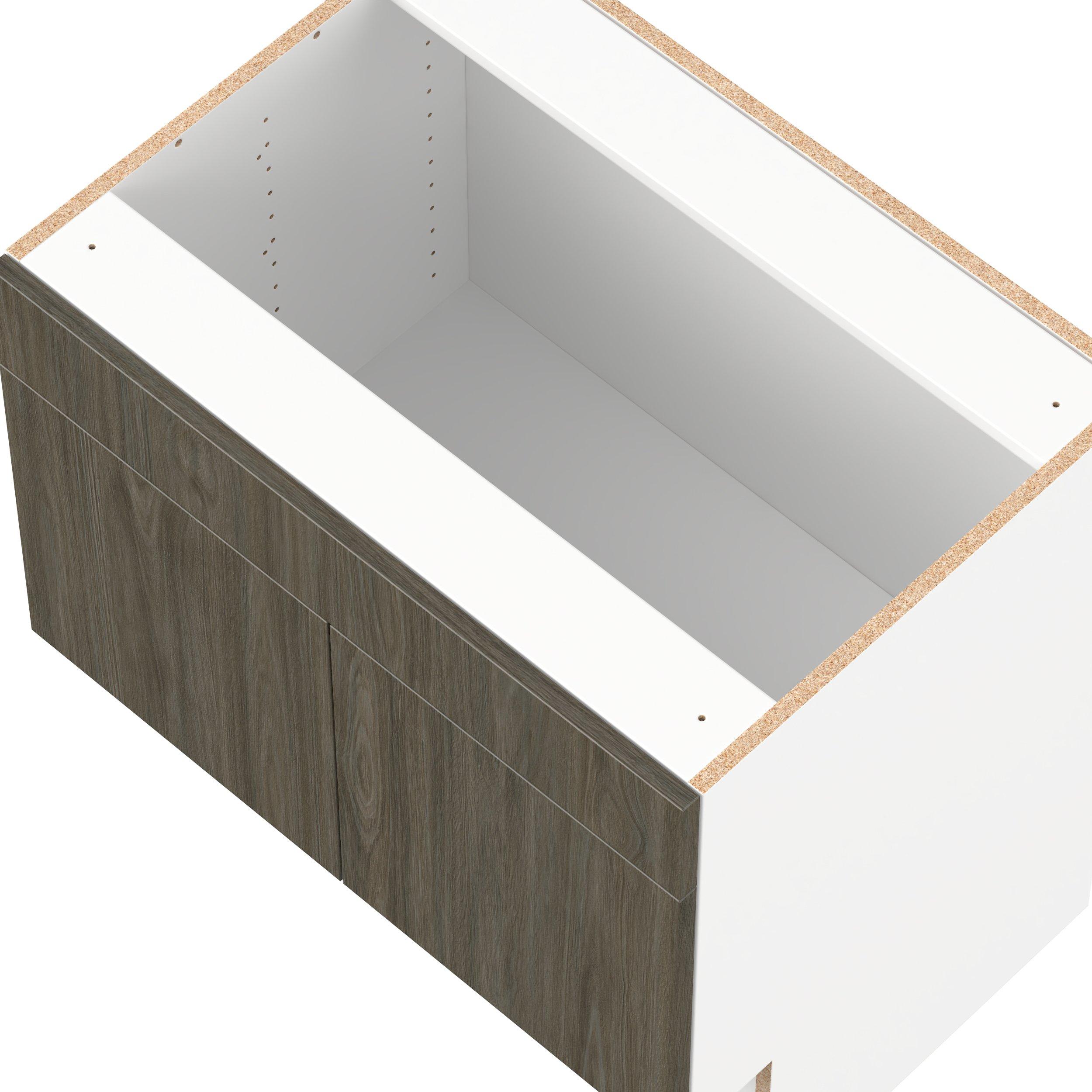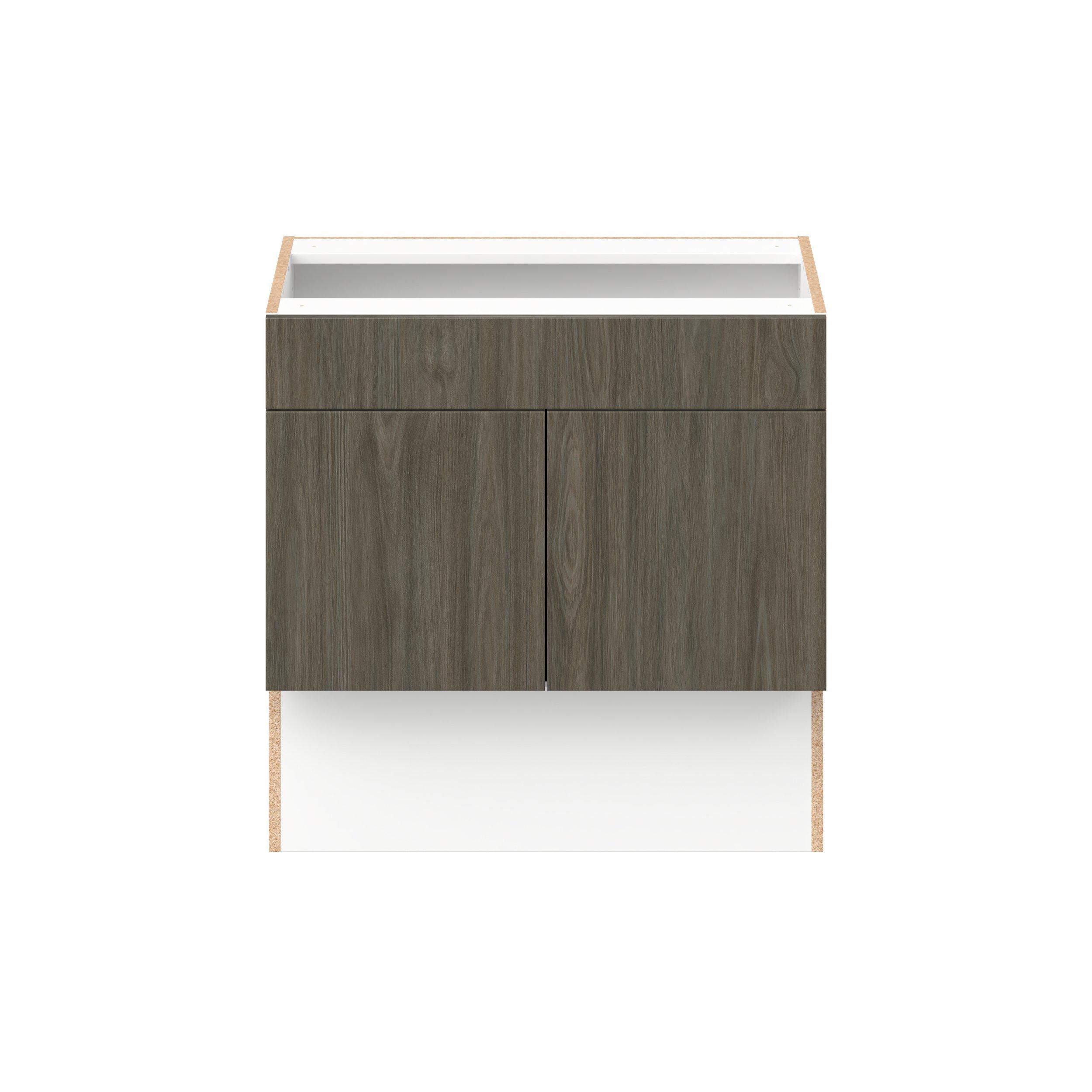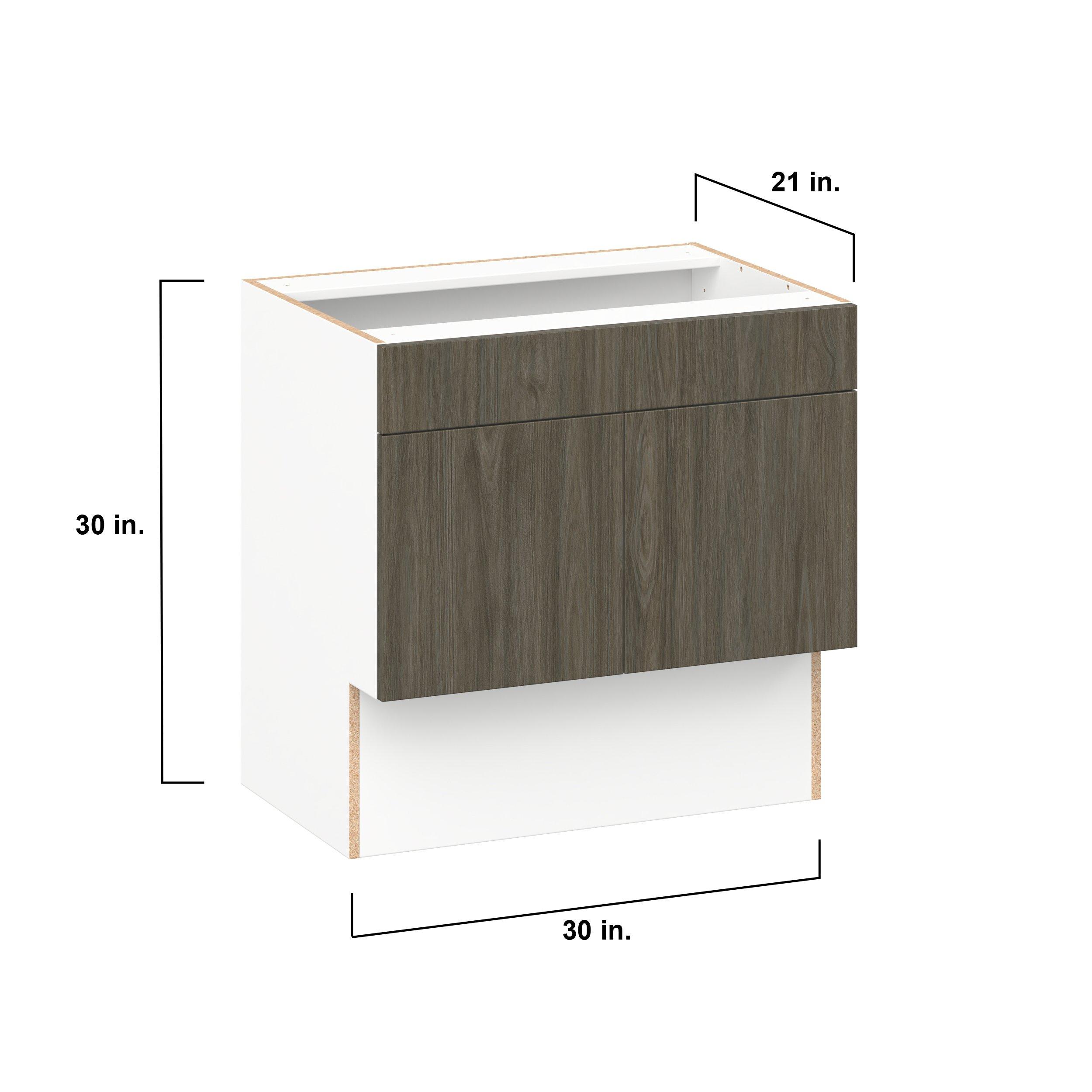 Elevate your project with the contemporary charm of Glenwood slab-style cabinets. Available in desert Mojavi oak and rich burnt walnut finishes, this collection captures the warmth and beauty of natural wood with the practicality of textured melamine. Crafted from one-piece MDF Studio Design Collection Glenwood 30 in. Burnt Walnut Vanity Sink Base Cabinet with False Front - ADA is designed to resist hairline cracks while the easy-to-clean finish stands up to stains and moisture. Featuring 5-piece doors and dovetail drawer joints, these cabinets offer durability and elegance. This collection combines style with everyday storage solutions.