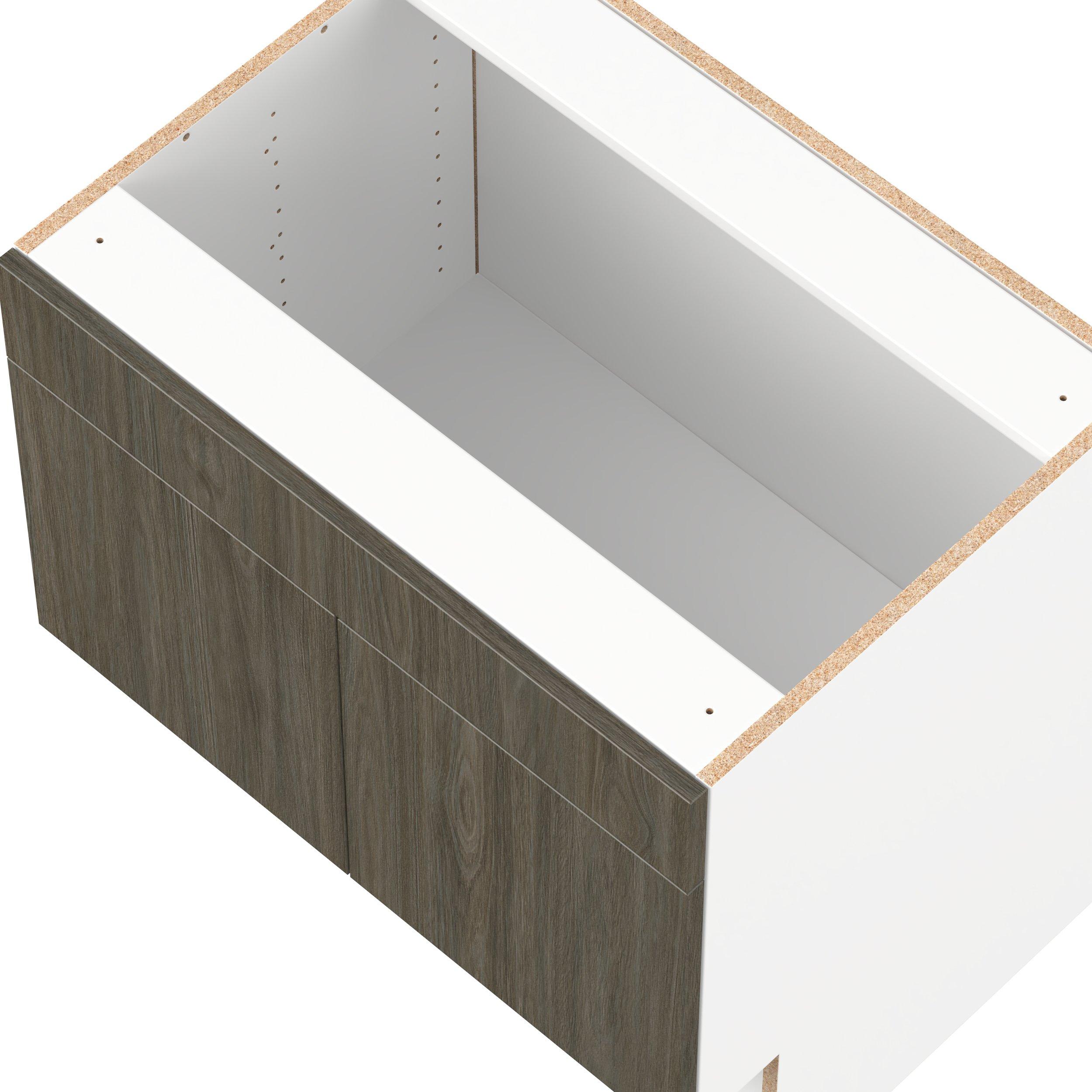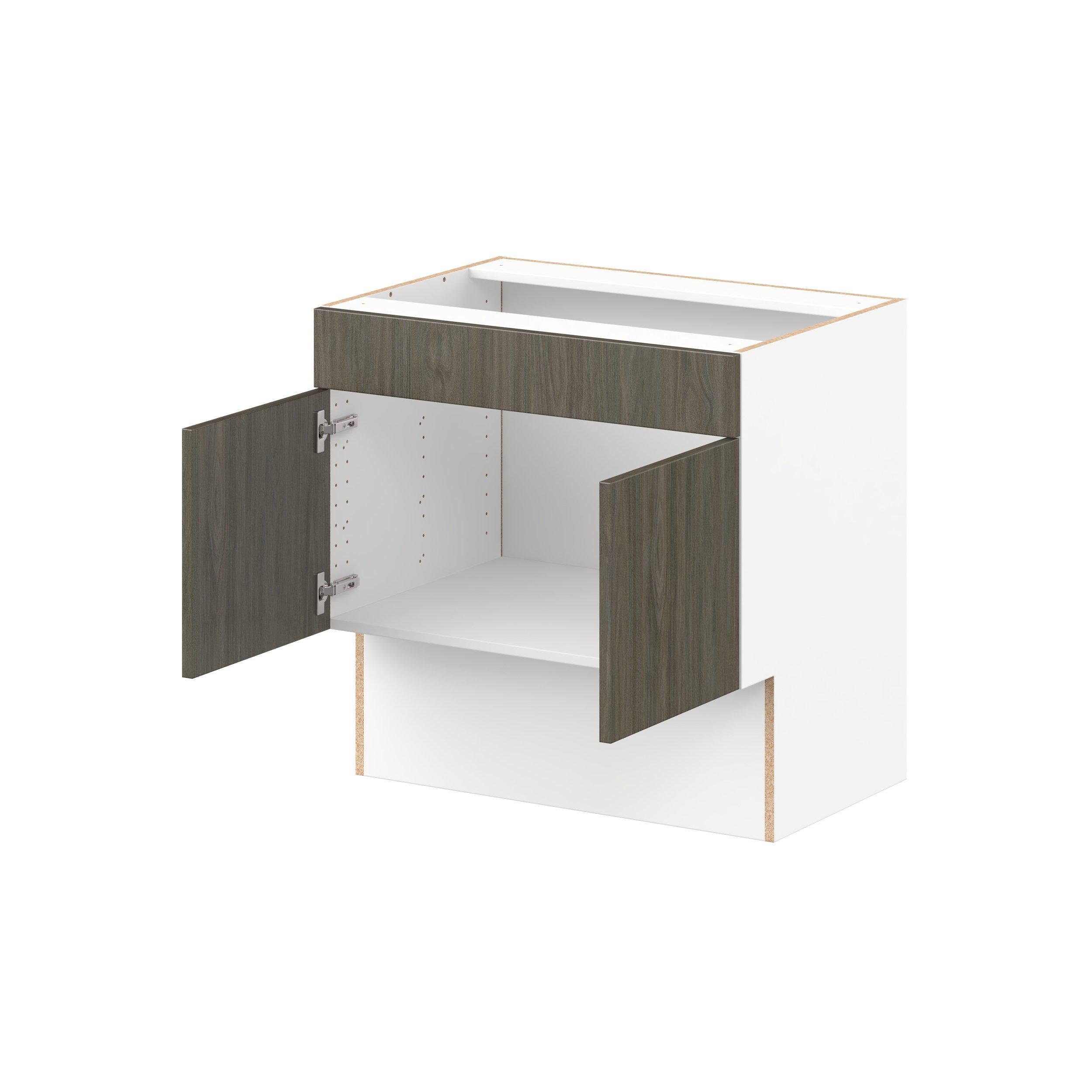 Elevate your project with the contemporary charm of Glenwood slab-style cabinets. Available in desert Mojavi oak and rich burnt walnut finishes, this collection captures the warmth and beauty of natural wood with the practicality of textured melamine. Crafted from one-piece MDF Studio Design Collection Glenwood 30 in. Burnt Walnut Vanity Sink Base Cabinet with Removable Front - ADA is designed to resist hairline cracks while the easy-to-clean finish stands up to stains and moisture. Featuring 5-piece doors and dovetail drawer joints, these cabinets offer durability and elegance. This collection combines style with everyday storage solutions.