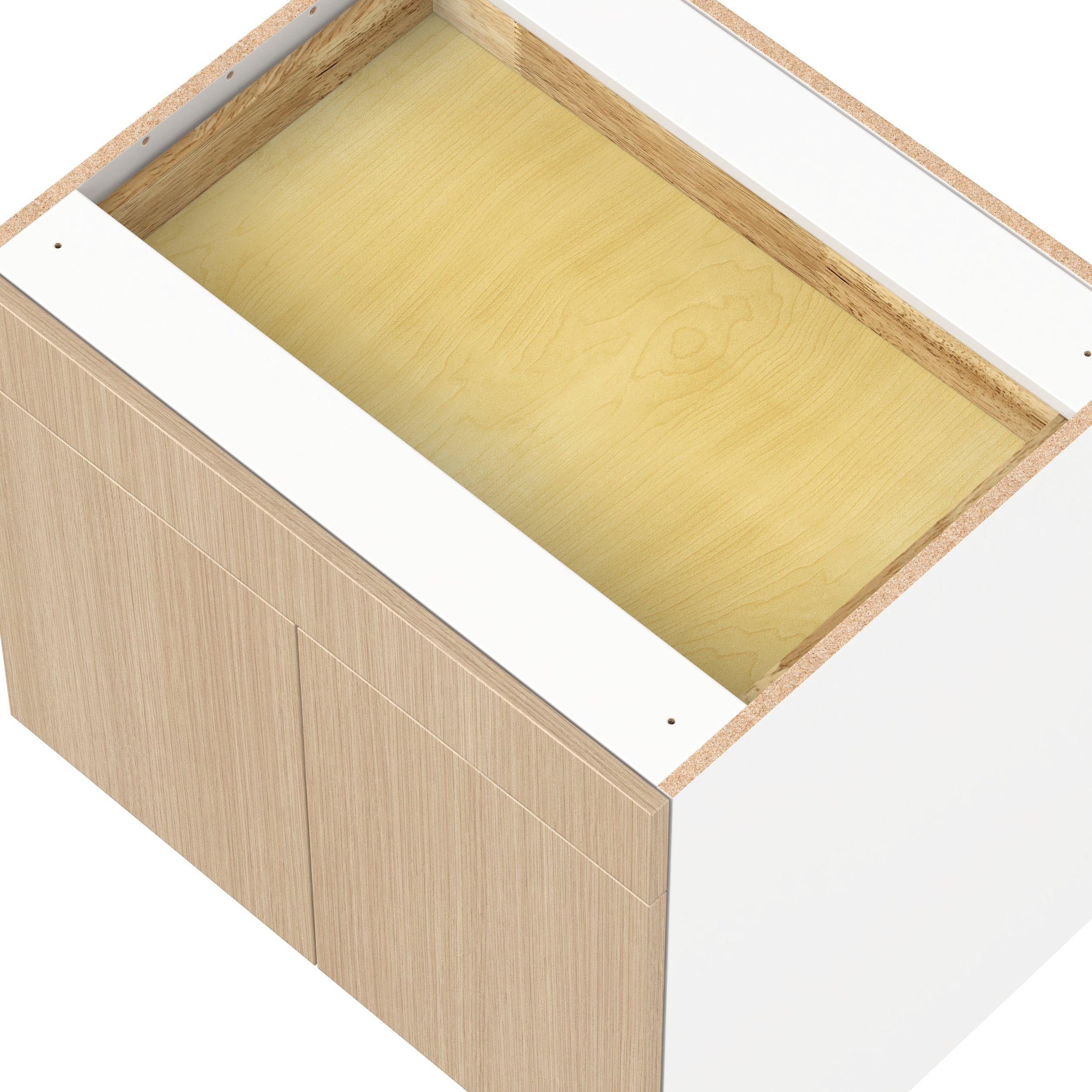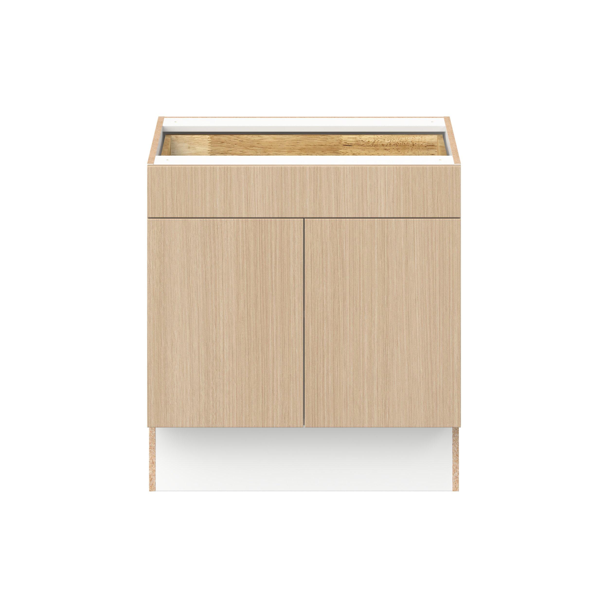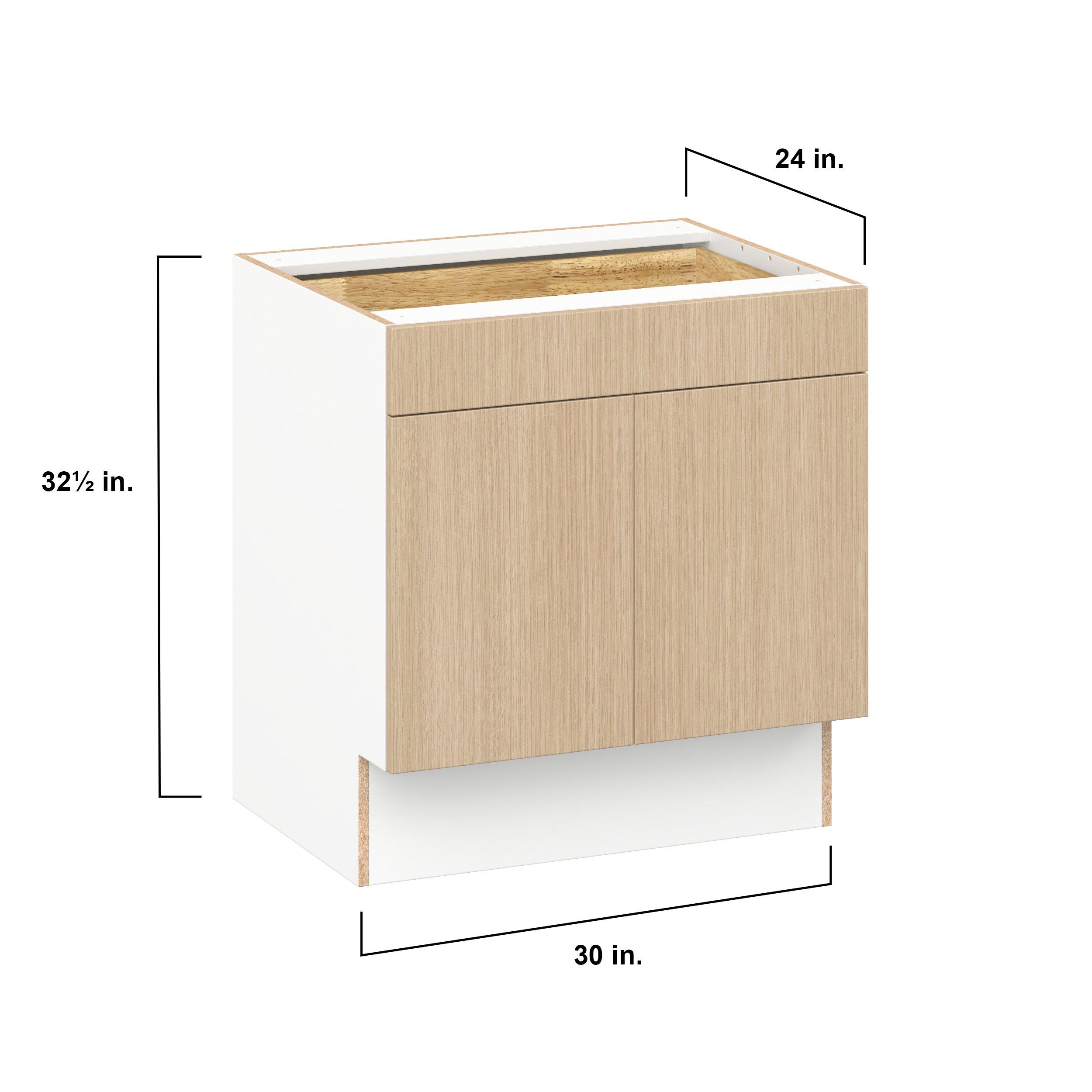 Elevate your project with the contemporary charm of Glenwood slab-style cabinets. Available in desert Mojavi oak and rich burnt walnut finishes, this collection captures the warmth and beauty of natural wood with the practicality of textured melamine. Crafted from one-piece MDF Studio Design Collection Glenwood 30 in. Mojavi Oak Door and Drawer Base Cabinet - ADA is designed to resist hairline cracks while the easy-to-clean finish stands up to stains and moisture. Featuring 5-piece doors and dovetail drawer joints, these cabinets offer durability and elegance. This collection combines style with everyday storage solutions.