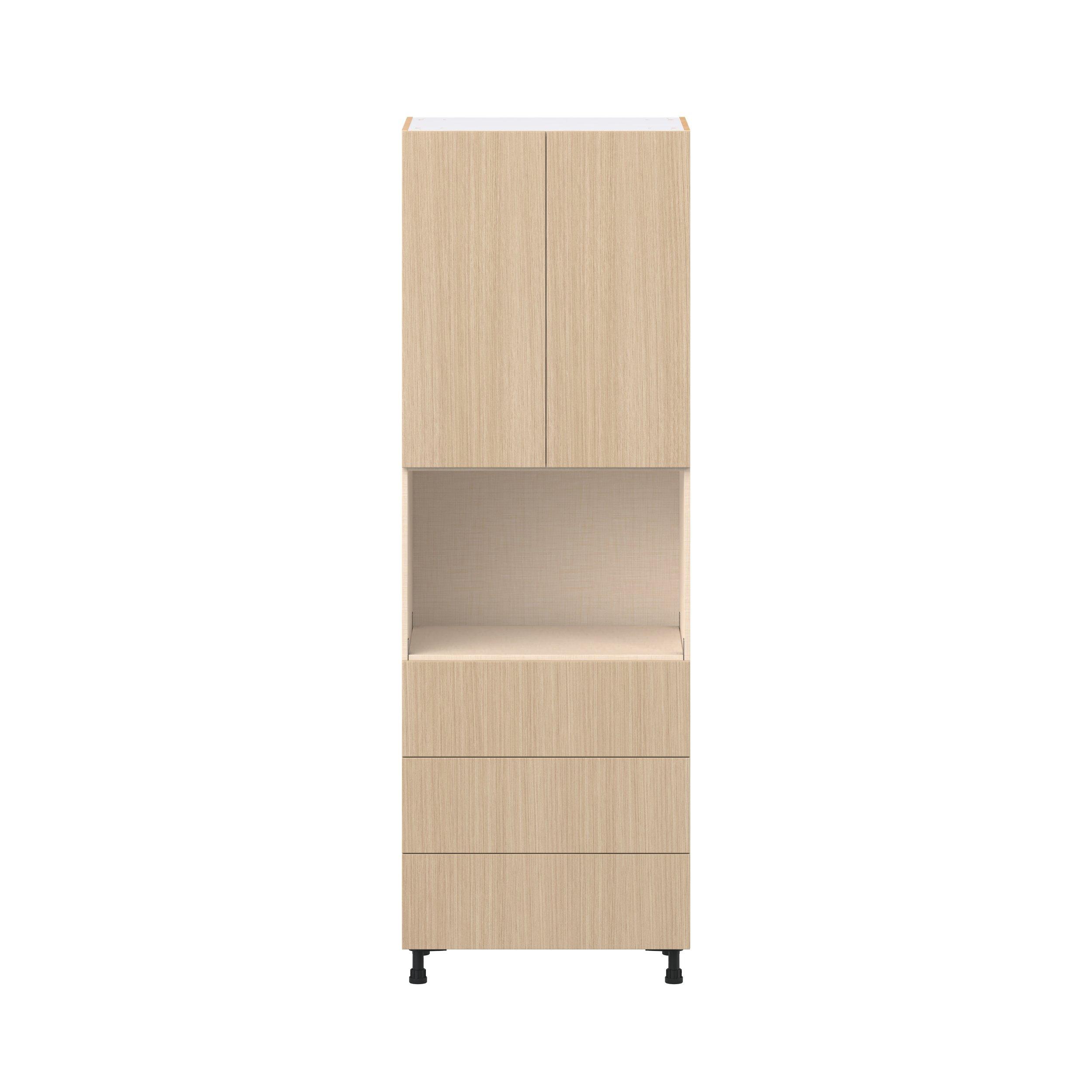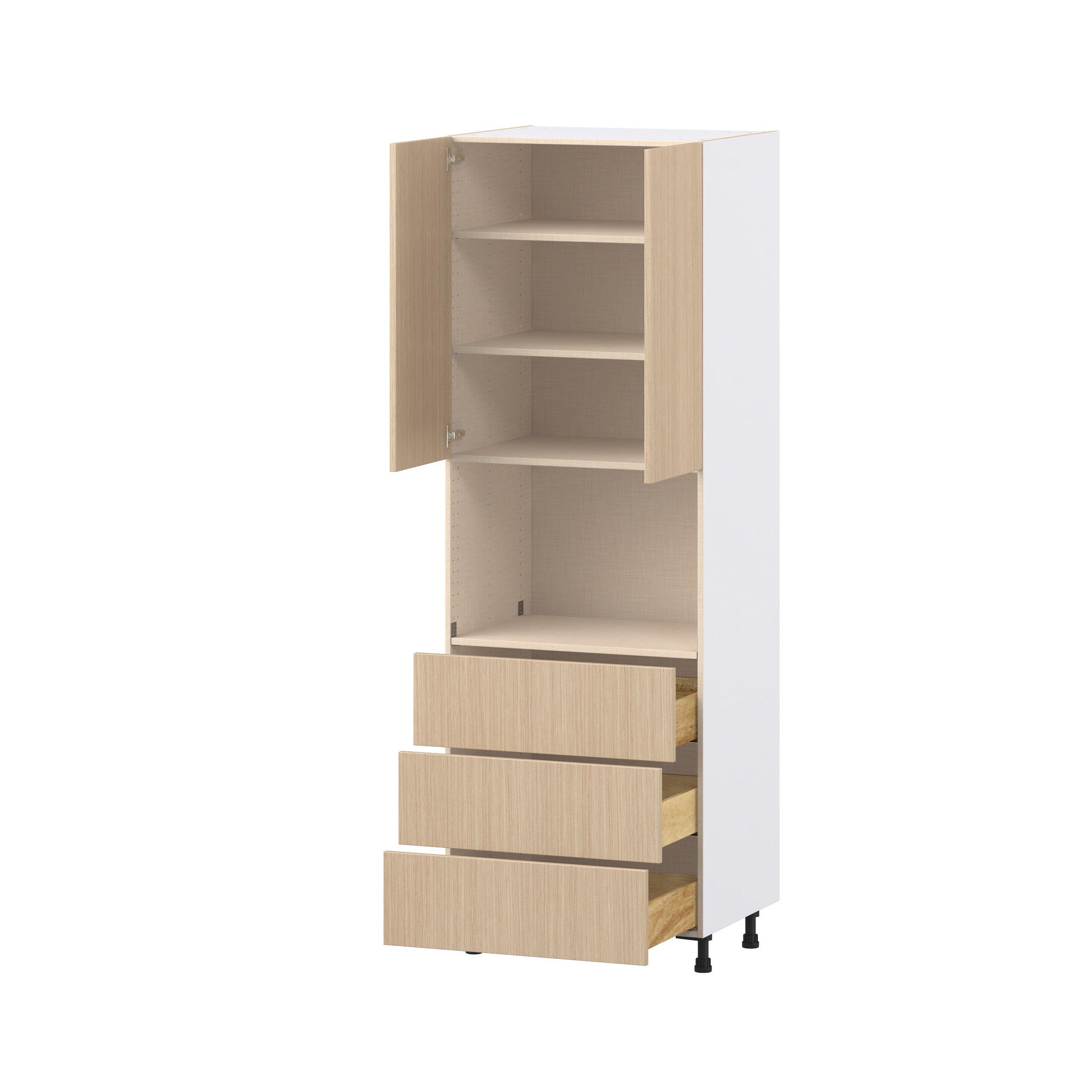 Elevate your project with the contemporary charm of Glenwood slab-style cabinets. Available in desert Mojavi oak and rich burnt walnut finishes, this collection captures the warmth and beauty of natural wood with the practicality of textured melamine. Crafted from one-piece MDF Studio Design Collection Glenwood 30 in. Mojavi Oak Door and Drawer Microwave Pantry Cabinet is designed to resist hairline cracks while the easy-to-clean finish stands up to stains and moisture. Featuring 5-piece doors and dovetail drawer joints, these cabinets offer durability and elegance. This collection combines style with everyday storage solutions.