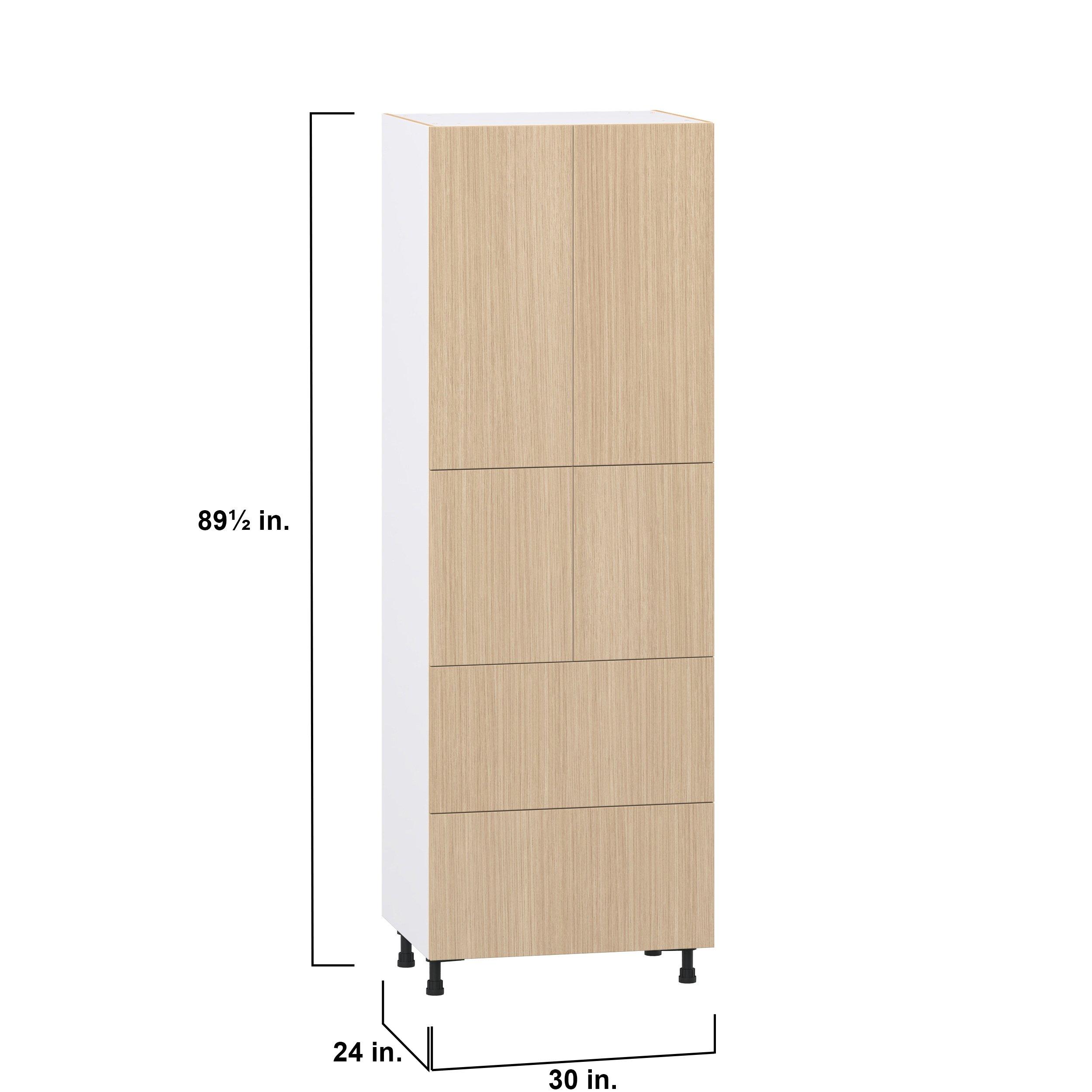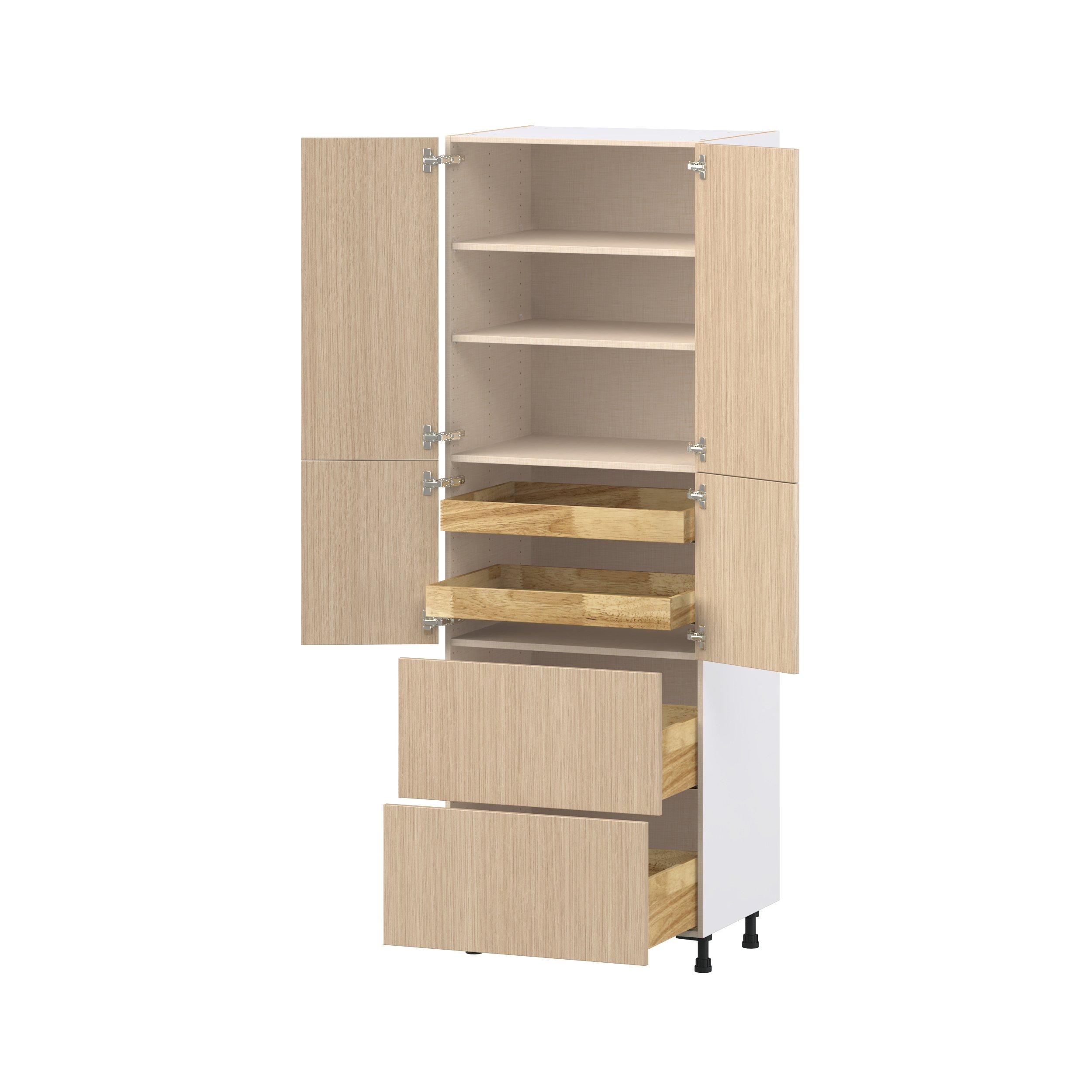 Elevate your project with the contemporary charm of Glenwood slab-style cabinets. Available in desert Mojavi oak and rich burnt walnut finishes, this collection captures the warmth and beauty of natural wood with the practicality of textured melamine. Crafted from one-piece MDF Studio Design Collection Glenwood 30 in. Mojavi Oak Door and Drawer Pantry Cabinet with Inner Pull-Out is designed to resist hairline cracks while the easy-to-clean finish stands up to stains and moisture. Featuring 5-piece doors and dovetail drawer joints, these cabinets offer durability and elegance. This collection combines style with everyday storage solutions.