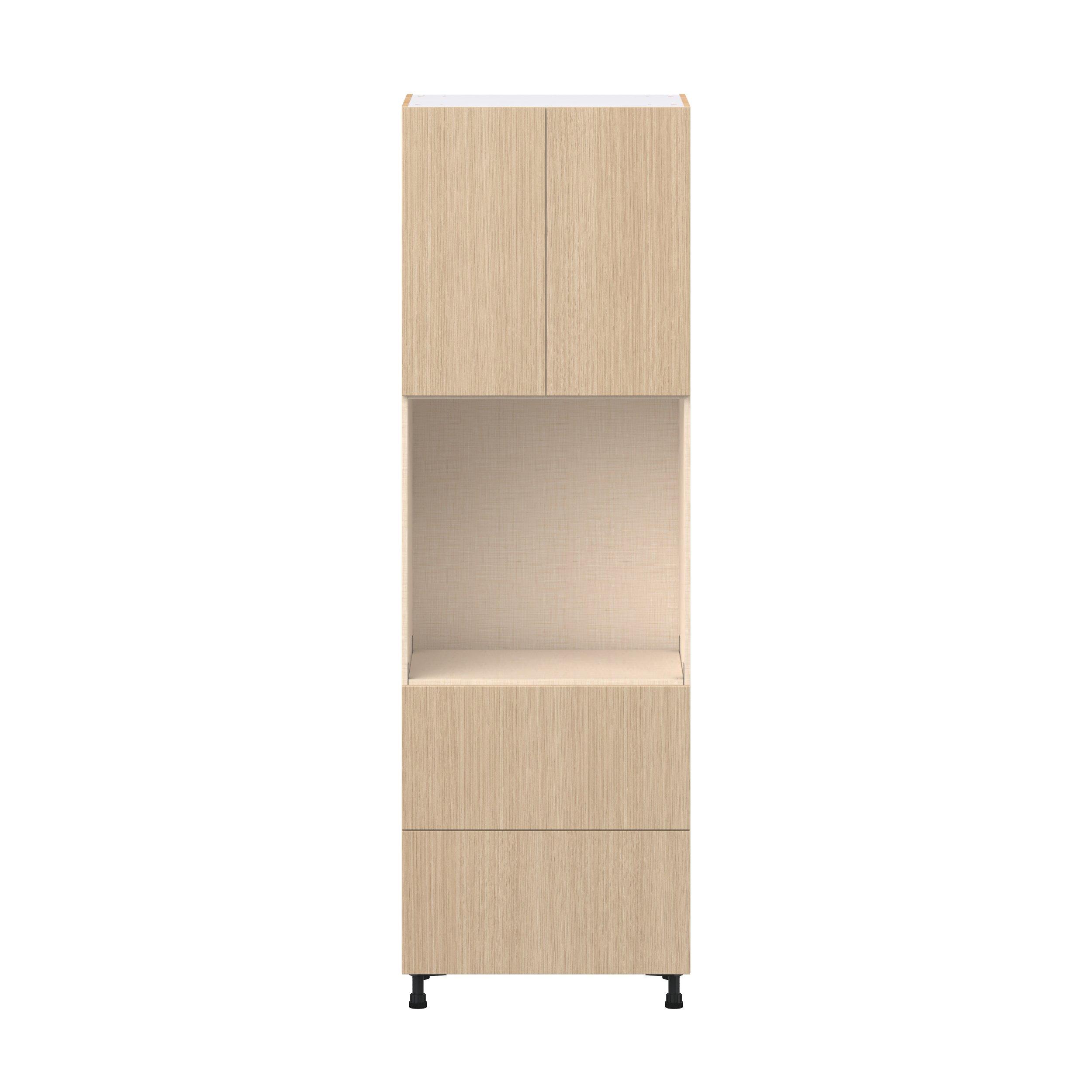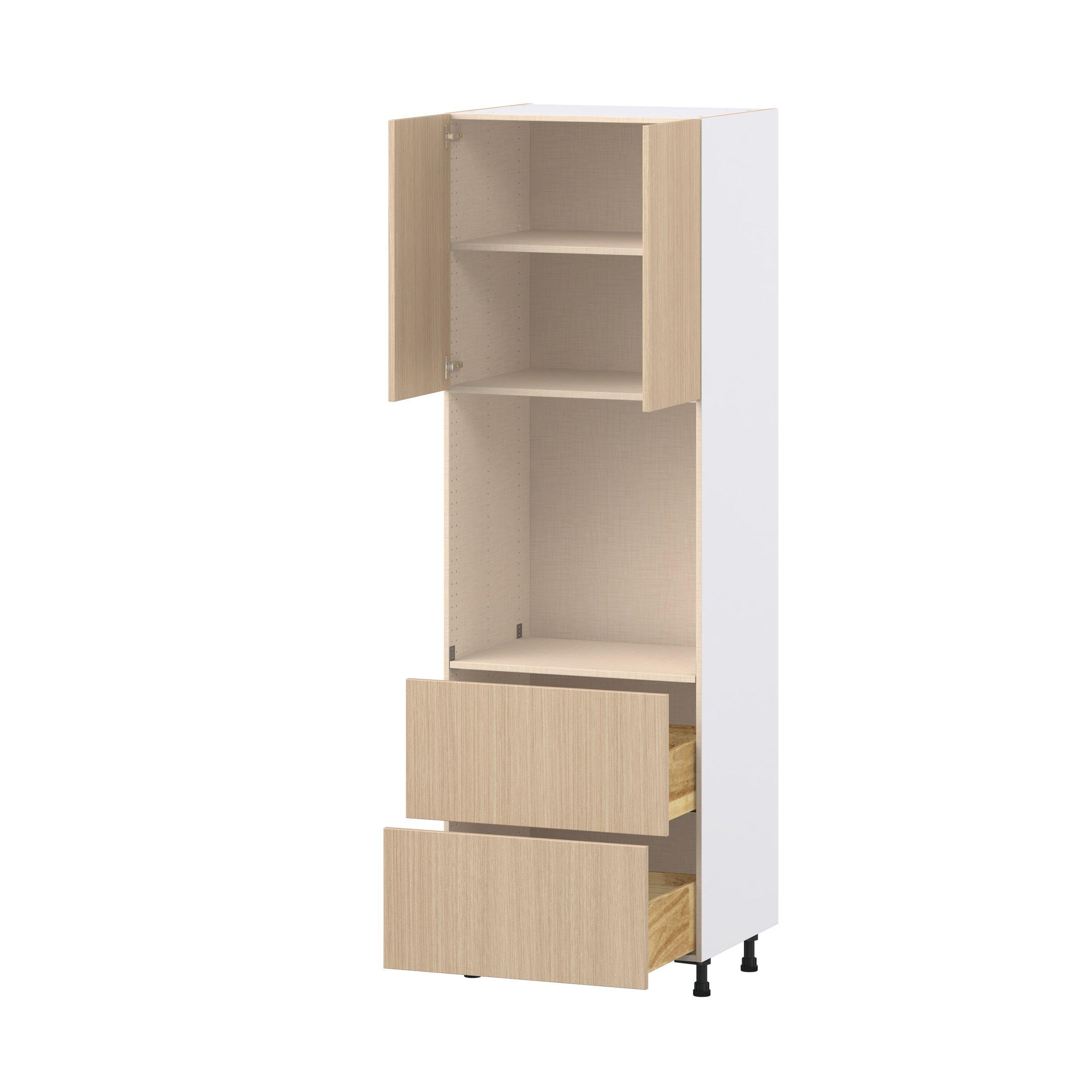 Elevate your project with the contemporary charm of Glenwood slab-style cabinets. Available in desert Mojavi oak and rich burnt walnut finishes, this collection captures the warmth and beauty of natural wood with the practicality of textured melamine. Crafted from one-piece MDF Studio Design Collection Glenwood 30 in. Mojavi Oak Door and Drawer Single Oven Pantry Cabinet is designed to resist hairline cracks while the easy-to-clean finish stands up to stains and moisture. Featuring 5-piece doors and dovetail drawer joints, these cabinets offer durability and elegance. This collection combines style with everyday storage solutions.