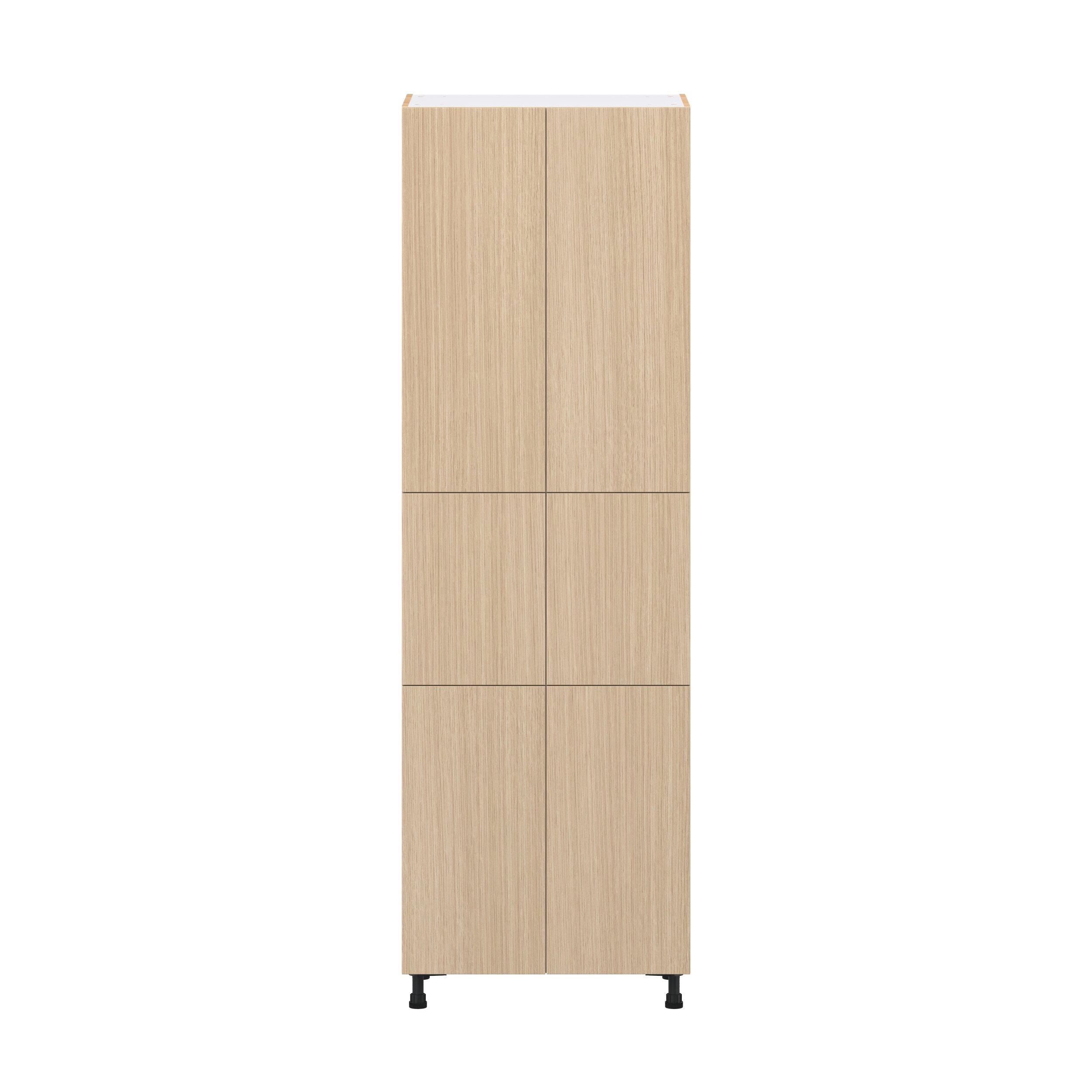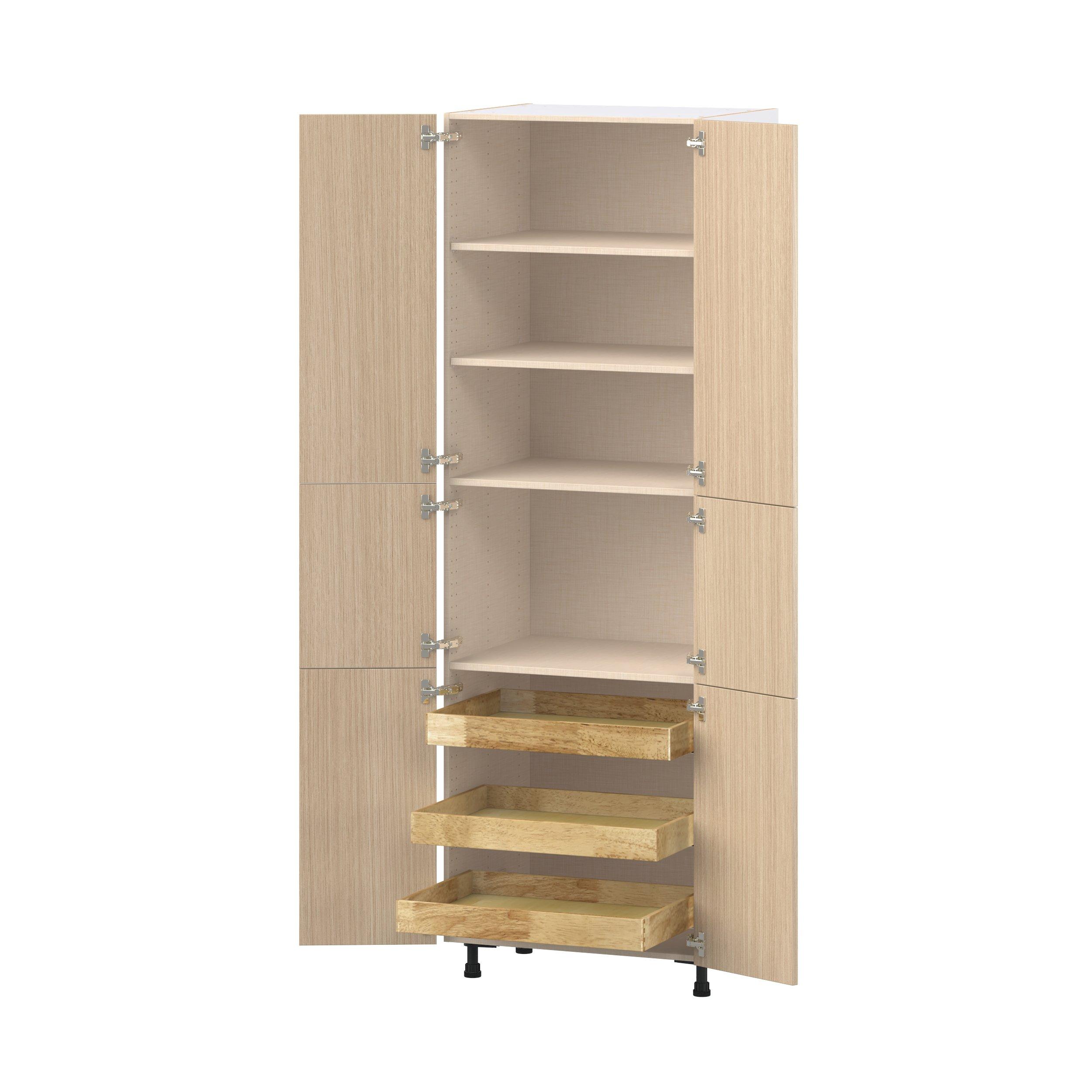 Elevate your project with the contemporary charm of Glenwood slab-style cabinets. Available in desert Mojavi oak and rich burnt walnut finishes, this collection captures the warmth and beauty of natural wood with the practicality of textured melamine. Crafted from one-piece MDF Studio Design Collection Glenwood 30 in. Mojavi Oak Pantry Cabinet with Inner Pull-Out Drawer is designed to resist hairline cracks while the easy-to-clean finish stands up to stains and moisture. Featuring 5-piece doors and dovetail drawer joints, these cabinets offer durability and elegance. This collection combines style with everyday storage solutions.
