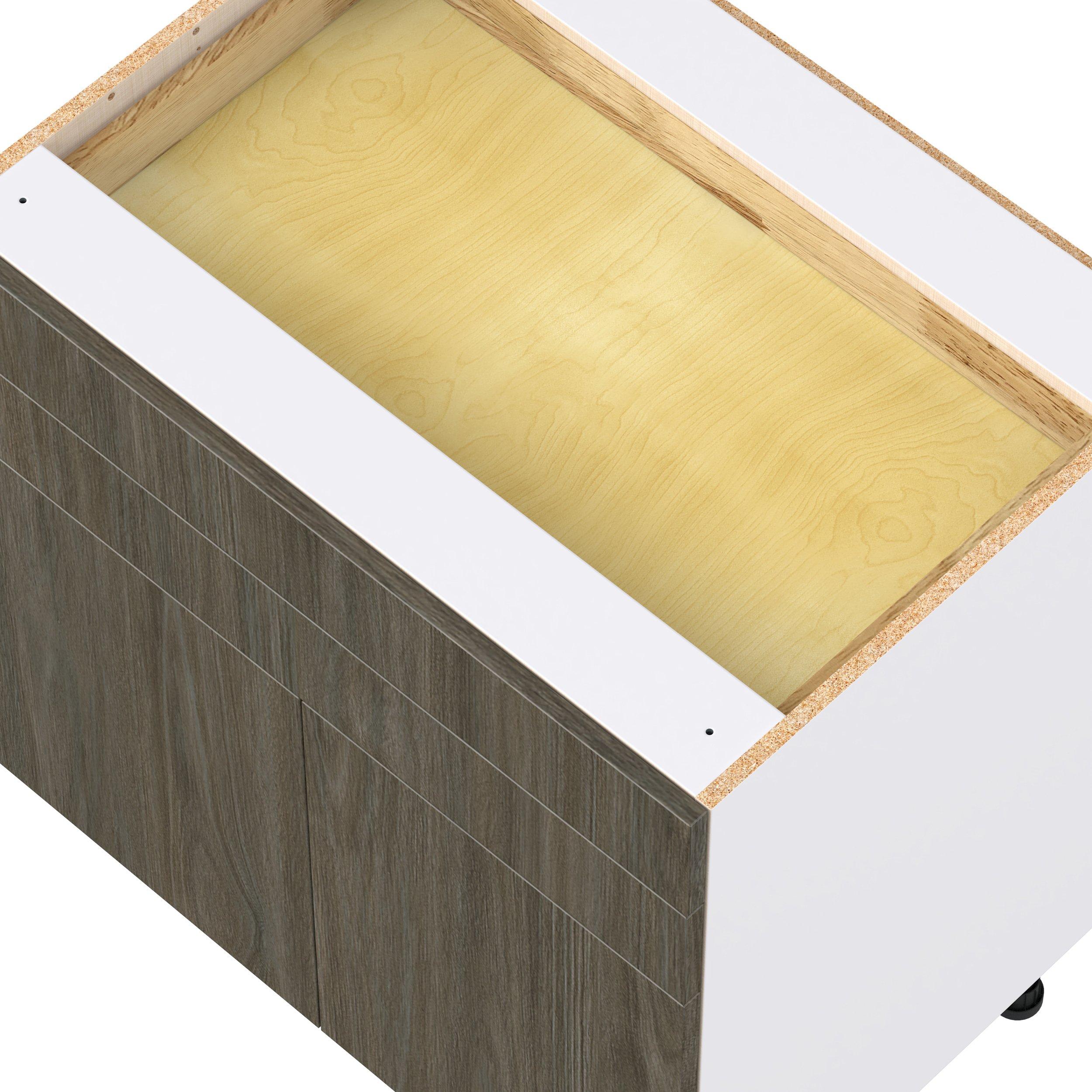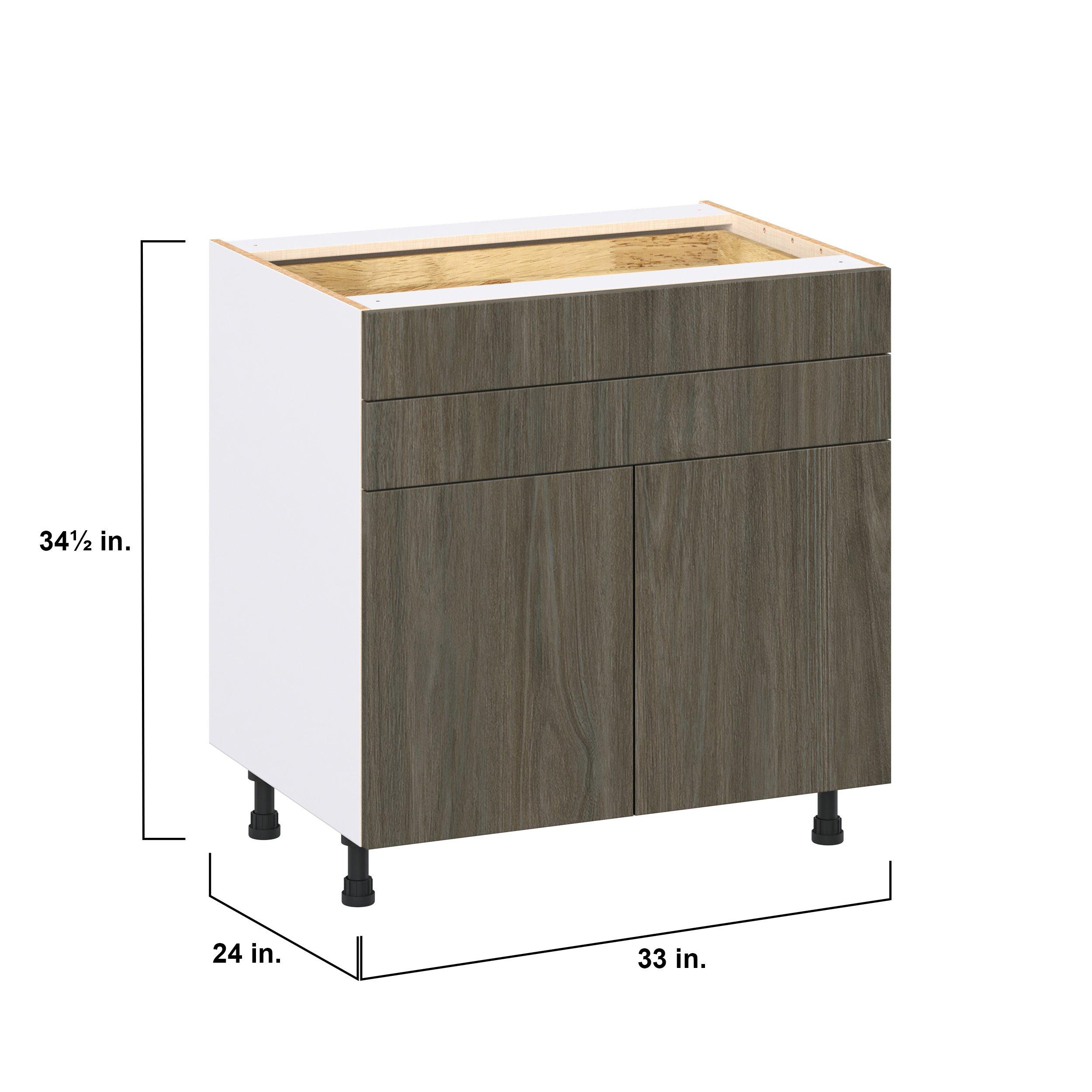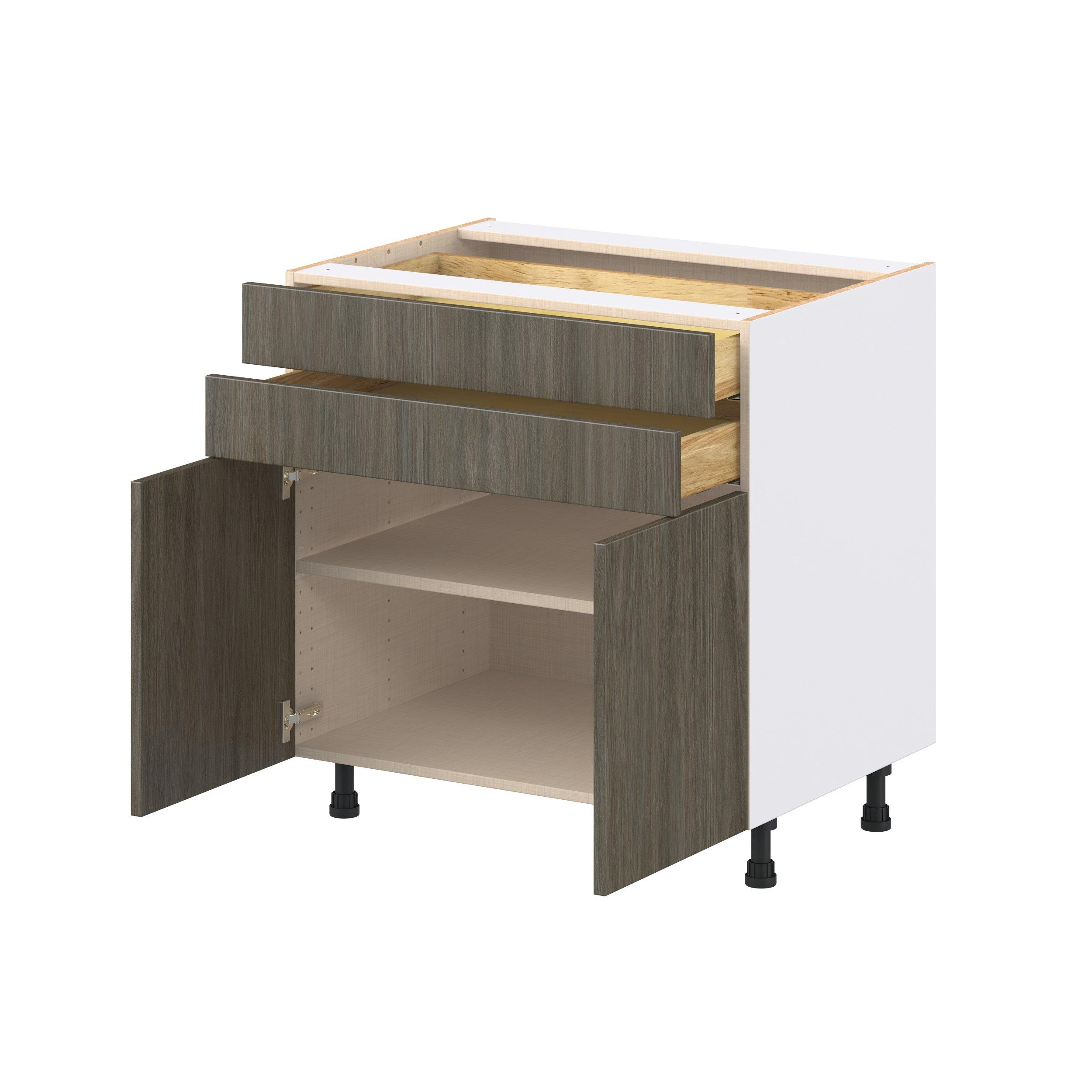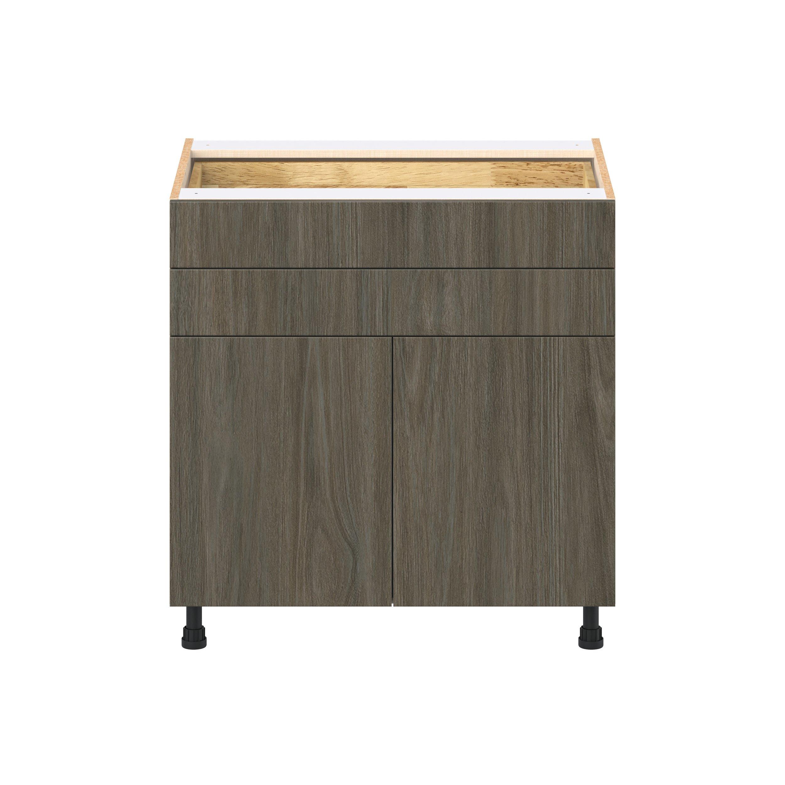 Elevate your project with the contemporary charm of Glenwood slab-style cabinets. Available in desert Mojavi oak and rich burnt walnut finishes, this collection captures the warmth and beauty of natural wood with the practicality of textured melamine. Crafted from one-piece MDF Studio Design Collection Glenwood 33 in. Burnt Walnut Door and Drawer Base Cabinet is designed to resist hairline cracks while the easy-to-clean finish stands up to stains and moisture. Featuring 5-piece doors and dovetail drawer joints, these cabinets offer durability and elegance. This collection combines style with everyday storage solutions.