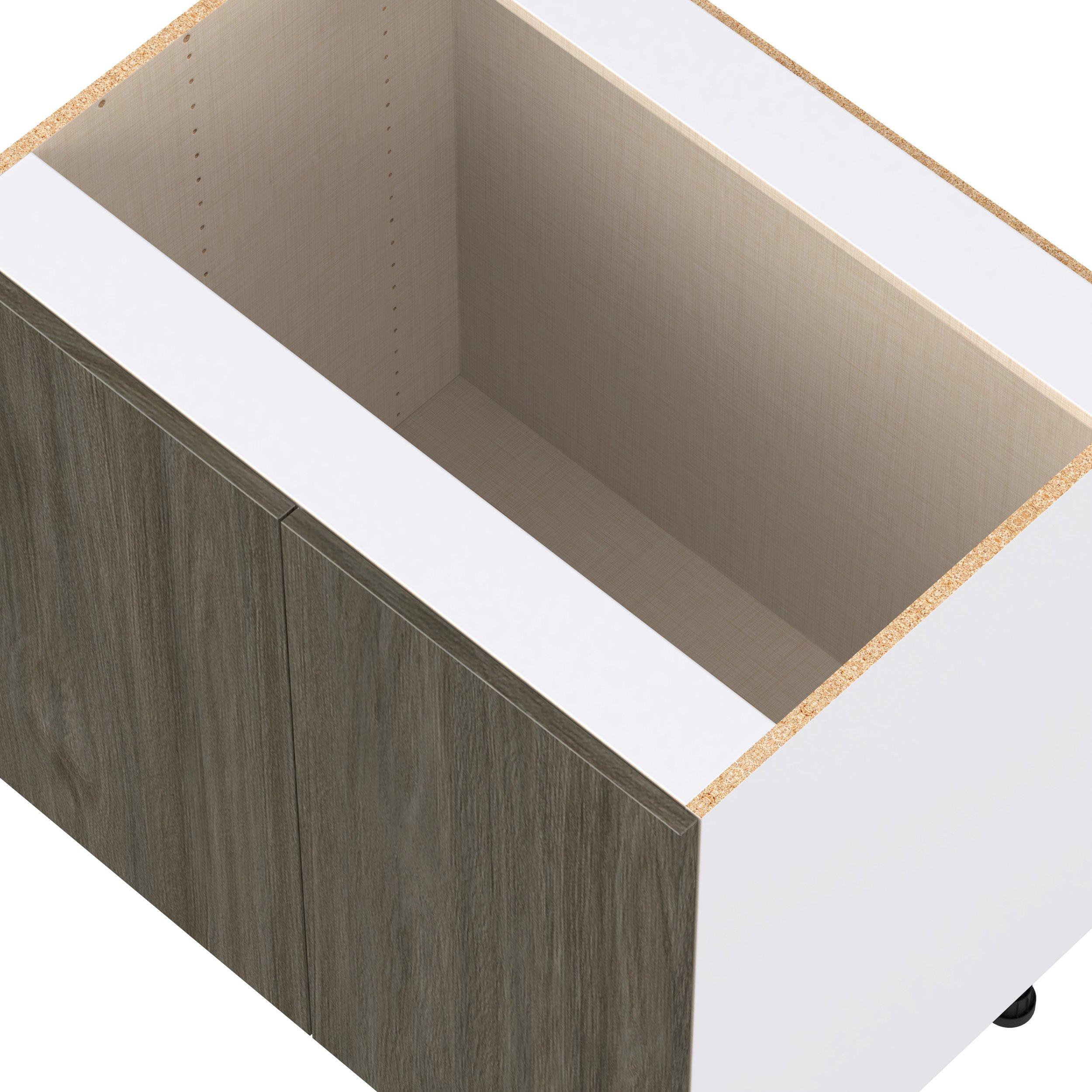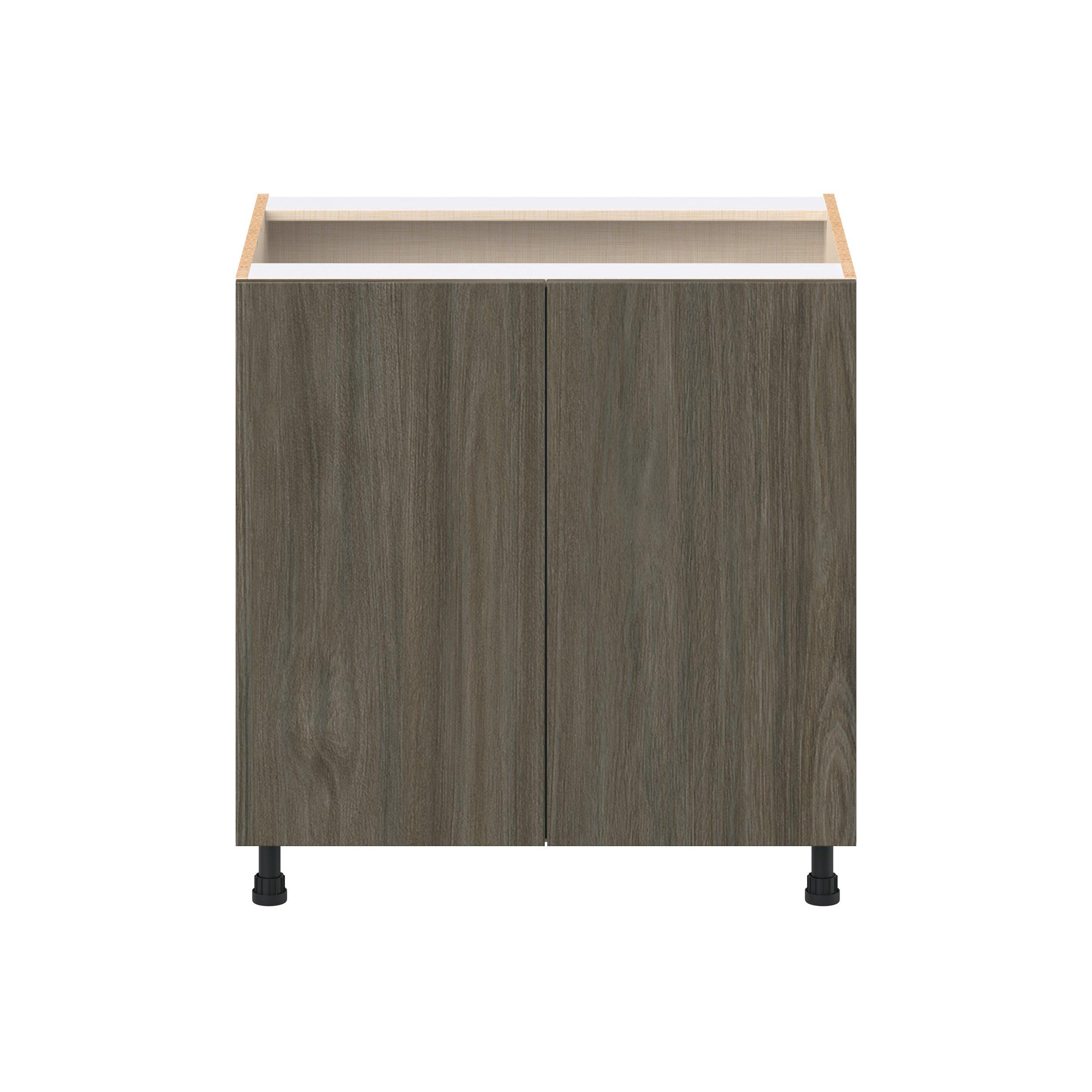 Elevate your project with the contemporary charm of Glenwood slab-style cabinets. Available in desert Mojavi oak and rich burnt walnut finishes, this collection captures the warmth and beauty of natural wood with the practicality of textured melamine. Crafted from one-piece MDF Studio Design Collection Glenwood 33 in. Burnt Walnut Sink Base Cabinet is designed to resist hairline cracks while the easy-to-clean finish stands up to stains and moisture. Featuring 5-piece doors and dovetail drawer joints, these cabinets offer durability and elegance. This collection combines style with everyday storage solutions.