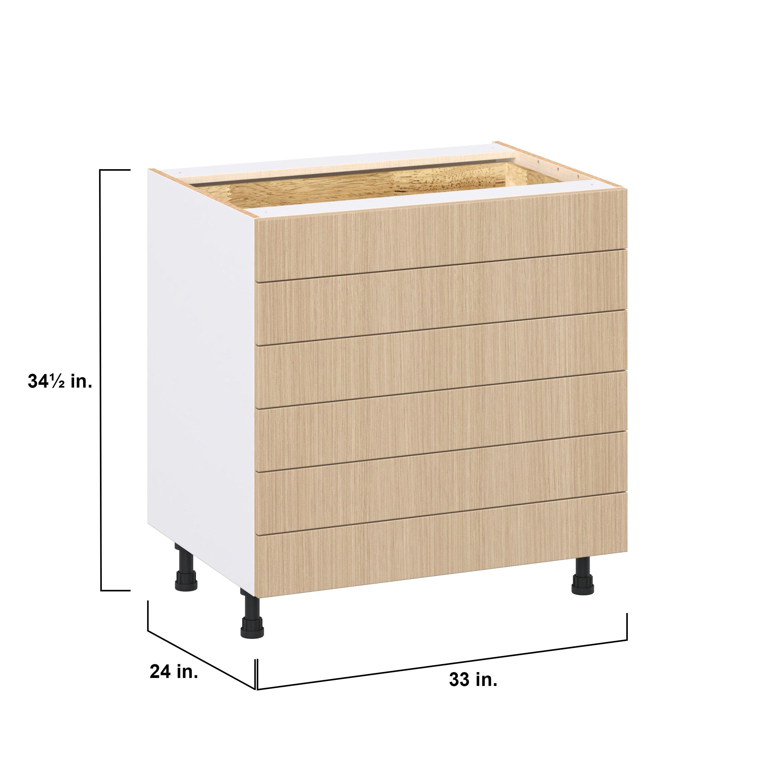 Elevate your project with the contemporary charm of Glenwood slab-style cabinets. Available in desert Mojavi oak and rich burnt walnut finishes, this collection captures the warmth and beauty of natural wood with the practicality of textured melamine. Crafted from one-piece MDF Studio Design Collection Glenwood 33 in. Mojavi Oak Drawer Base Cabinet is designed to resist hairline cracks while the easy-to-clean finish stands up to stains and moisture. Featuring 5-piece doors and dovetail drawer joints, these cabinets offer durability and elegance. This collection combines style with everyday storage solutions.
