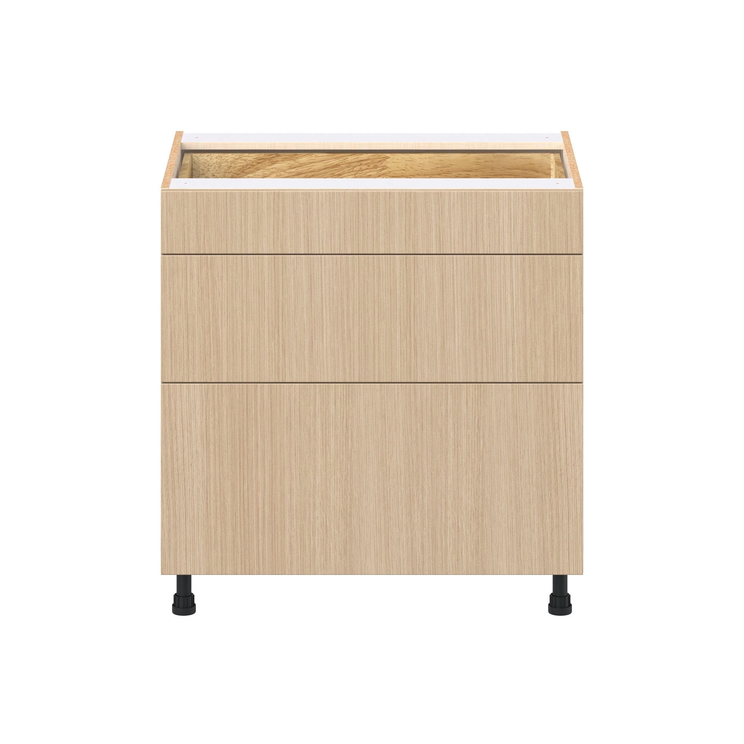 Elevate your project with the contemporary charm of Glenwood slab-style cabinets. Available in desert Mojavi oak and rich burnt walnut finishes, this collection captures the warmth and beauty of natural wood with the practicality of textured melamine. Crafted from one-piece MDF Studio Design Collection Glenwood 33 in. Mojavi Oak Drawer Base Cabinet is designed to resist hairline cracks while the easy-to-clean finish stands up to stains and moisture. Featuring 5-piece doors and dovetail drawer joints, these cabinets offer durability and elegance. This collection combines style with everyday storage solutions.