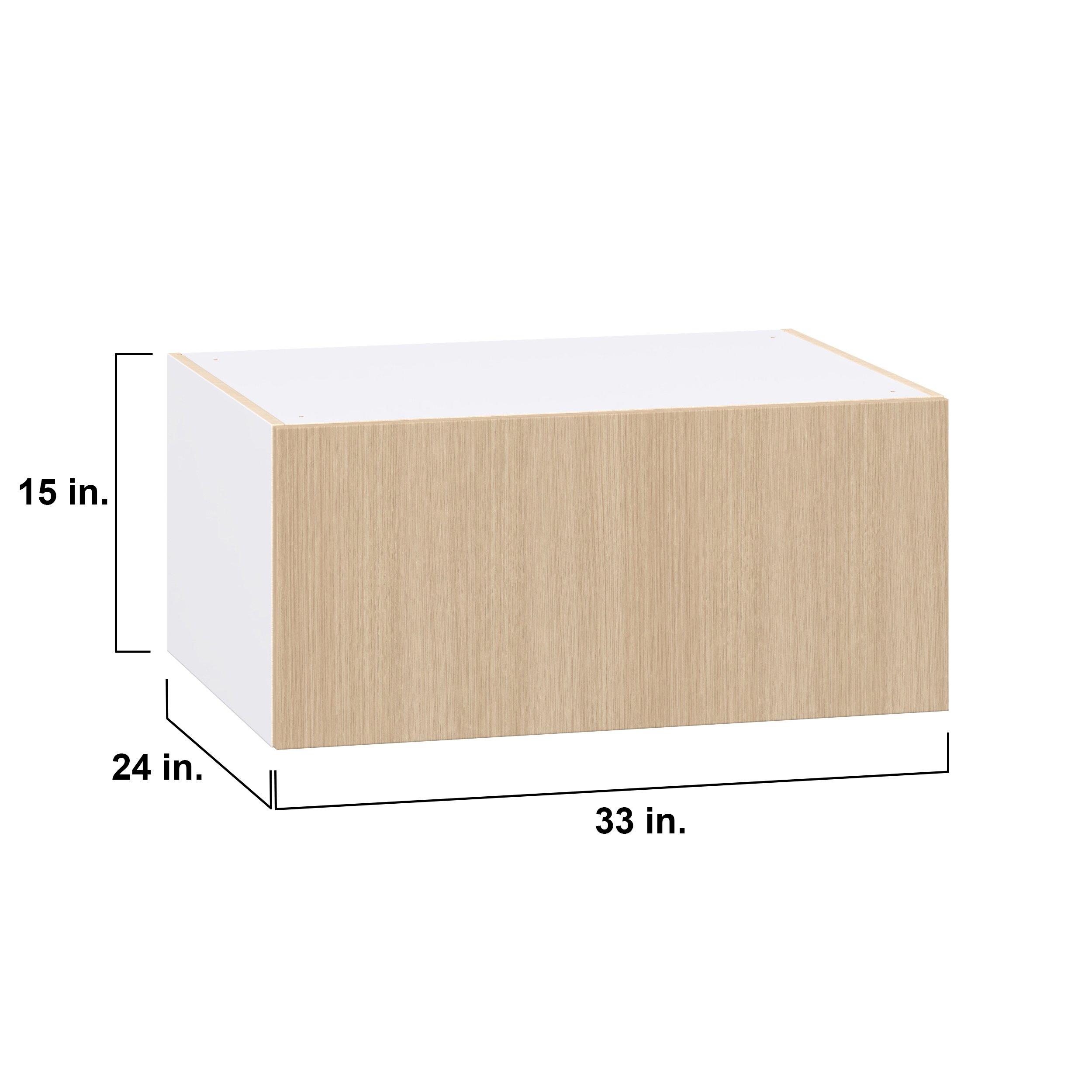 Elevate your project with the contemporary charm of Glenwood slab-style cabinets. Available in desert Mojavi oak and rich burnt walnut finishes, this collection captures the warmth and beauty of natural wood with the practicality of textured melamine. Crafted from one-piece MDF Studio Design Collection Glenwood 33 in. Mojavi Oak Lift Up Wall Cabinet is designed to resist hairline cracks while the easy-to-clean finish stands up to stains and moisture. Featuring 5-piece doors and dovetail drawer joints, these cabinets offer durability and elegance. This collection combines style with everyday storage solutions.