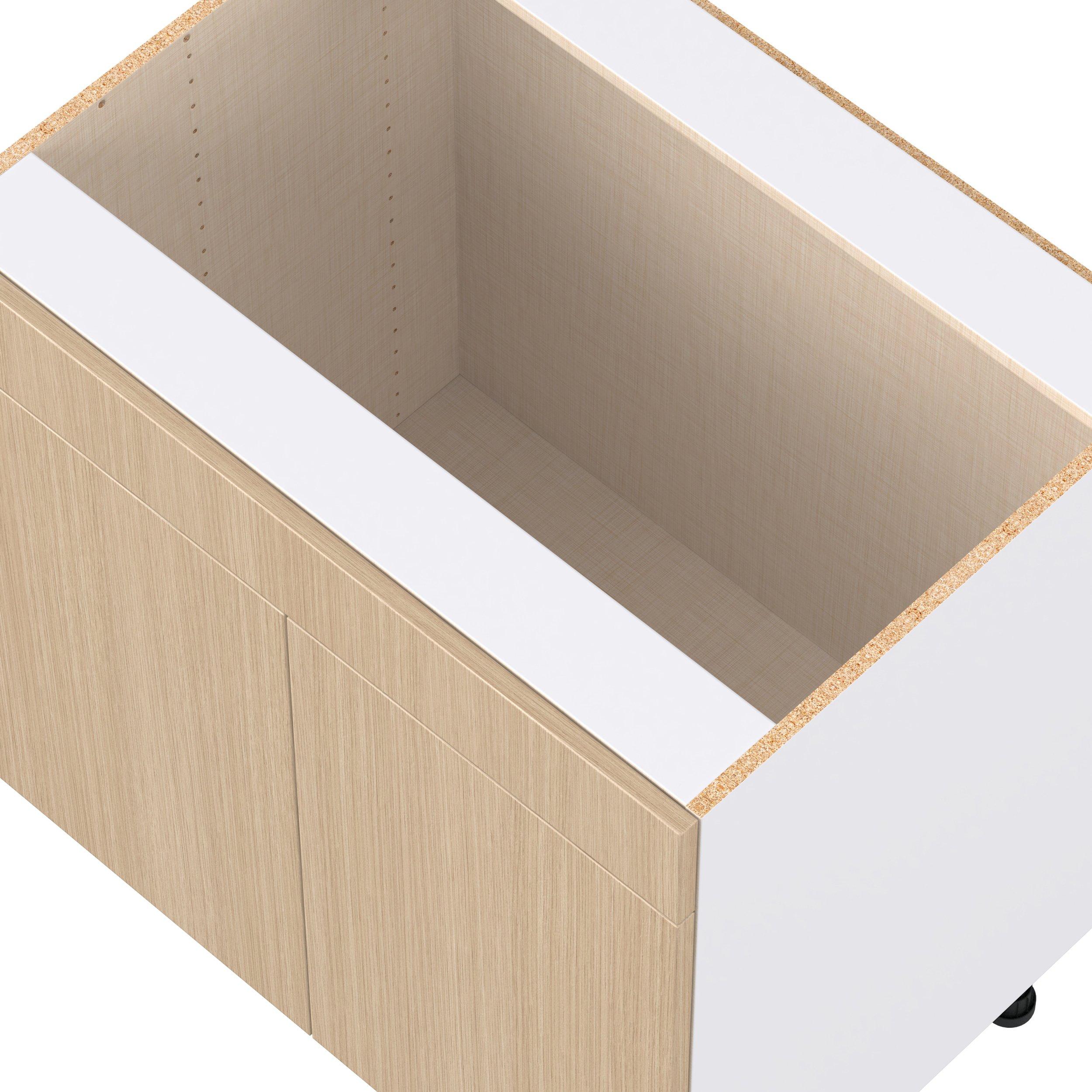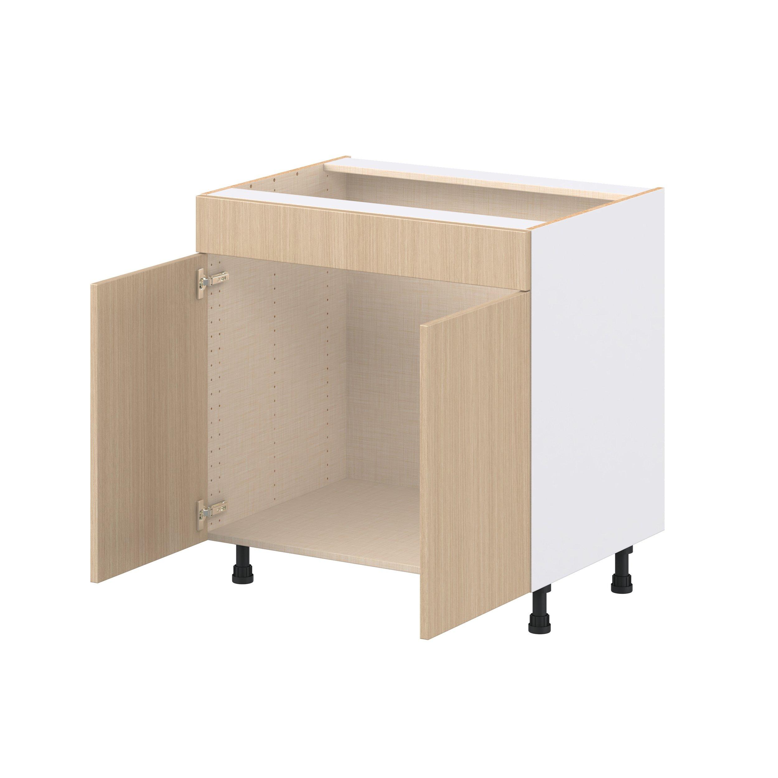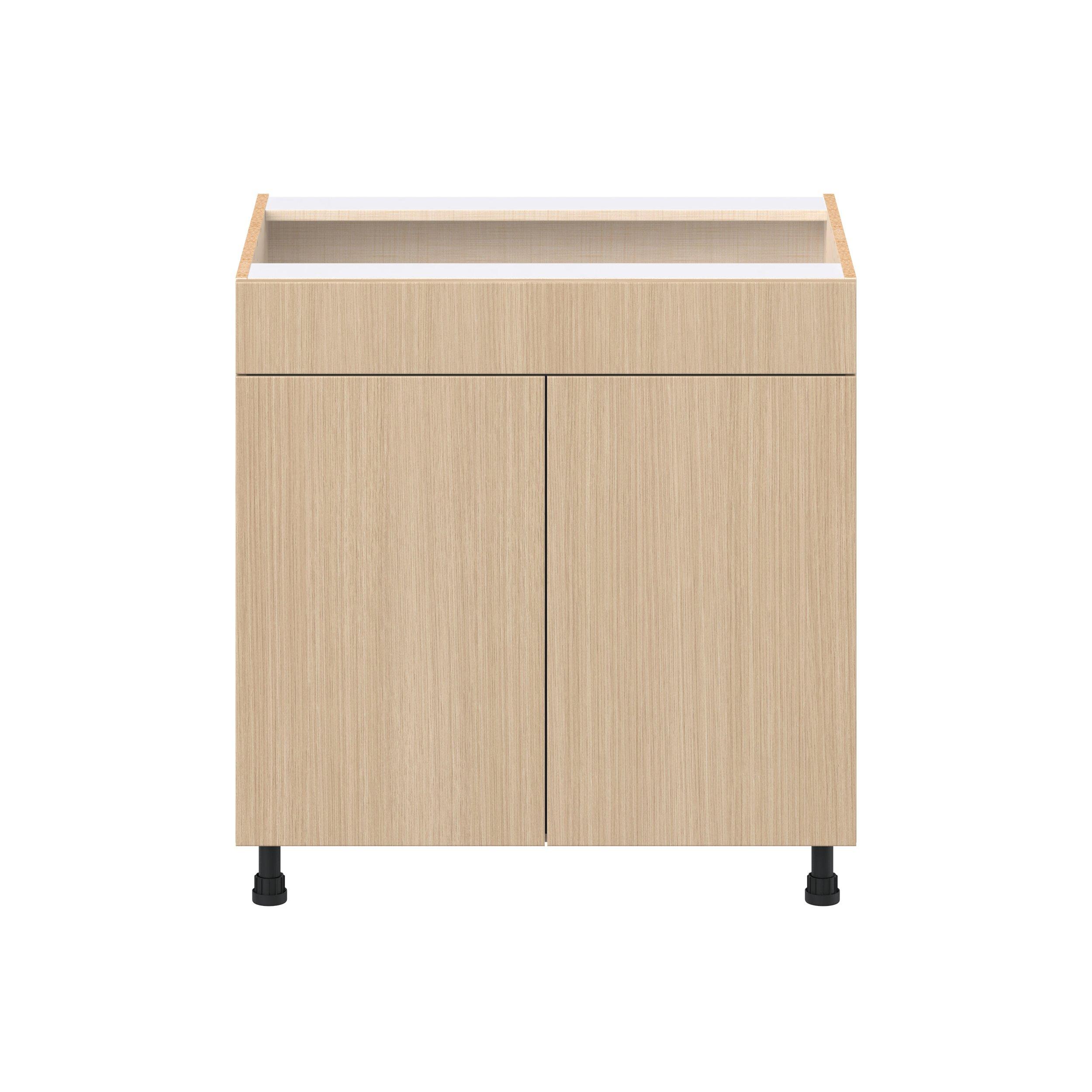 Elevate your project with the contemporary charm of Glenwood slab-style cabinets. Available in desert Mojavi oak and rich burnt walnut finishes, this collection captures the warmth and beauty of natural wood with the practicality of textured melamine. Crafted from one-piece MDF Studio Design Collection Glenwood 33 in. Mojavi Oak Sink Base Cabinet with False Front is designed to resist hairline cracks while the easy-to-clean finish stands up to stains and moisture. Featuring 5-piece doors and dovetail drawer joints, these cabinets offer durability and elegance. This collection combines style with everyday storage solutions.