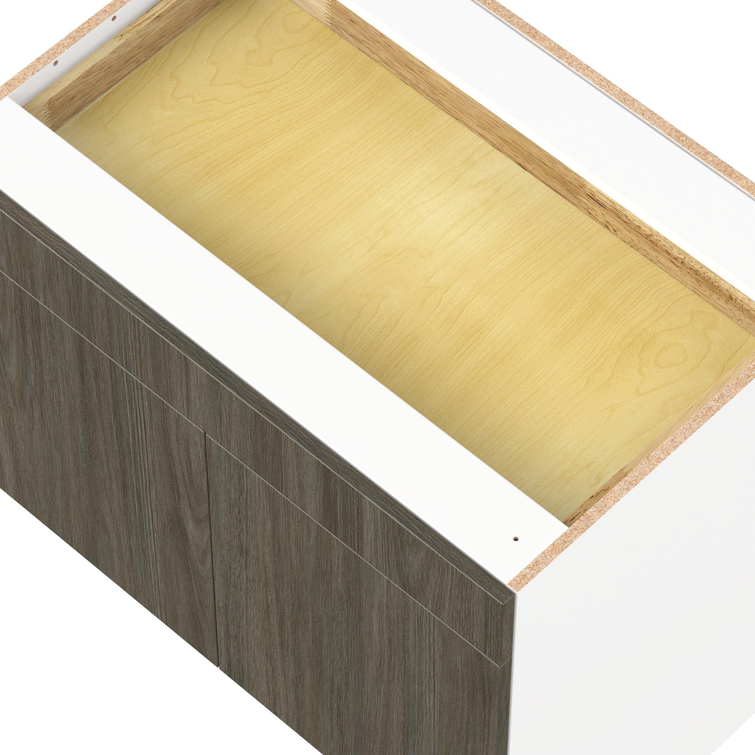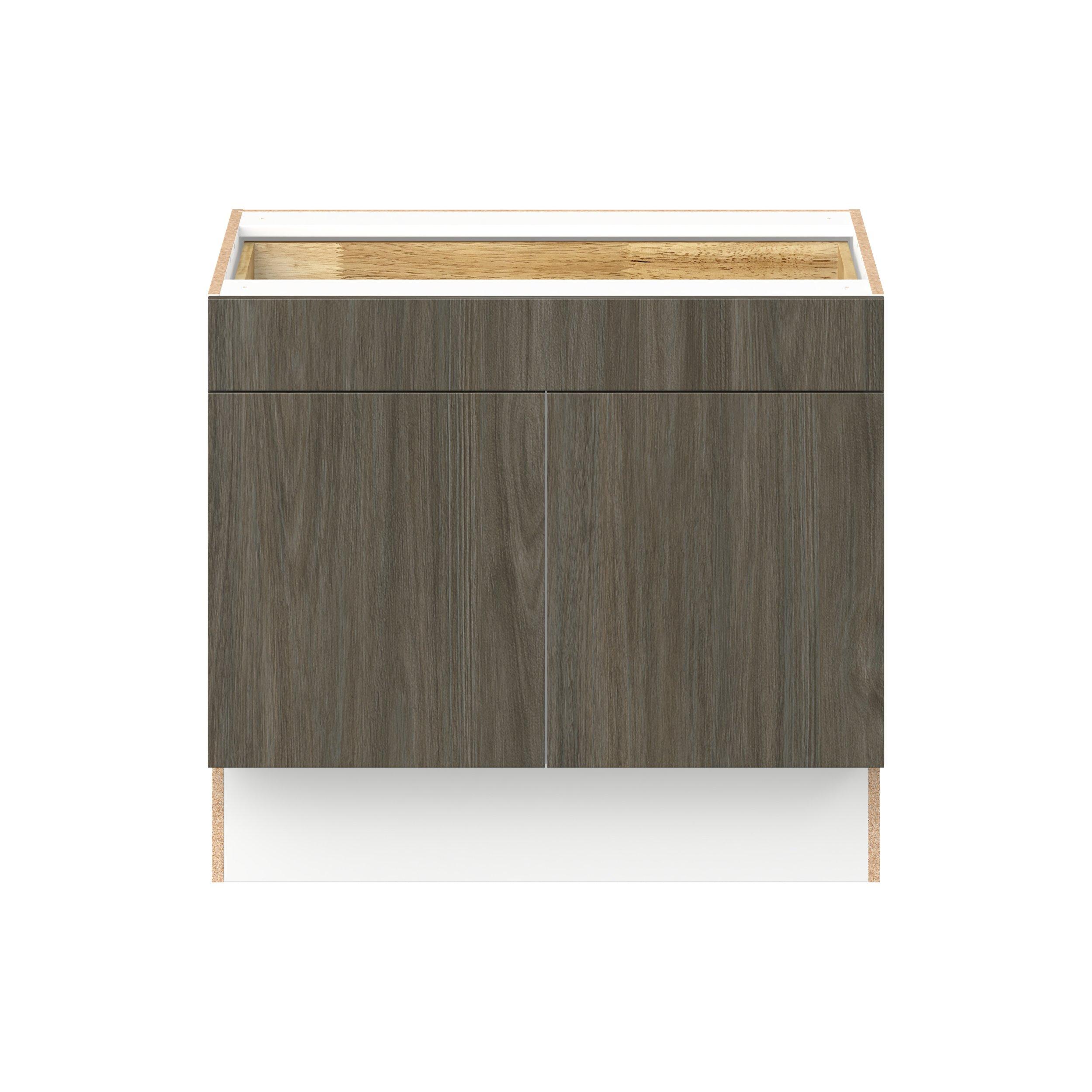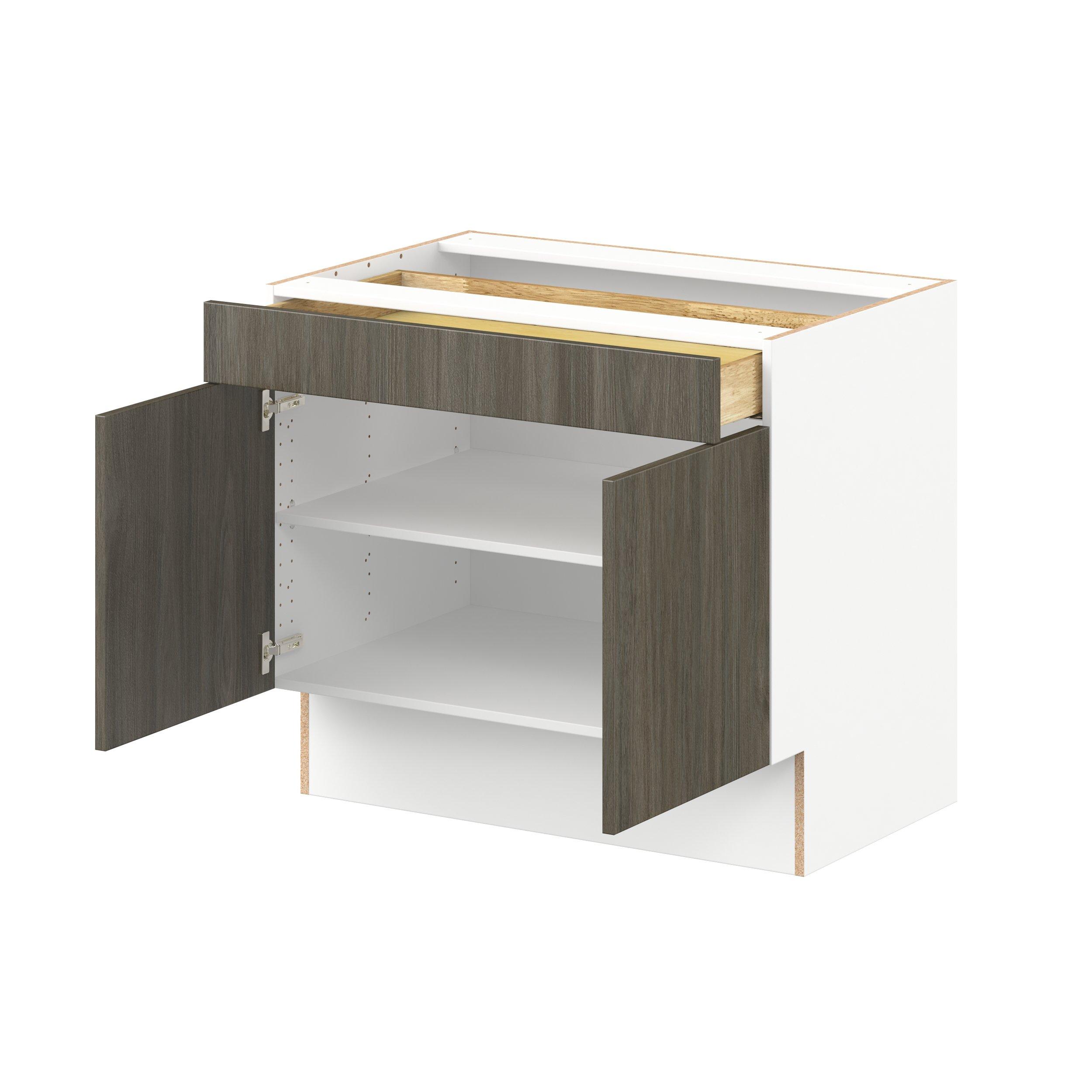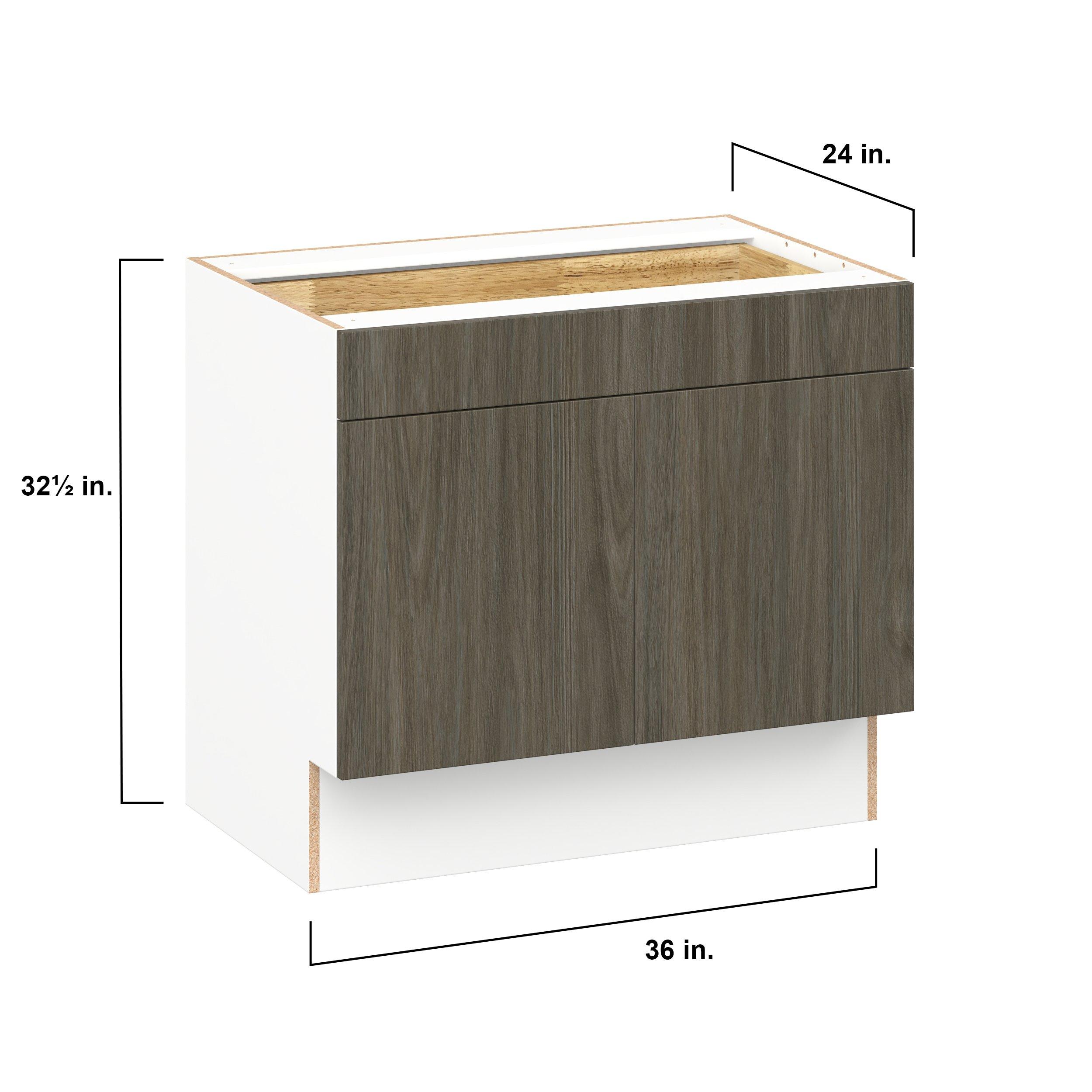 Elevate your project with the contemporary charm of Glenwood slab-style cabinets. Available in desert Mojavi oak and rich burnt walnut finishes, this collection captures the warmth and beauty of natural wood with the practicality of textured melamine. Crafted from one-piece MDF Studio Design Collection Glenwood 36 in. Burnt Walnut Door and Drawer Base Cabinet - ADA is designed to resist hairline cracks while the easy-to-clean finish stands up to stains and moisture. Featuring 5-piece doors and dovetail drawer joints, these cabinets offer durability and elegance. This collection combines style with everyday storage solutions.