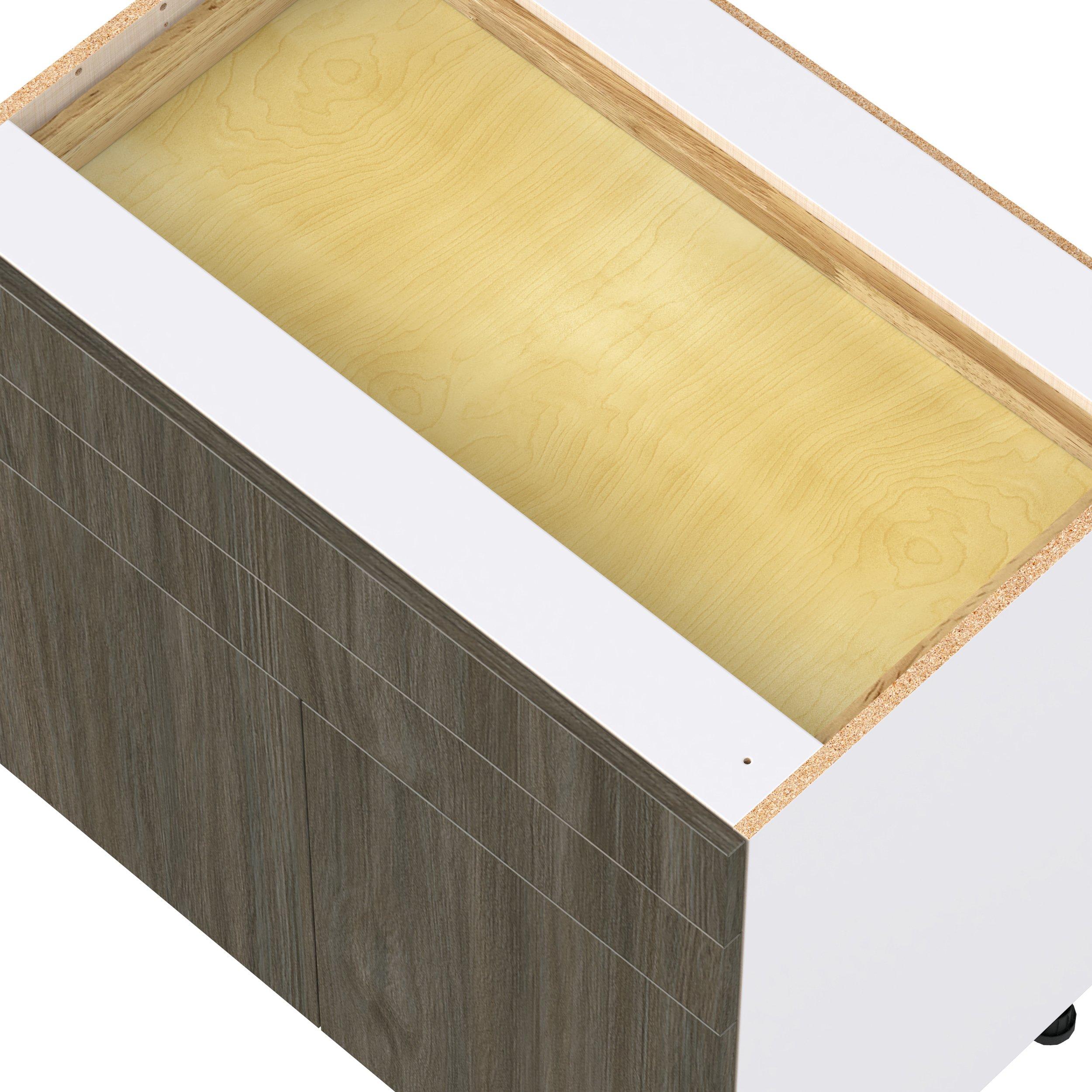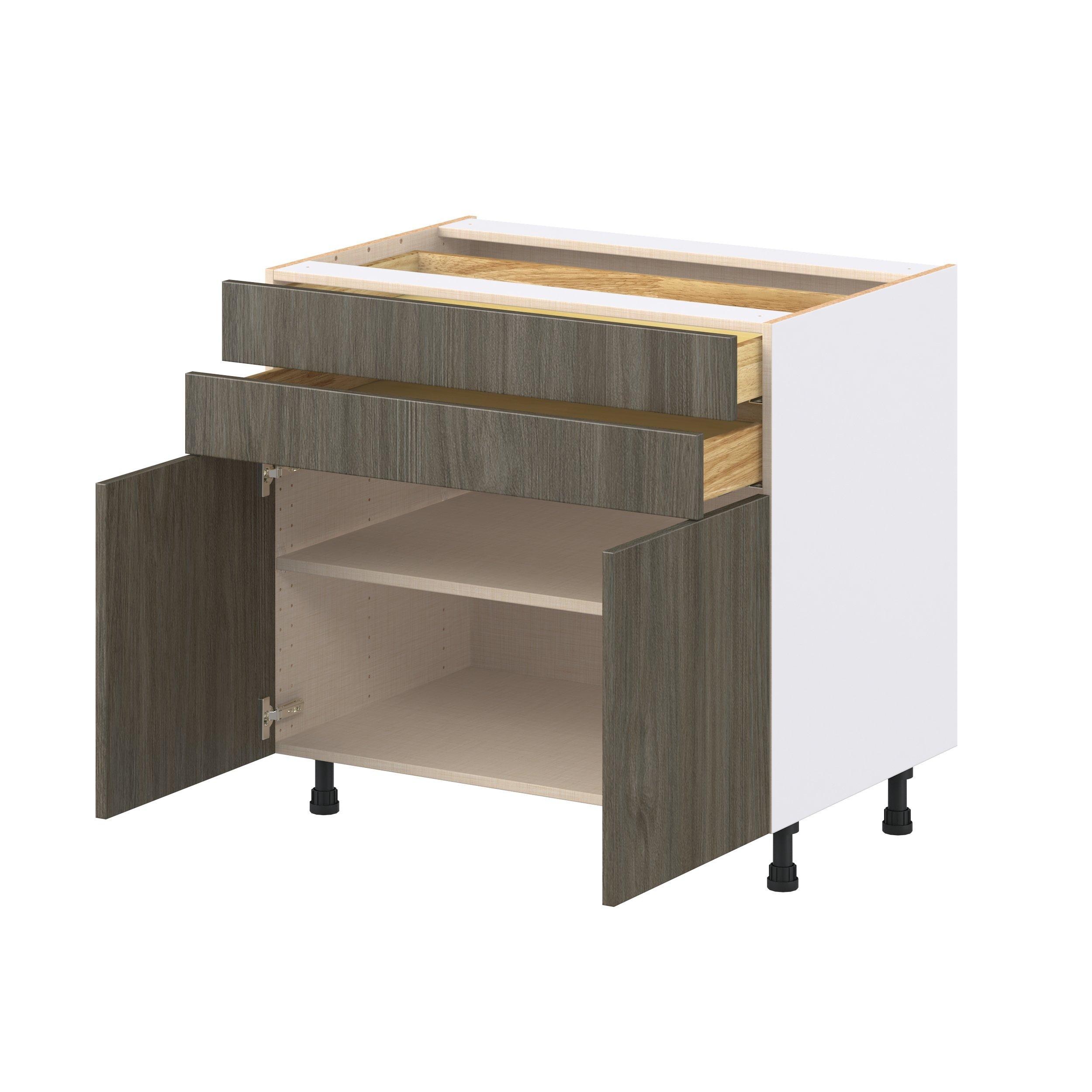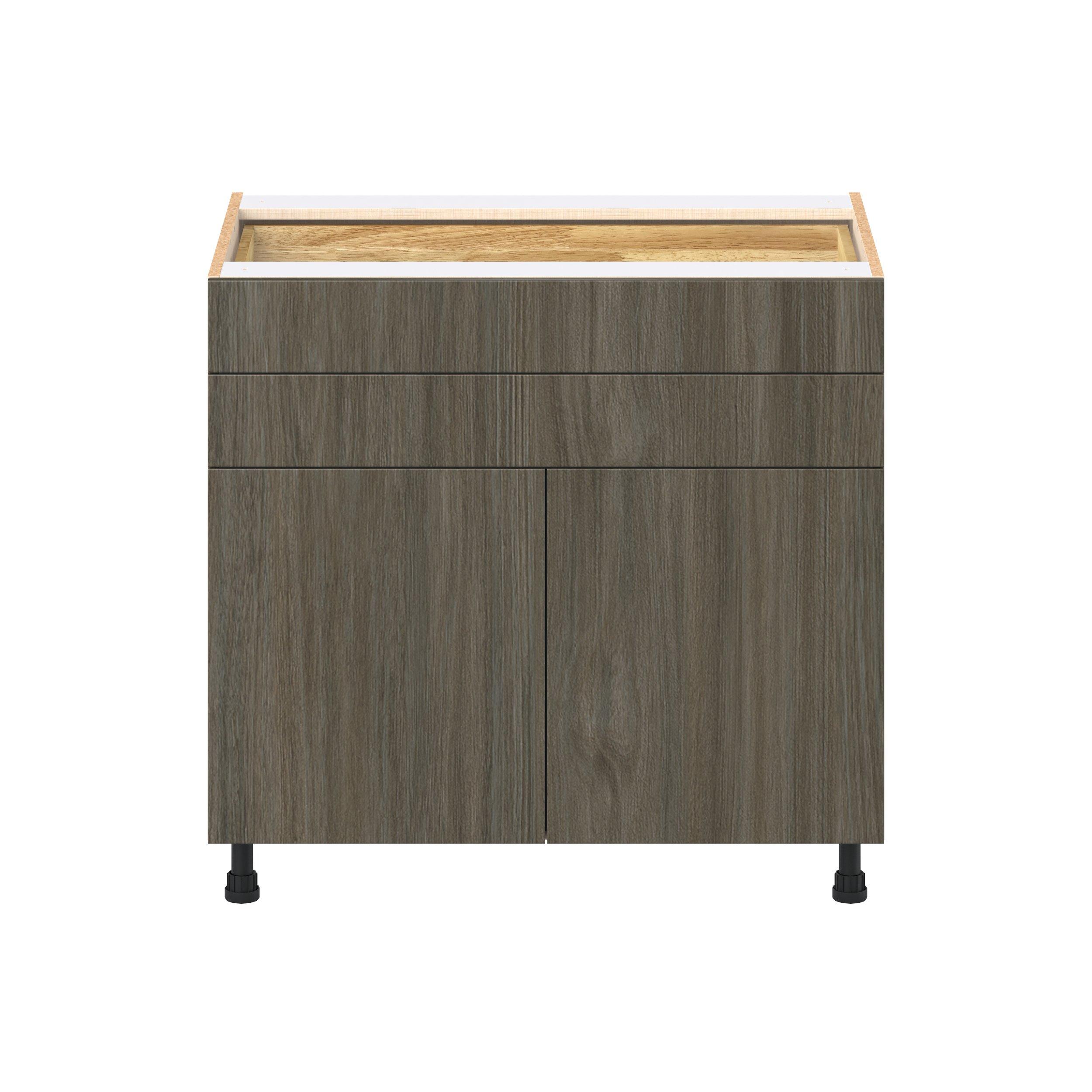 Elevate your project with the contemporary charm of Glenwood slab-style cabinets. Available in desert Mojavi oak and rich burnt walnut finishes, this collection captures the warmth and beauty of natural wood with the practicality of textured melamine. Crafted from one-piece MDF Studio Design Collection Glenwood 36 in. Burnt Walnut Door and Drawer Base Cabinet is designed to resist hairline cracks while the easy-to-clean finish stands up to stains and moisture. Featuring 5-piece doors and dovetail drawer joints, these cabinets offer durability and elegance. This collection combines style with everyday storage solutions.