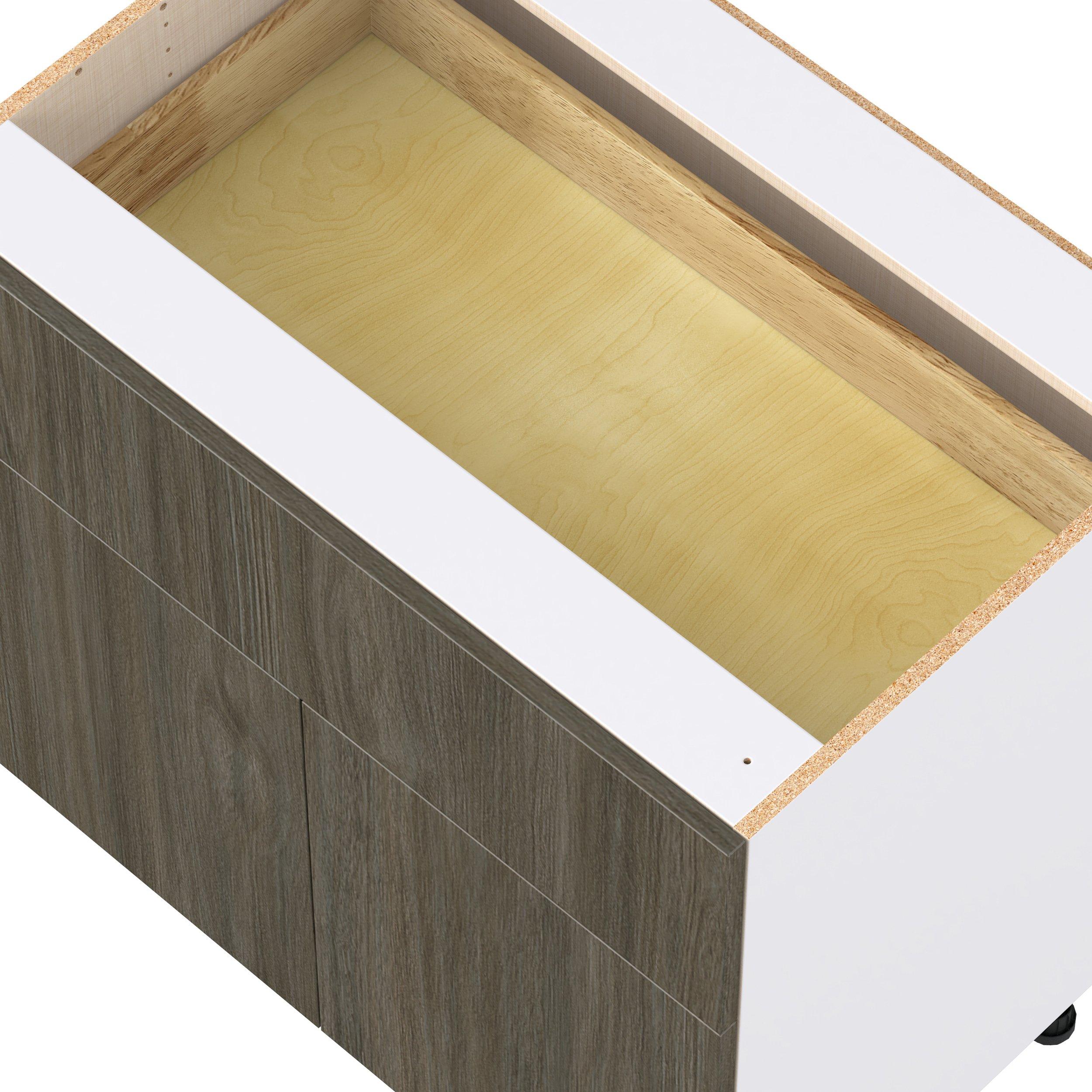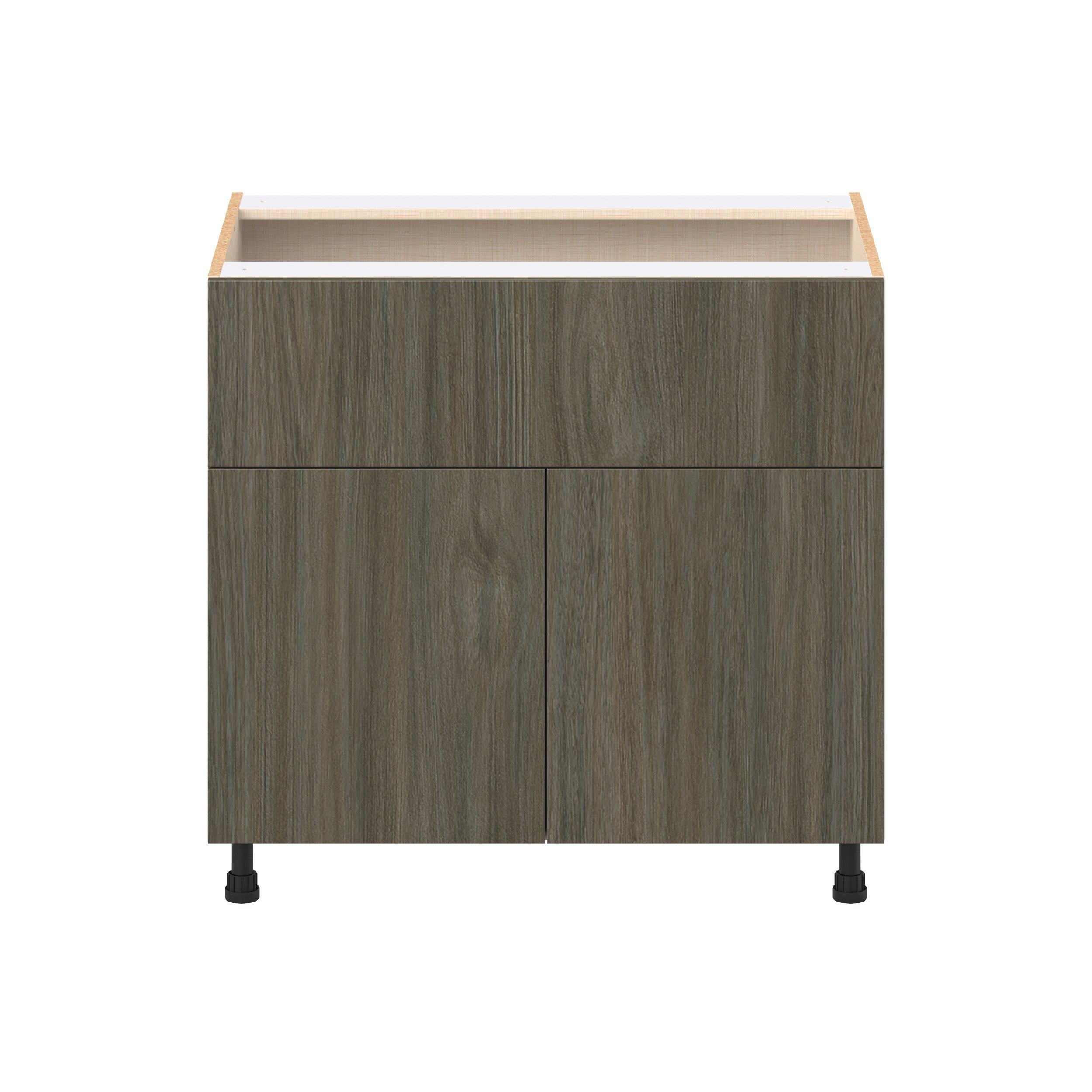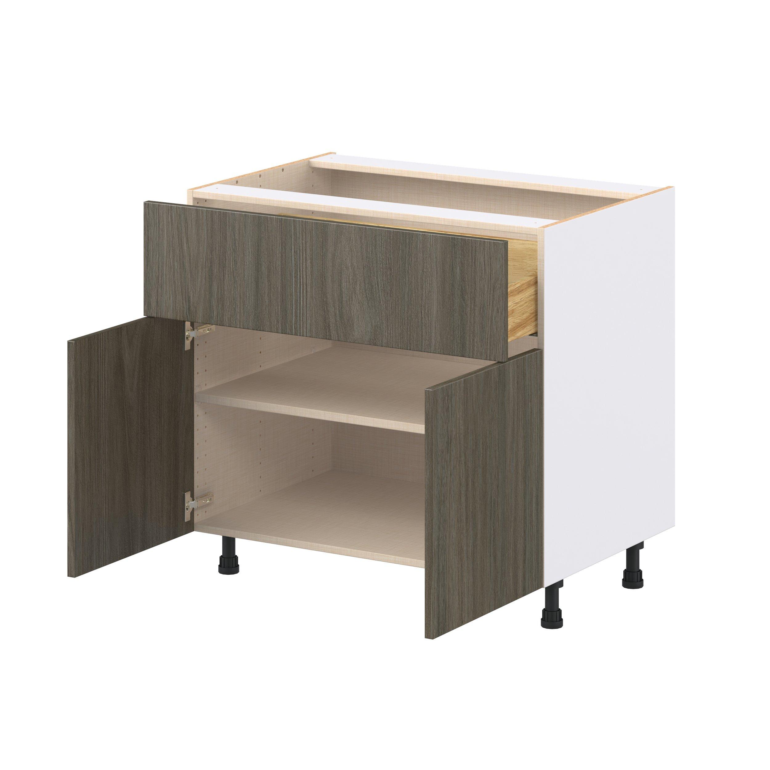 Elevate your project with the contemporary charm of Glenwood slab-style cabinets. Available in desert Mojavi oak and rich burnt walnut finishes, this collection captures the warmth and beauty of natural wood with the practicality of textured melamine. Crafted from one-piece MDF Studio Design Collection Glenwood 36 in. Burnt Walnut Door and Drawer Base Cabinet is designed to resist hairline cracks while the easy-to-clean finish stands up to stains and moisture. Featuring 5-piece doors and dovetail drawer joints, these cabinets offer durability and elegance. This collection combines style with everyday storage solutions.