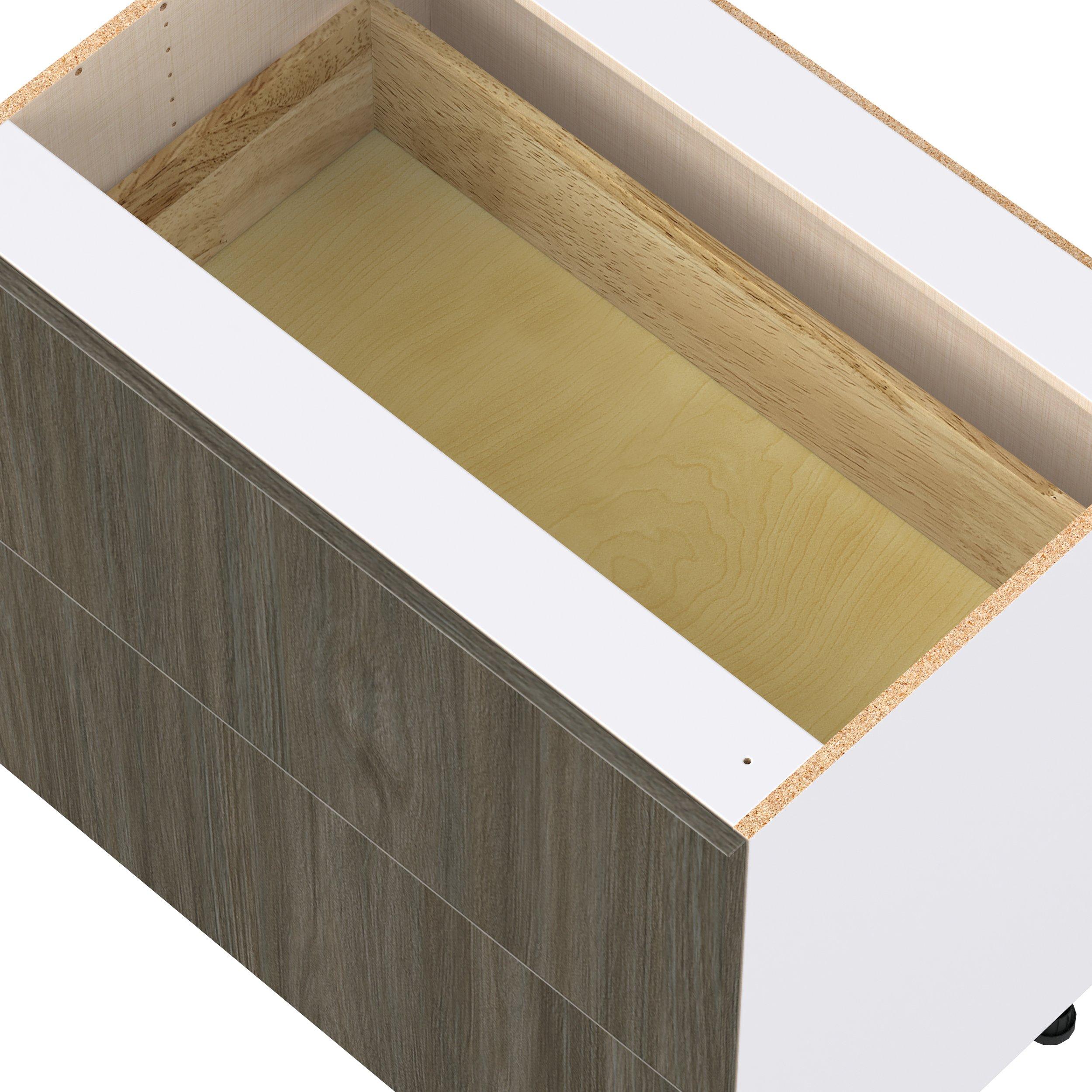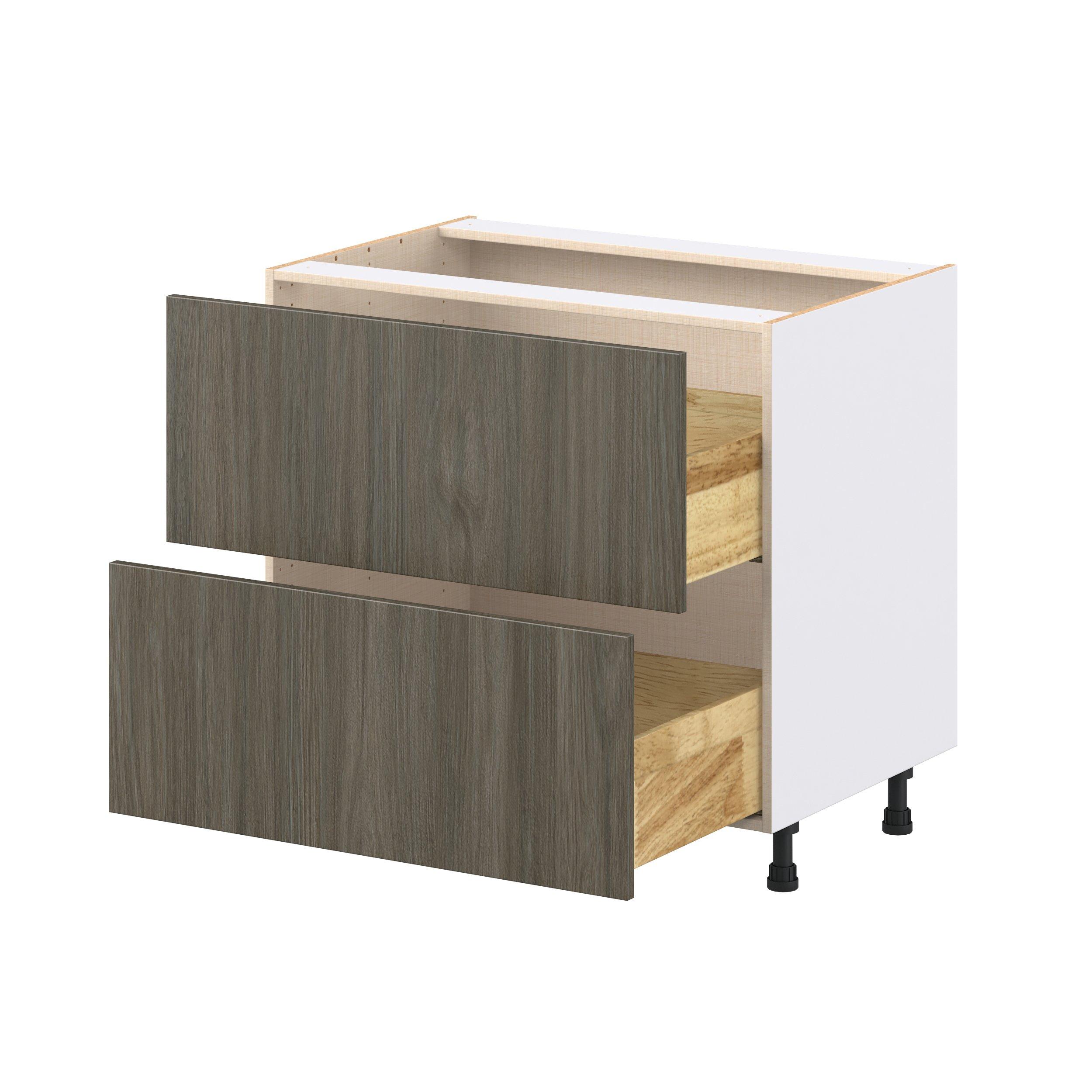 Elevate your project with the contemporary charm of Glenwood slab-style cabinets. Available in desert Mojavi oak and rich burnt walnut finishes, this collection captures the warmth and beauty of natural wood with the practicality of textured melamine. Crafted from one-piece MDF Studio Design Collection Glenwood 36 in. Burnt Walnut Drawer Base Cabinet is designed to resist hairline cracks while the easy-to-clean finish stands up to stains and moisture. Featuring 5-piece doors and dovetail drawer joints, these cabinets offer durability and elegance. This collection combines style with everyday storage solutions.