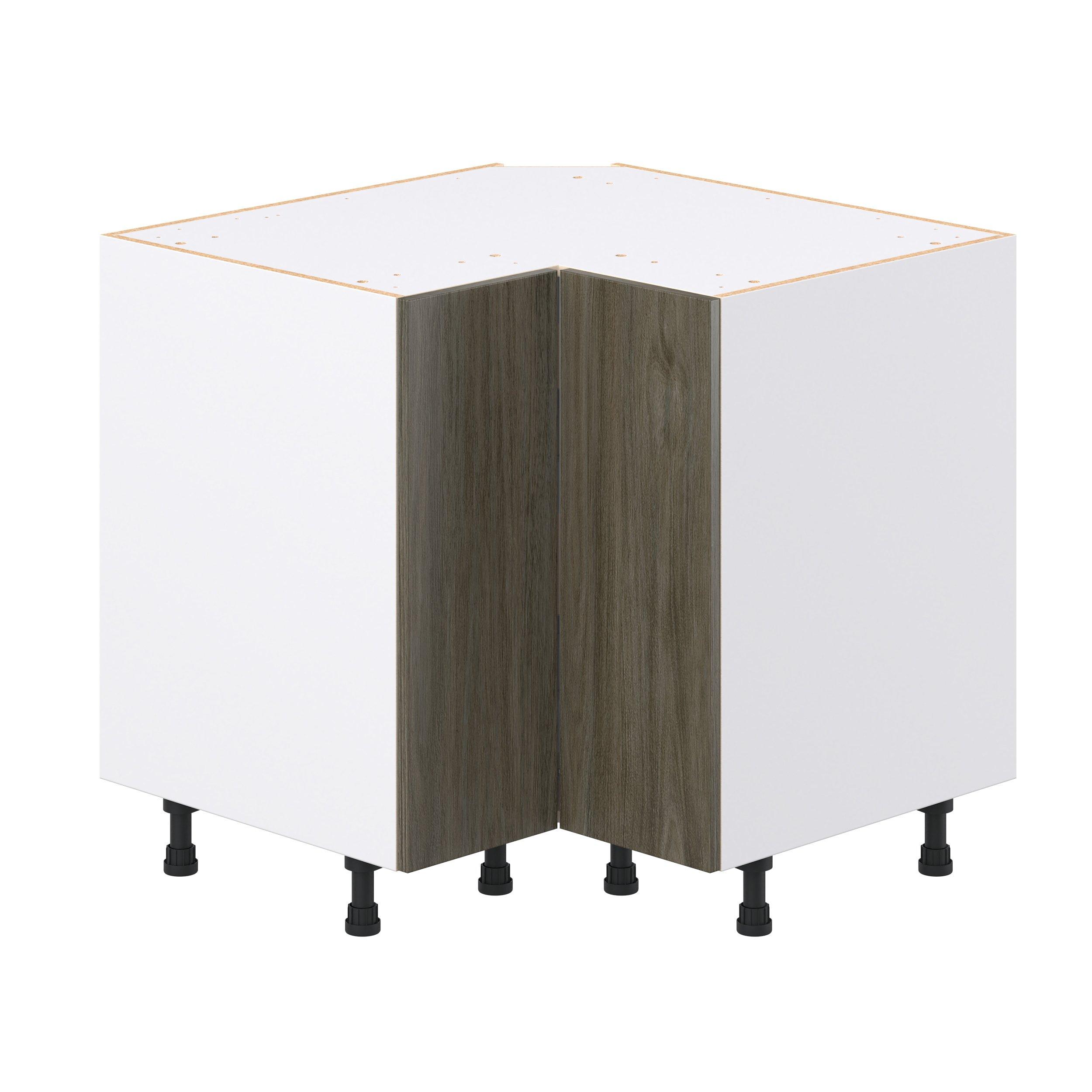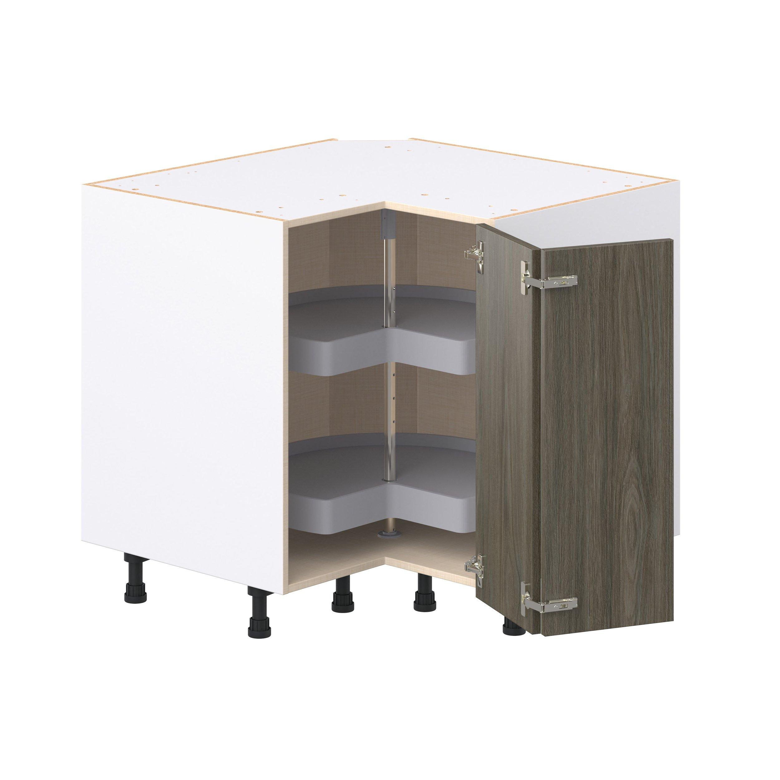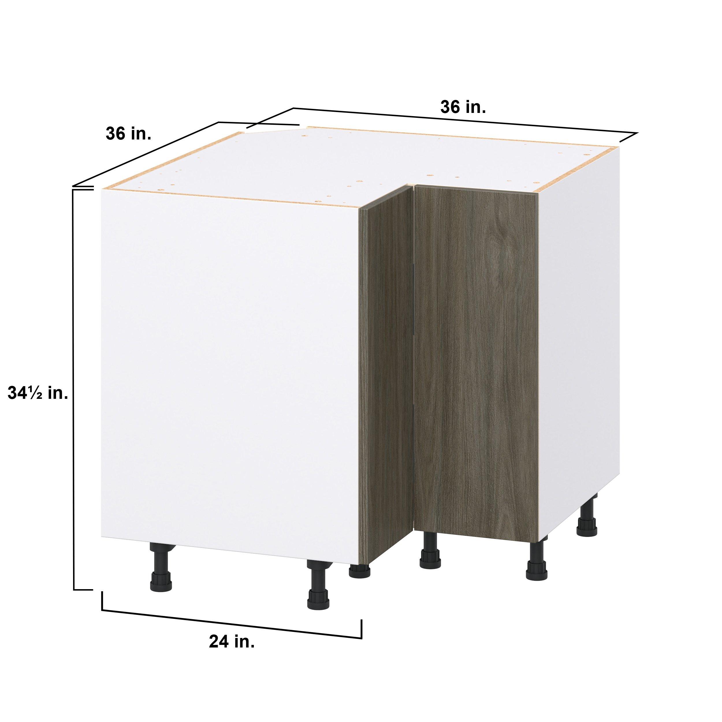 Elevate your project with the contemporary charm of Glenwood slab-style cabinets. Available in desert Mojavi oak and rich burnt walnut finishes, this collection captures the warmth and beauty of natural wood with the practicality of textured melamine. Crafted from one-piece MDF Studio Design Collection Glenwood 36 in. Burnt Walnut Lazy Susan Corner Base Cabinet is designed to resist hairline cracks while the easy-to-clean finish stands up to stains and moisture. Featuring 5-piece doors and dovetail drawer joints, these cabinets offer durability and elegance. This collection combines style with everyday storage solutions.